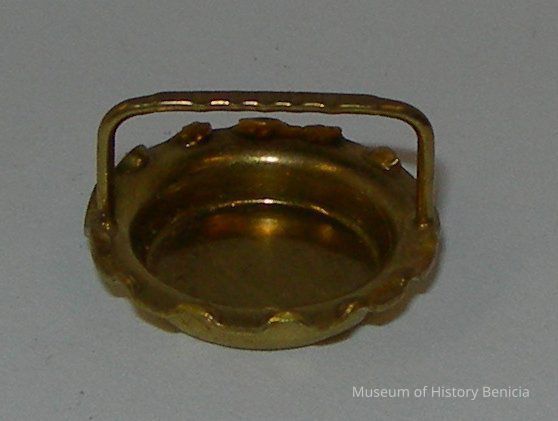Small, gold-colored, serving tray with loop handle and fluted edge; initials T.E. on bottom