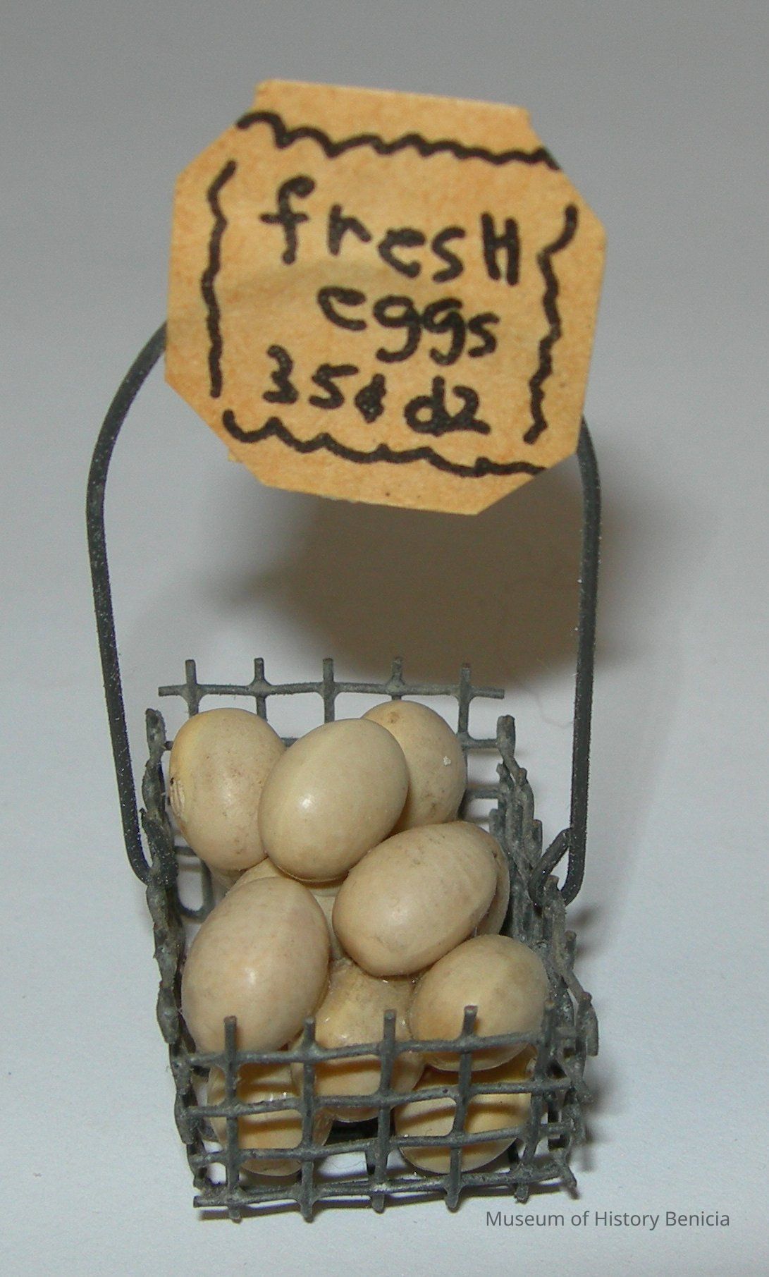 Small wire basket of eggs with handle; sign on handle: "fresh eggs 35 cents dz.