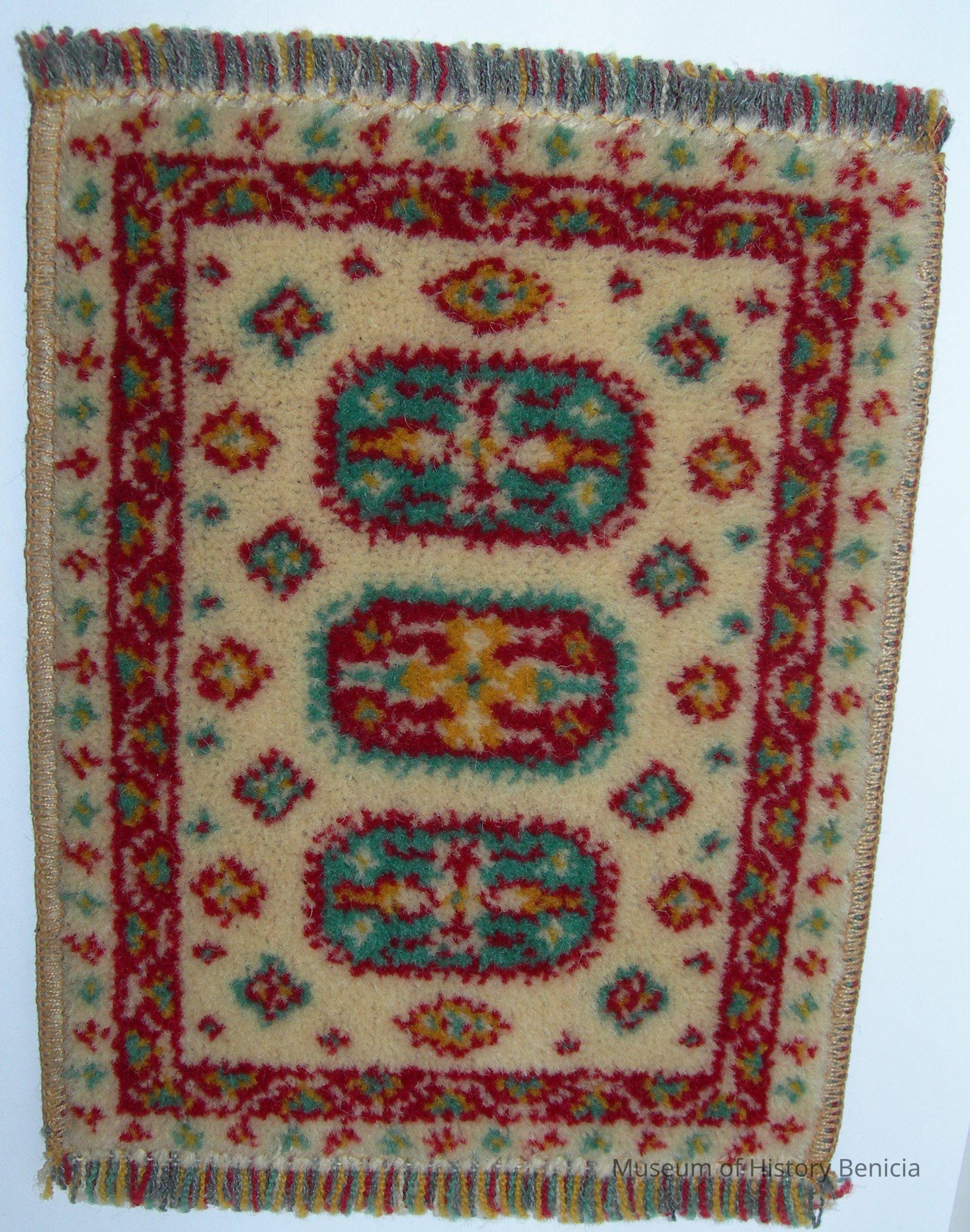 Area Rug, accessory for Dollhouse; fringed 100% wool made in Austria Beige with maroon and teal in design price tag on back: $10.00