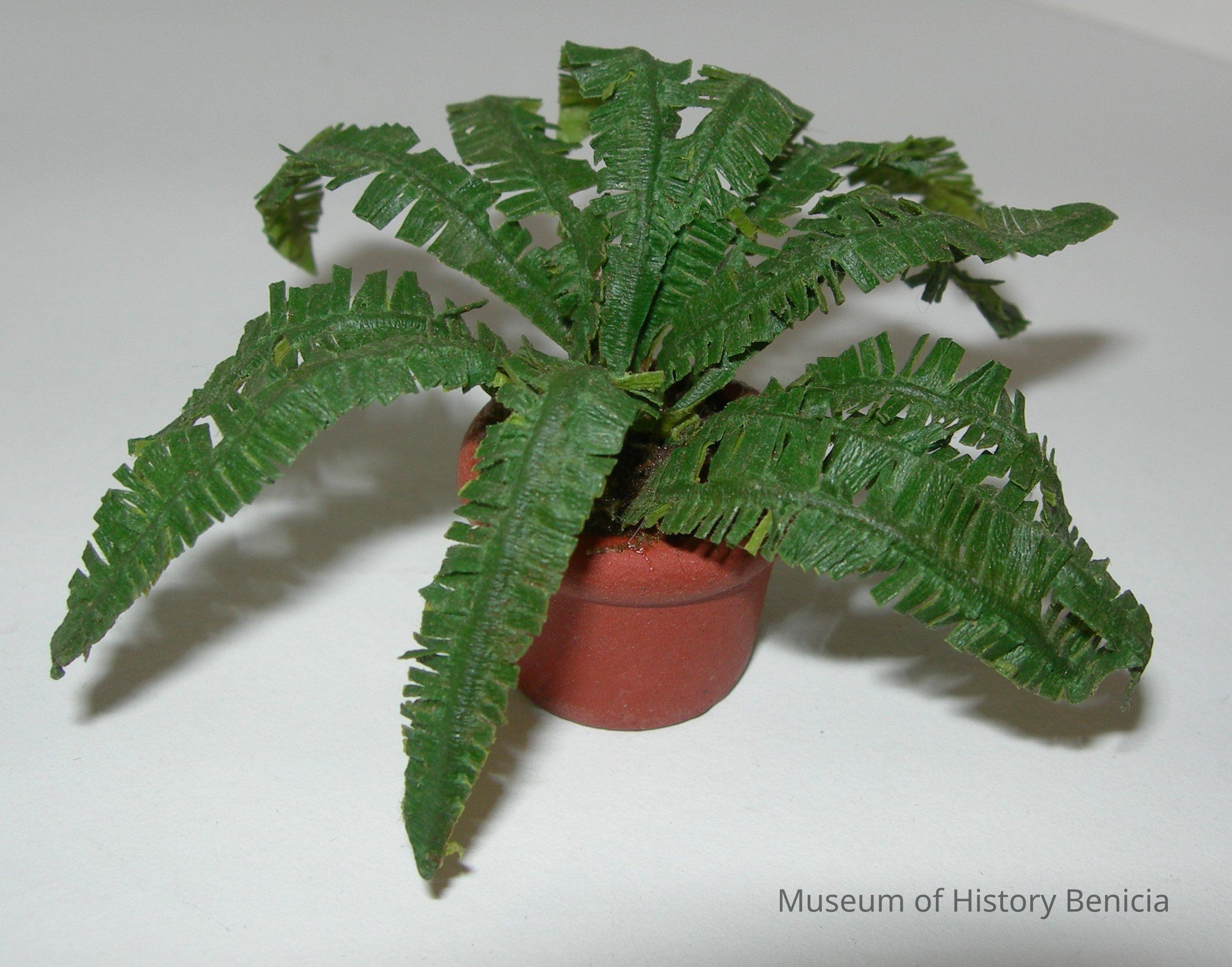 Plant - fern in a terracotta pot; basically round in shape has doily with it in storage