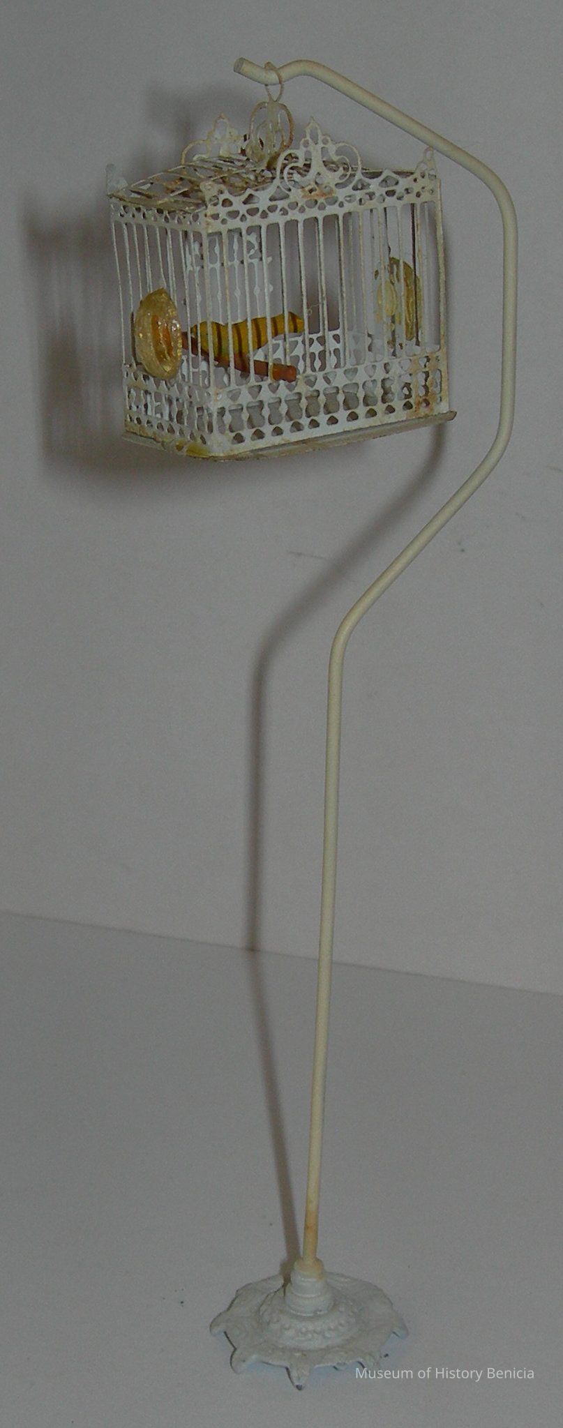 White metal bird cage with yellow canary inside; has seed and water holders on opposite ends goes with holder BHM2013.8.77b