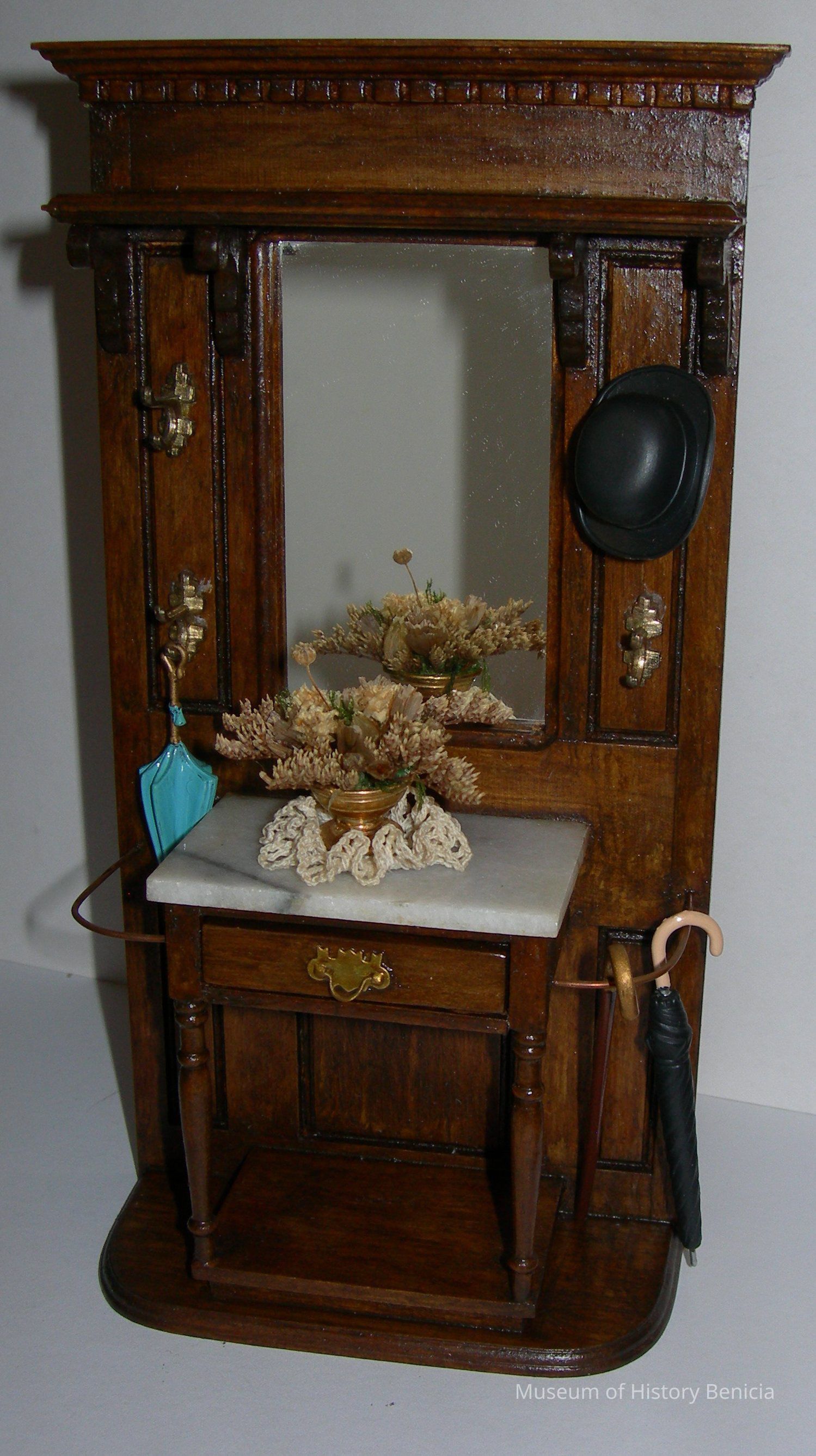 Brown wooden hallway mirror/hat rack/umbrella stand; has faux marble table top with drawer that opens, there are four hook (two on each side of the mirror and a shelf above; accessories: bowl of dried flowers on a doily on the table, one black derby hat, one blue umbrella, one black umbrella, one brown cane with curved gold handleCollection
