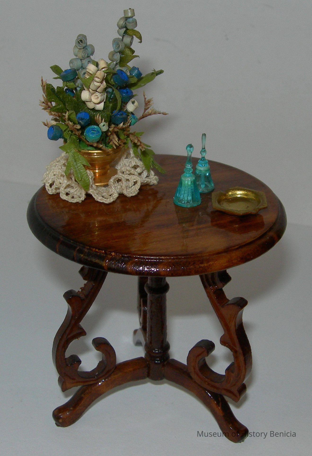 accessories on the table include a metal bowl of flowers on a crochet doily, two glass bells and a metal ash tray