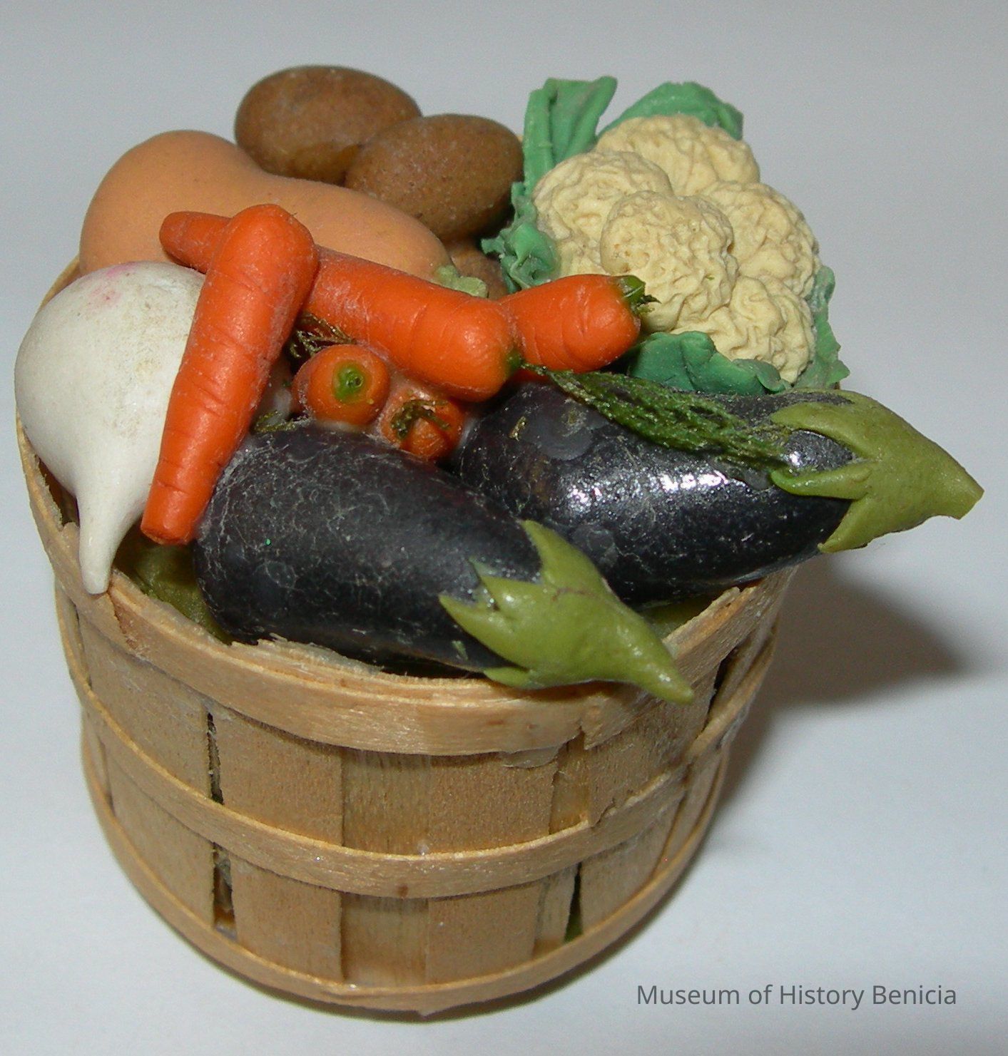 Bushelbasket of vegetables (cauliflower, potatoes, squash, carrots, eggplant) on bottom: "King's Harvest" and "Betty Martin" price tag: 16.95