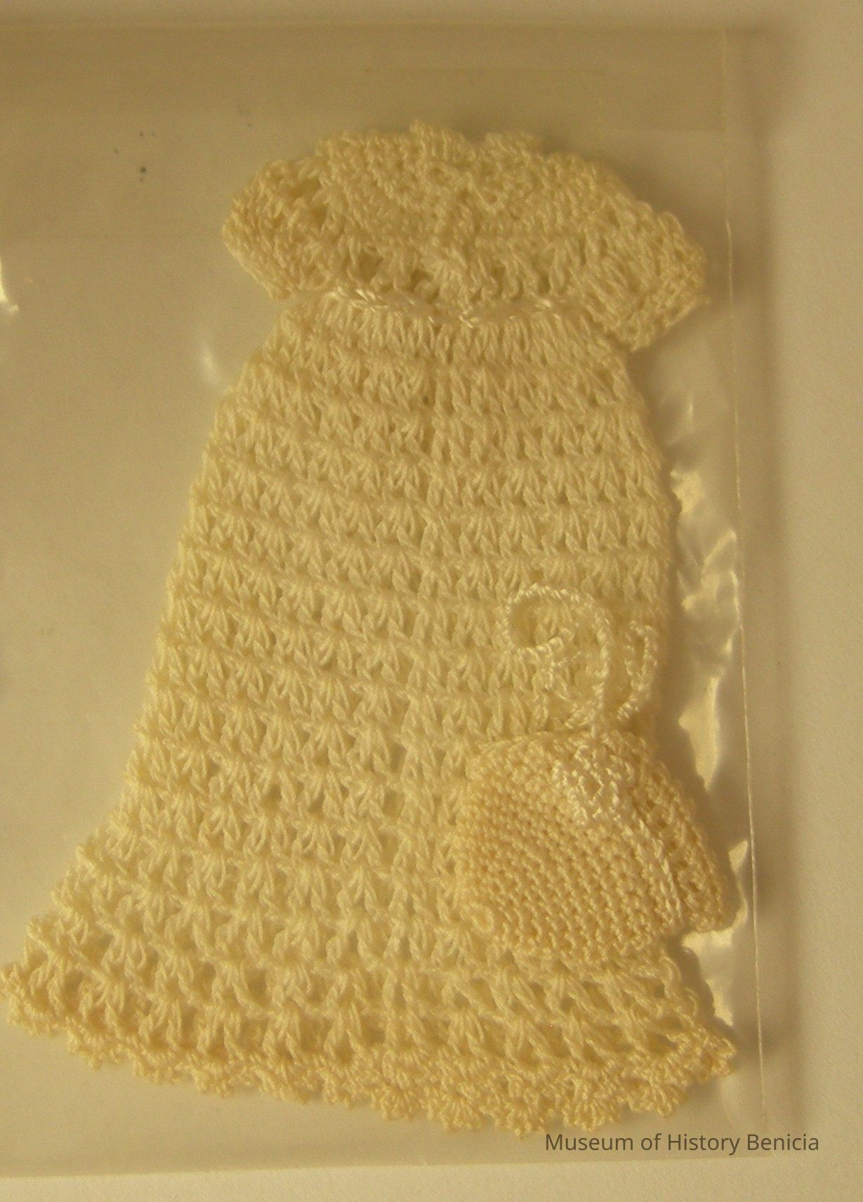 BHM2012.008.0095a - Child's crochet cap w/tie string, matches gown - 3/4" x 3/4"