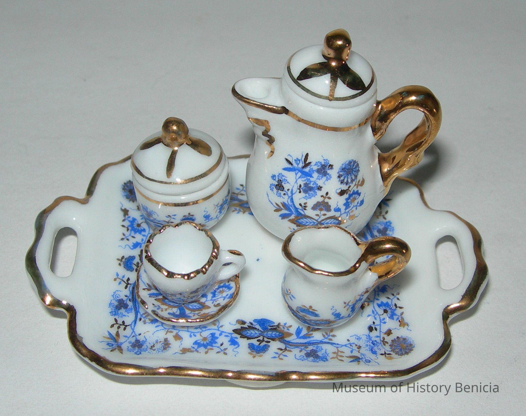 China Gold and Blue Onion Tea Set - five pieces attached to a tray (six pieces total): teapot, sugar bowl, creamer, cup and saucer