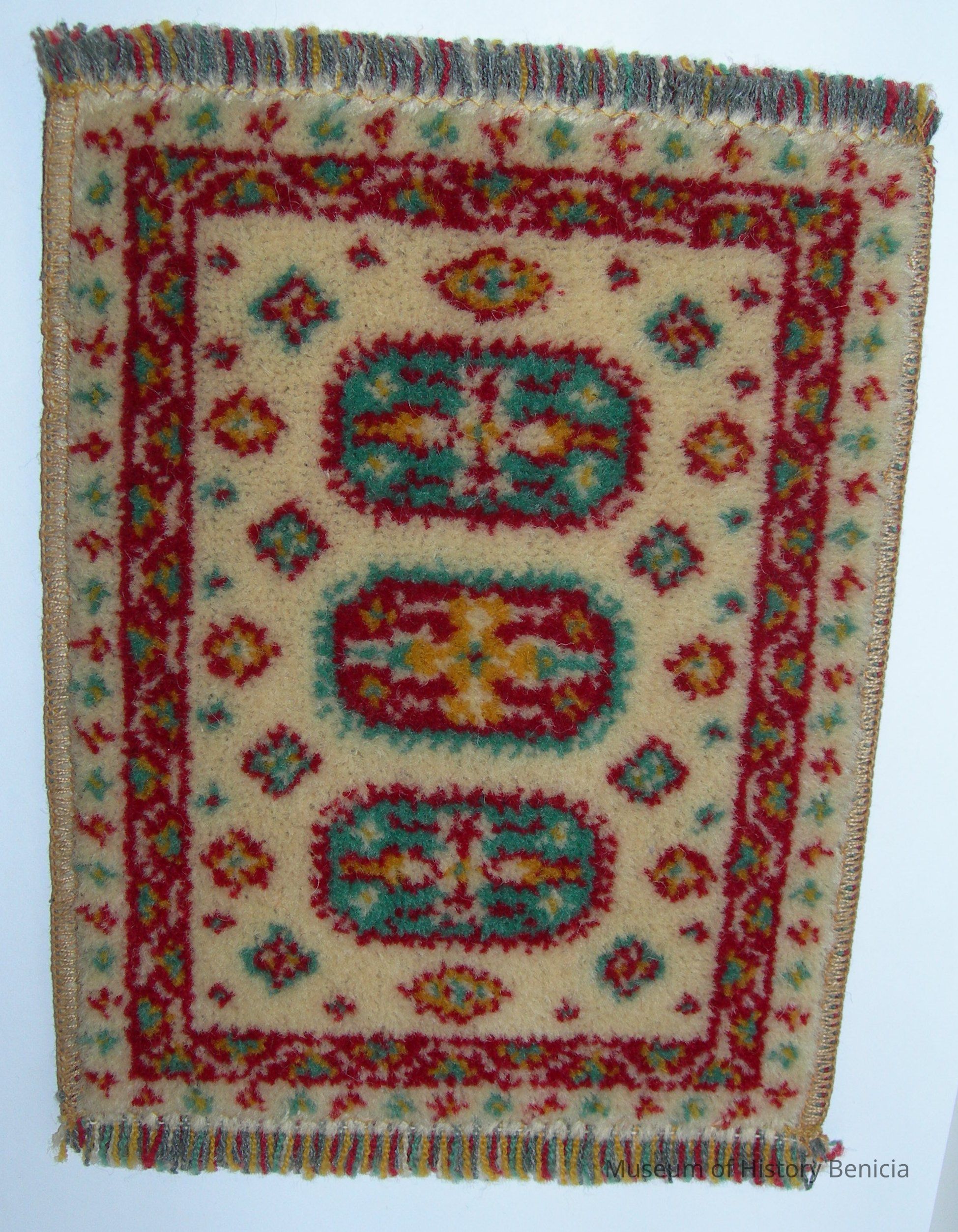 Area Rug, accessory for Dollhouse; fringed 100% wool made in Austria Beige with maroon and teal in design price tag on back: $10.00