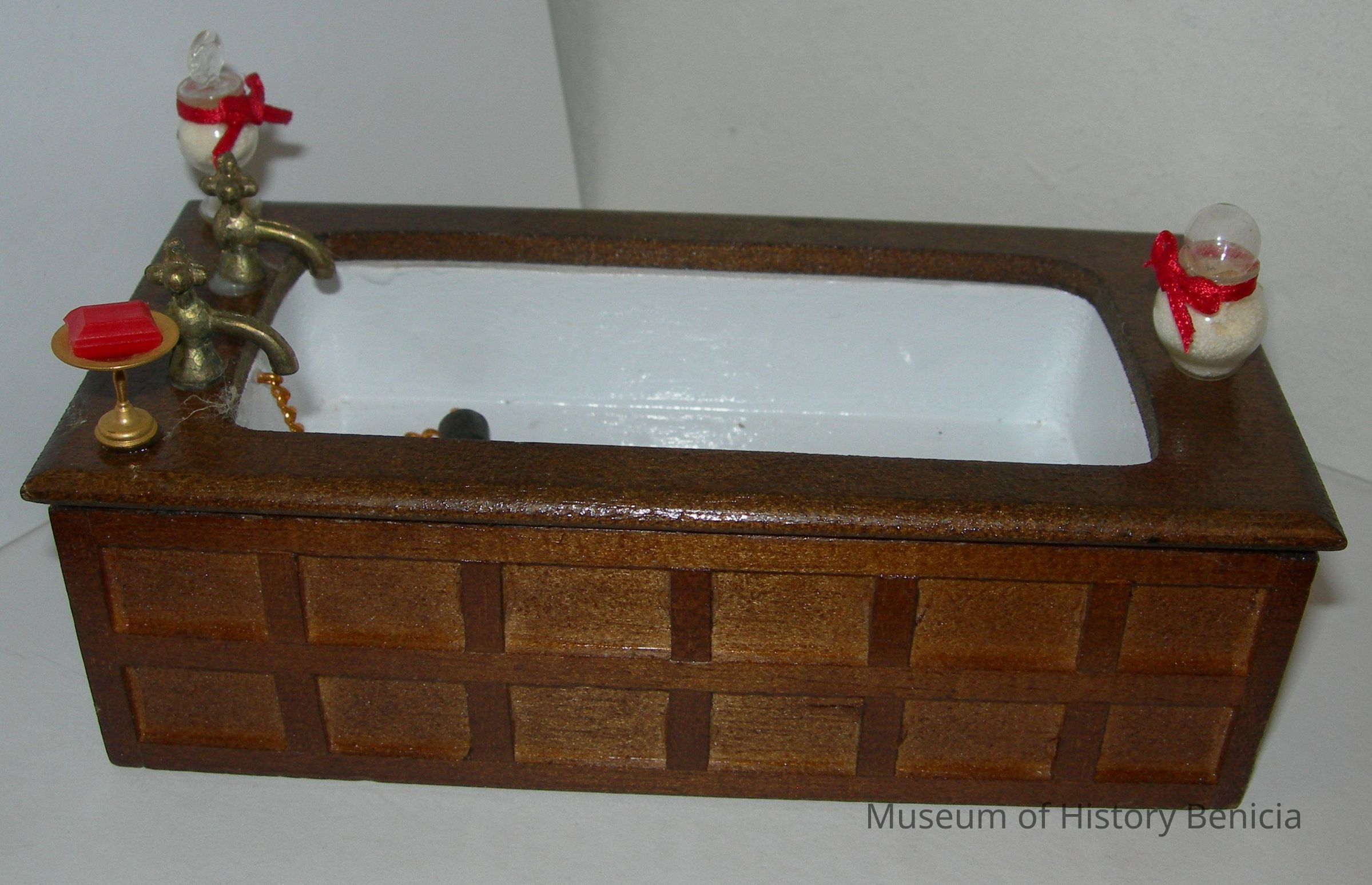 Resin bathtub, white, with brown wooden surround; has plug on a chair; double faucets (hot and cold) and three accessories: to jars of bath salts with red ribbons around the jars and a soap dish with a red bar of soap