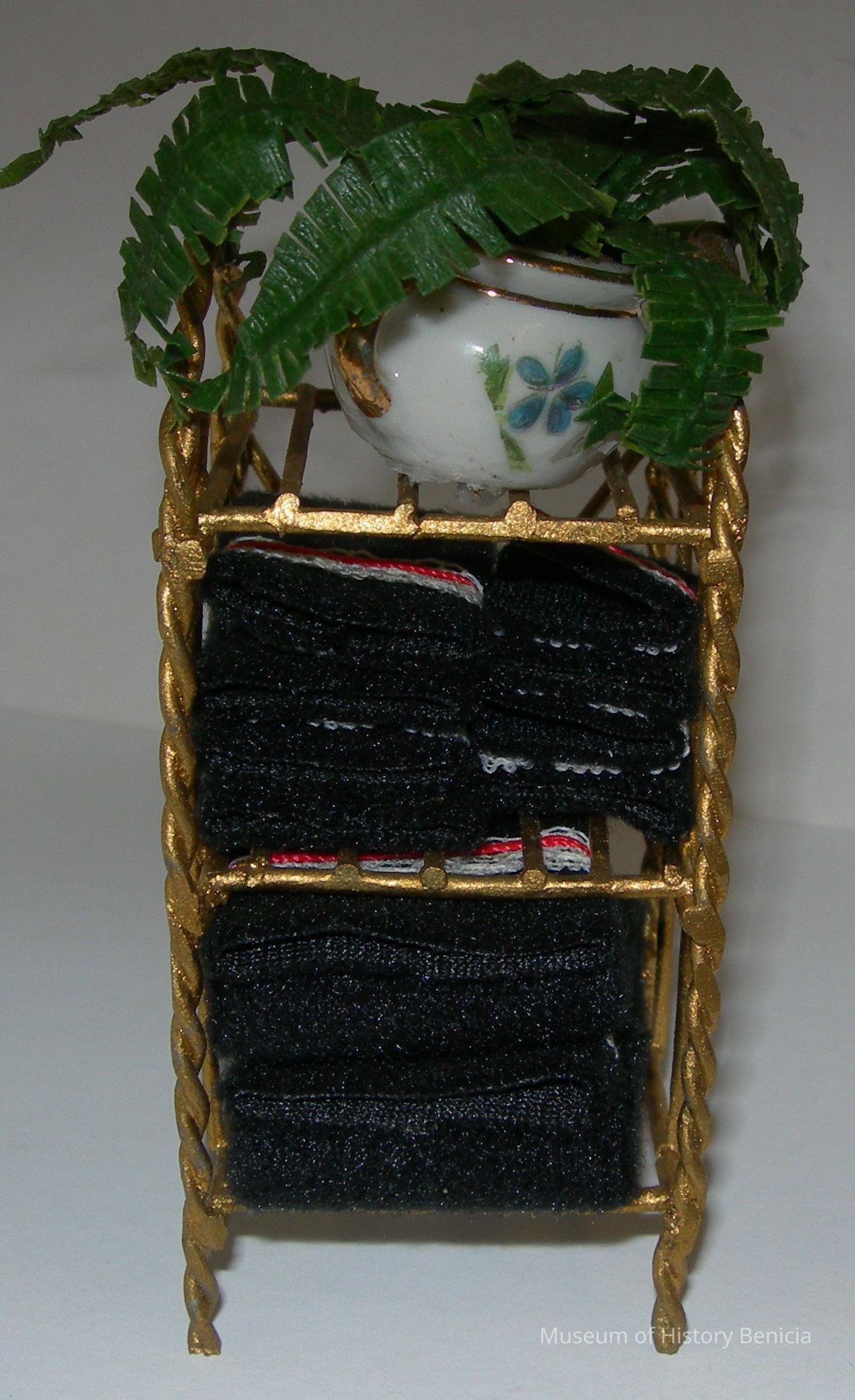 Metal towel shelves, gold color; with two wash cloths and two hand towels on the upper shelf and two bath towels on the lower shelf; all towels are black with white lace and red ribbon trim;