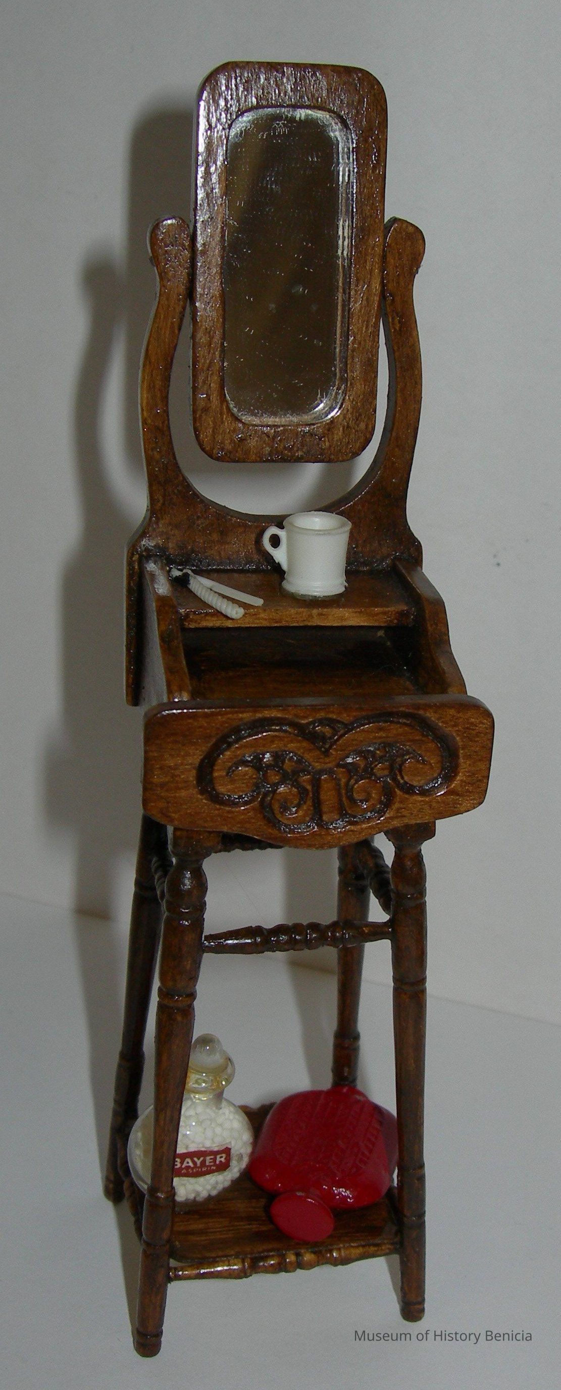 Wooden shaving stand; has a mirror which tilts two upper shelves and one lower shelf;
