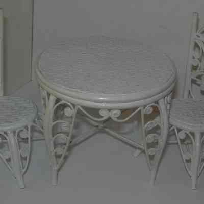 Wicker/Rattan-look chair with scroll work on legs and back and a round seat - white goes with table 2013.8.13