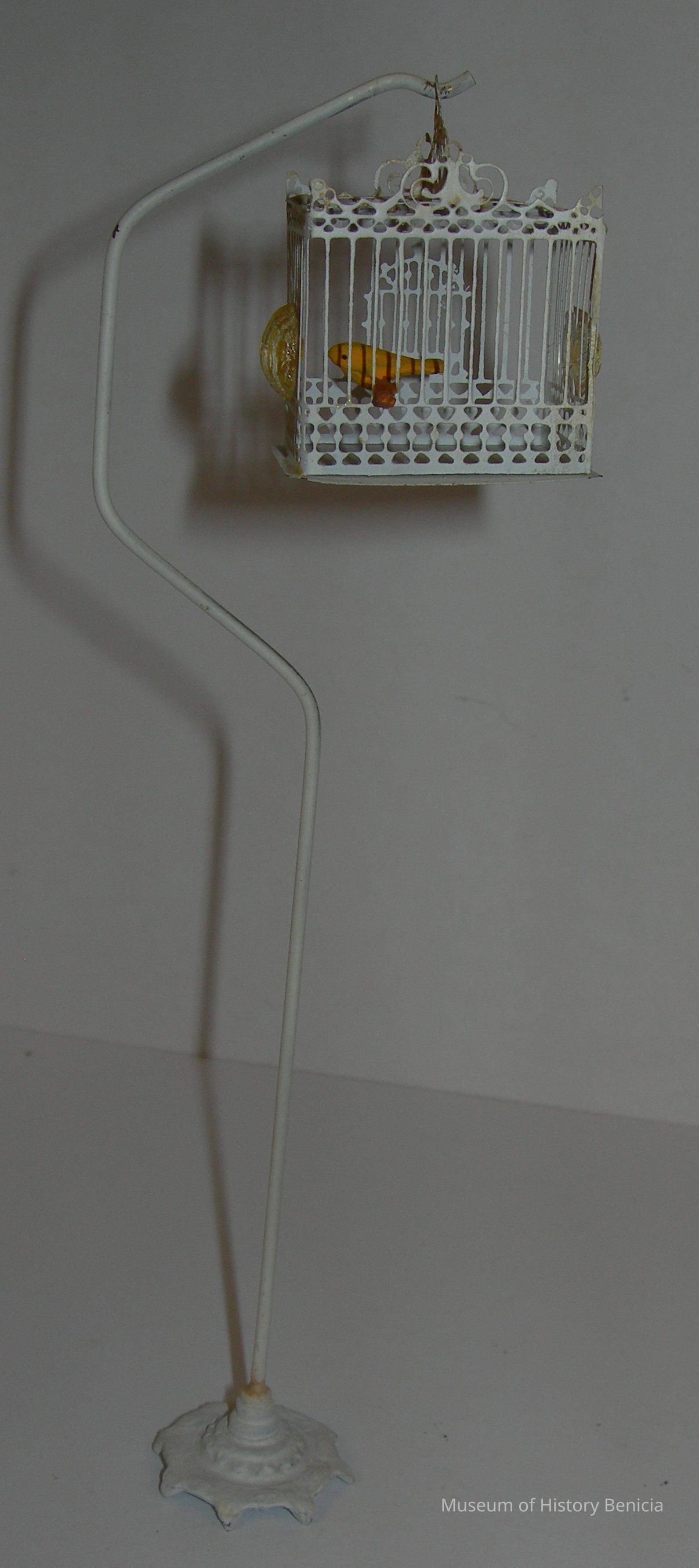 White metal bird cage with yellow canary inside; has seed and water holders on opposite ends goes with holder BHM2013.8.76b
