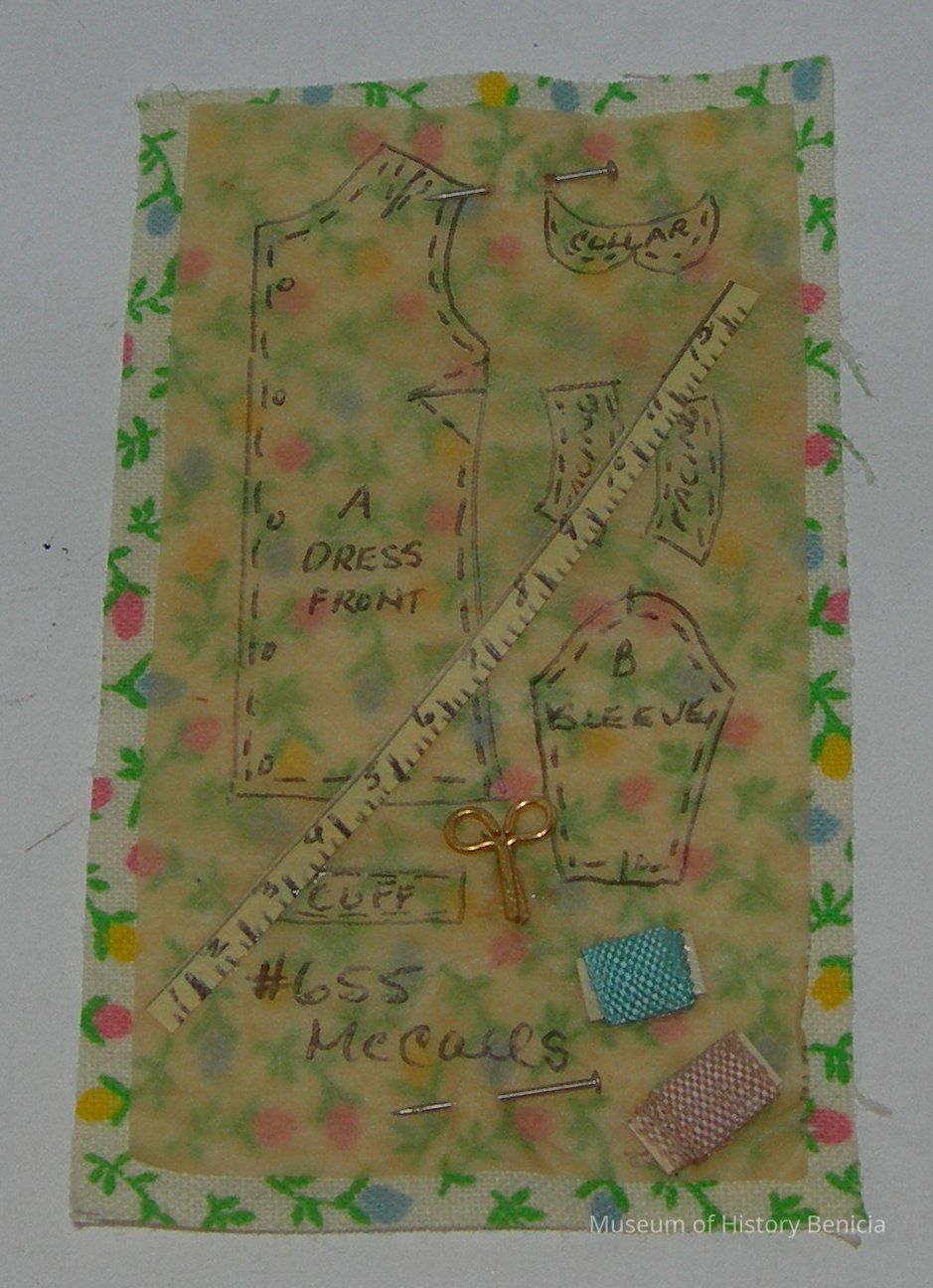 Sewing Project - piece of cloth with a tissue paper (blouse) pattern pinned in place (with two straight pins), ready to cut out; on top is a measuring tape, scissors, and two cards of bias tape; cloth is white with pink and yellow and blue flower pattternCollection