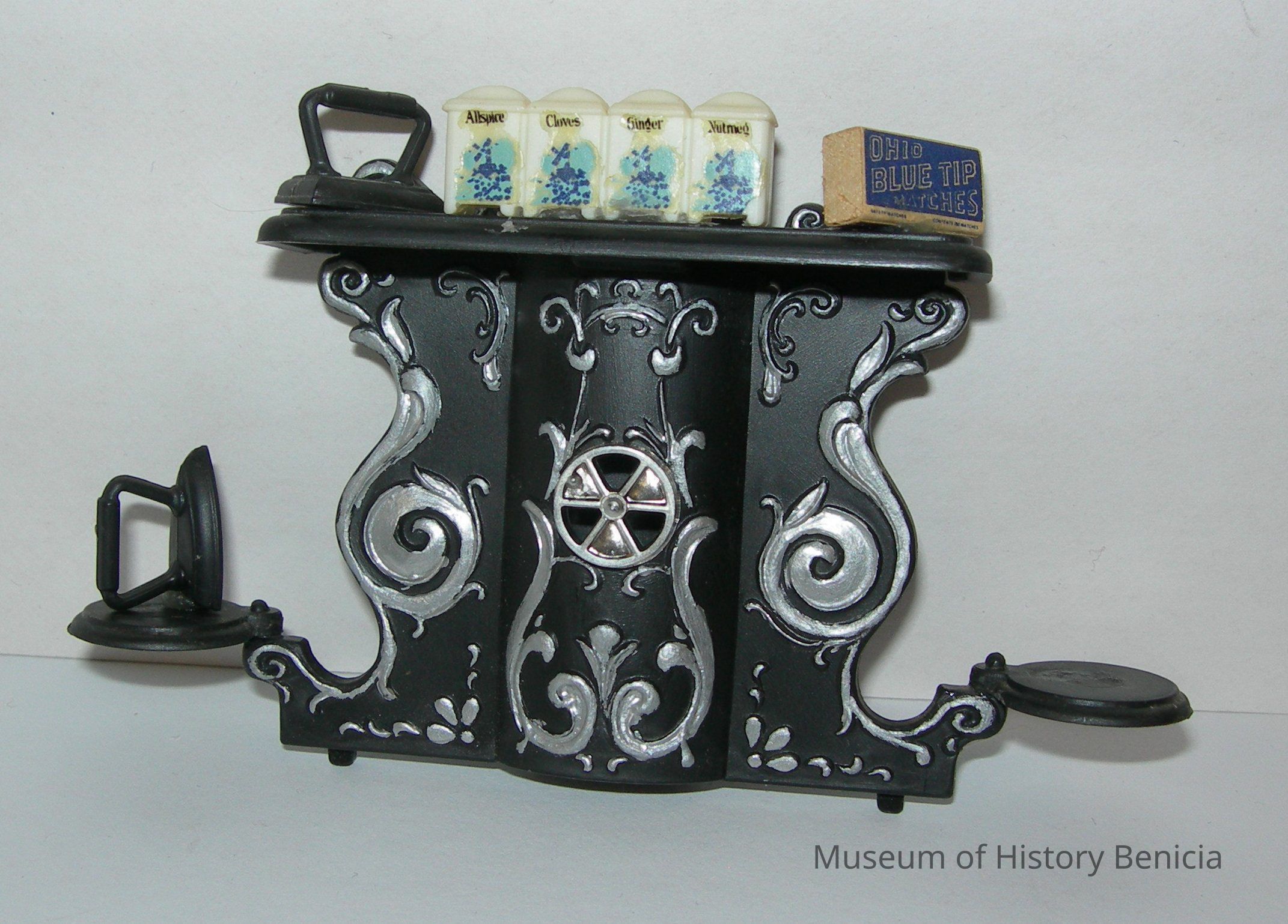 Upper section of wood burning stove - black and silver; has two irons, some seasoning shakers, and box of matches sitting on it
