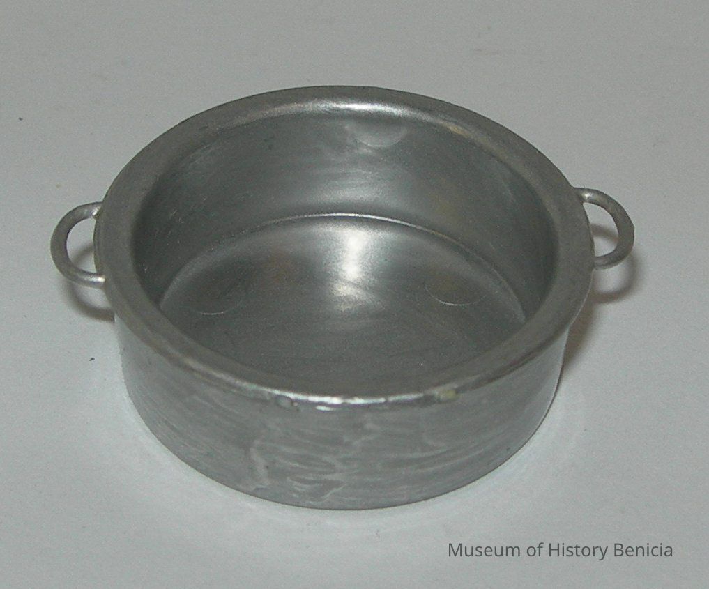 Round, silver pan with a handle on opposite sides