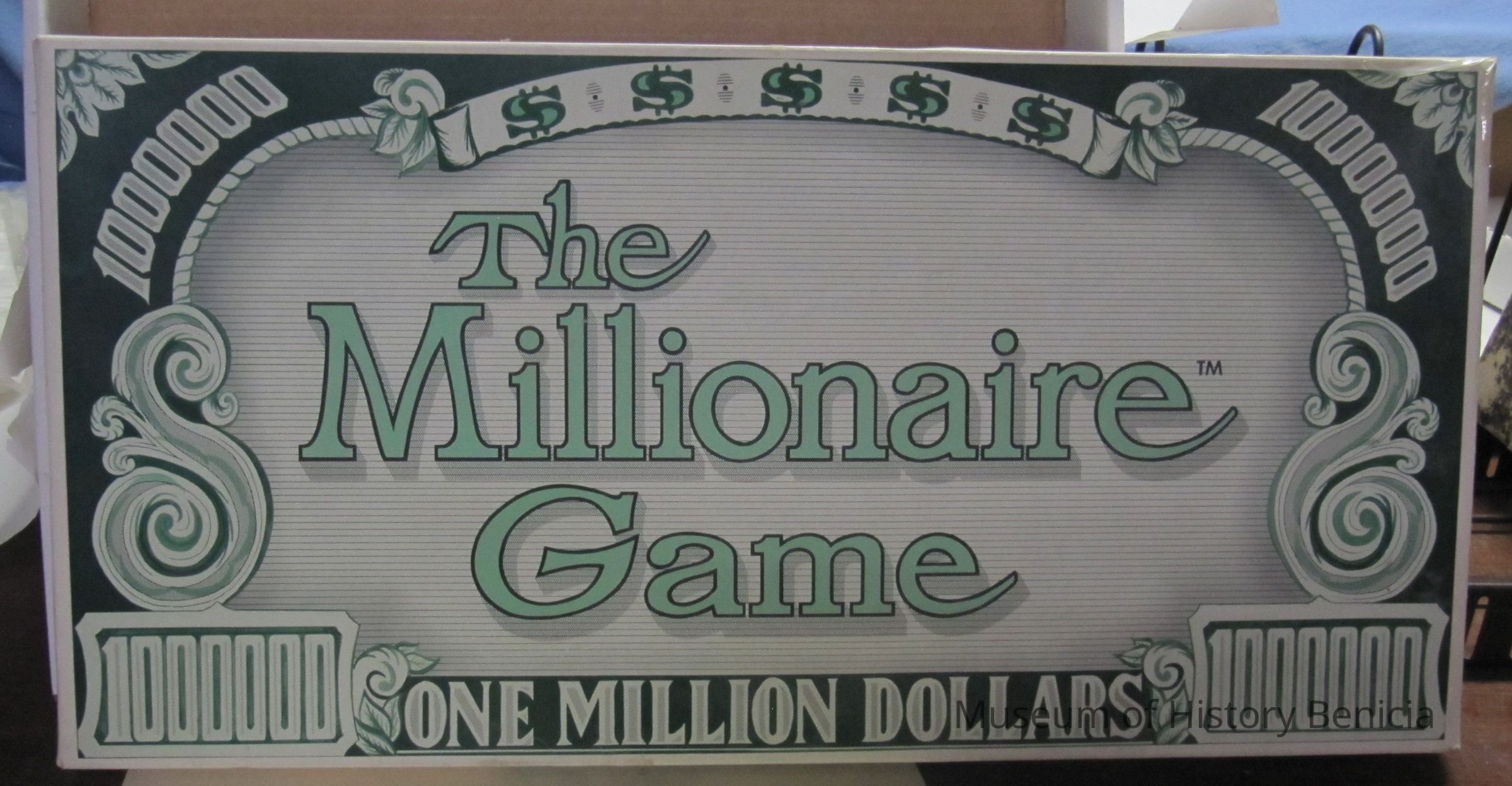 Board game called "The Millionaire Game" - special Benicia edition with names of Benicia businesses on game squares. Instructions have copyright date of 1984.