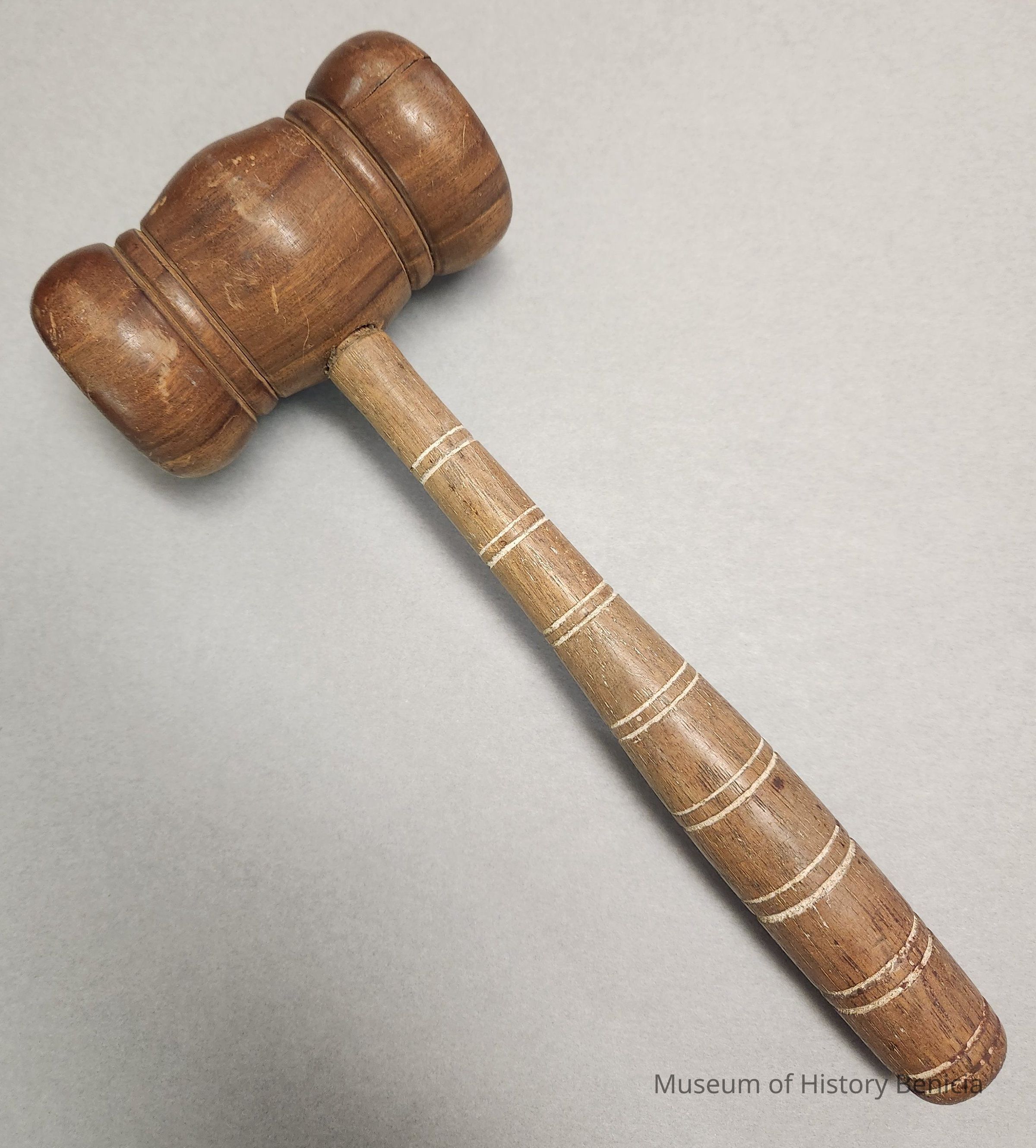 Wooden gavel made by the donor in the 1940's from wood from the Richmond-San Rafael Ferry. It has a cylindrical turned head; tapered turned handle of different wood; has eight sets of two rings cut in around it and filled with white paint or ink.