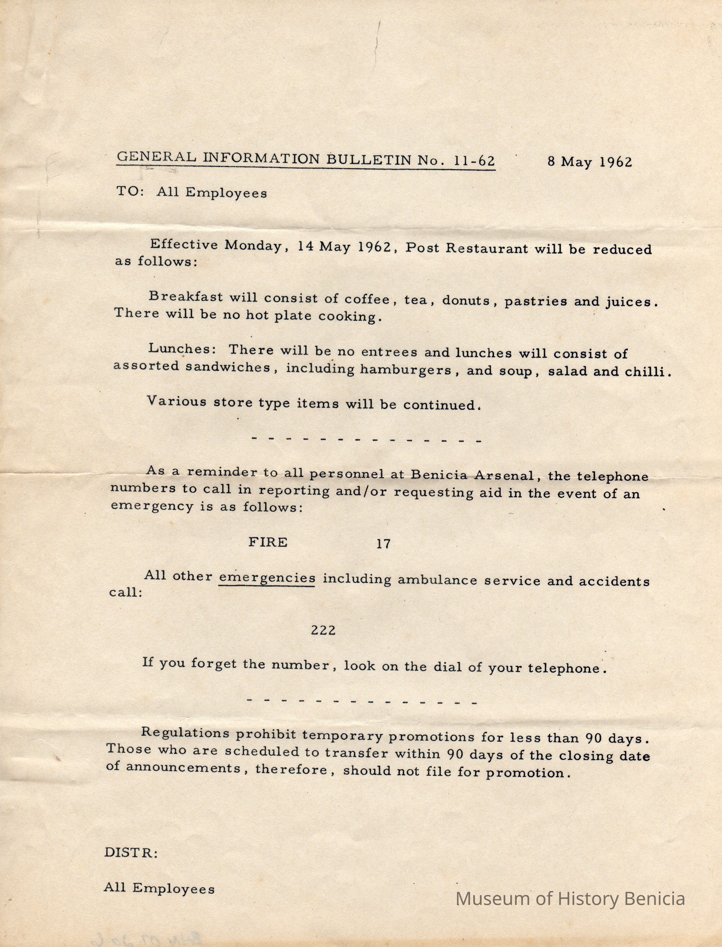 General information to all employees of the Arsenal regarding the Post Restaurant, emergency telephone call procedures in the event of a fire, and promotions.Collection