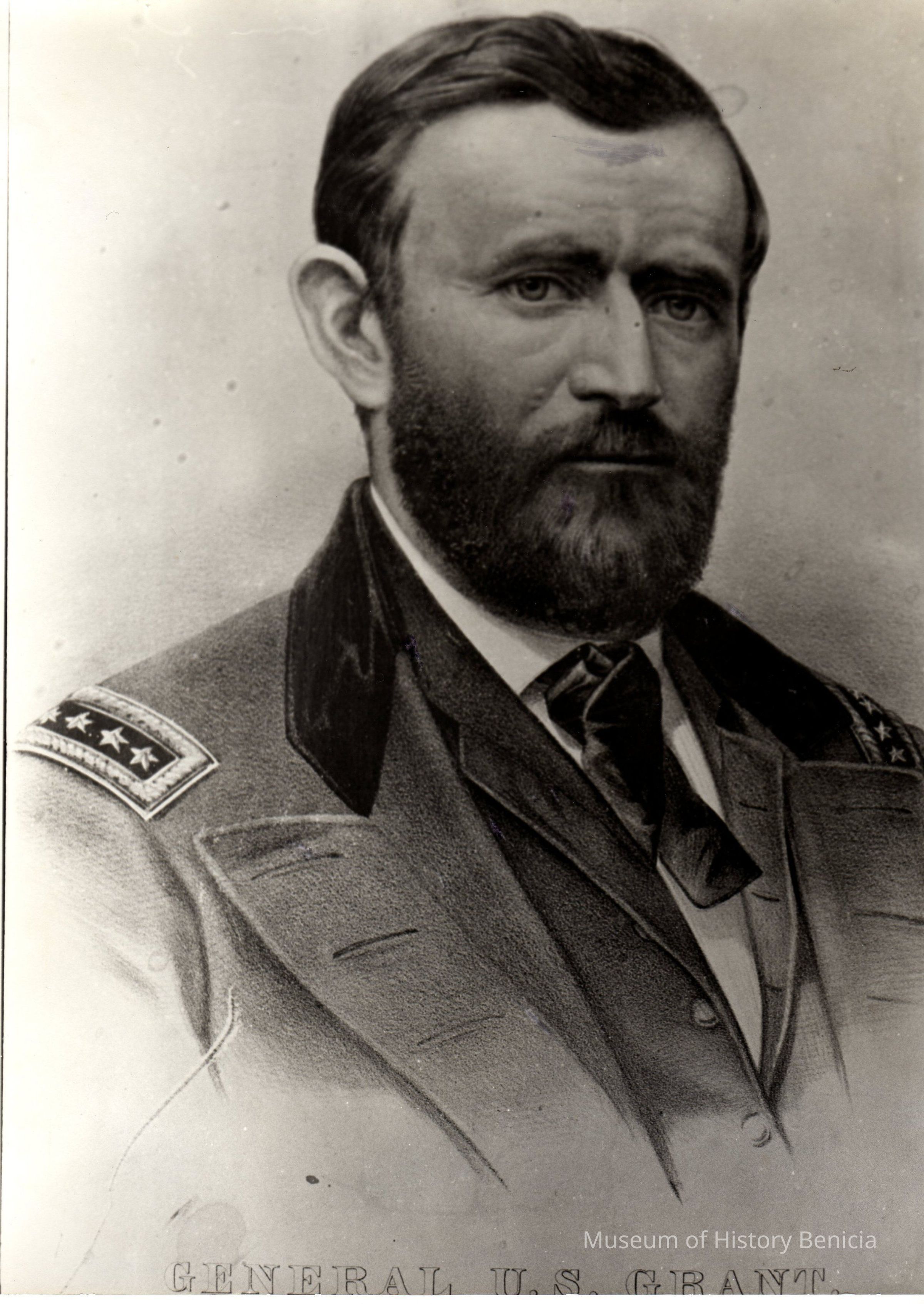 B/W photographic copy of an original lithograph by Currier & Ives of U.S. Grant when he ran for president and was elected in 1869. The lithograph is mounted on a rough board with tan-colored cloth border. This photo is a copy of the lithograph.Collection
