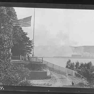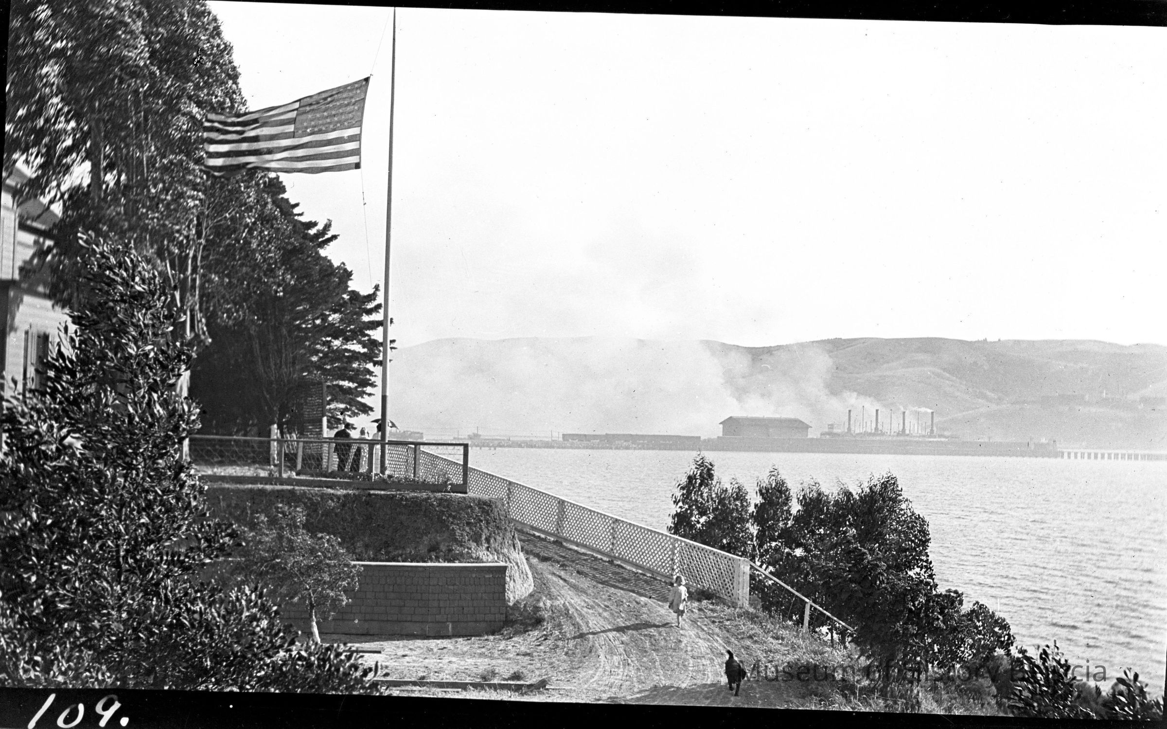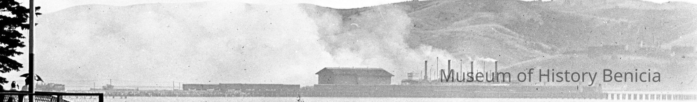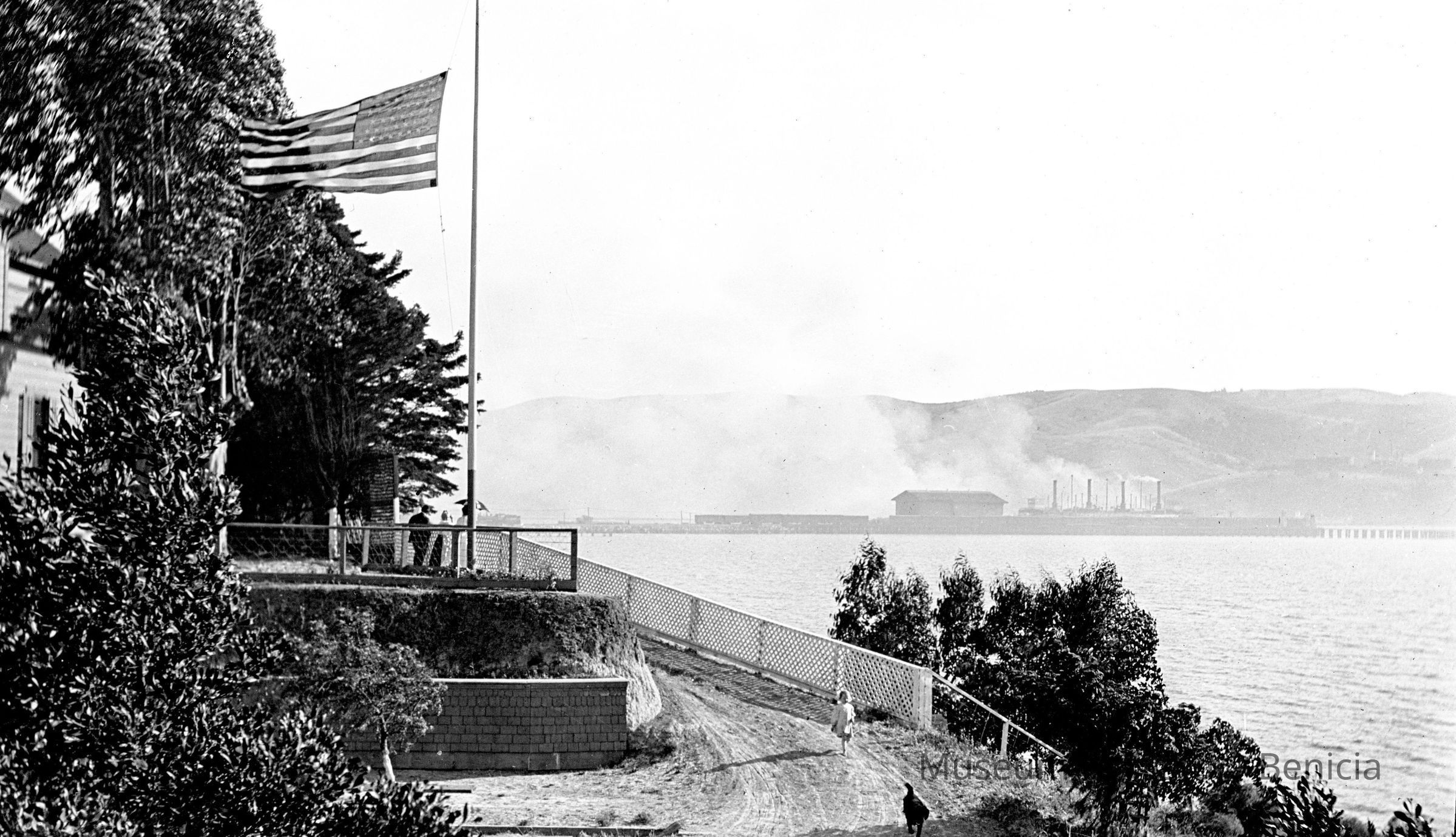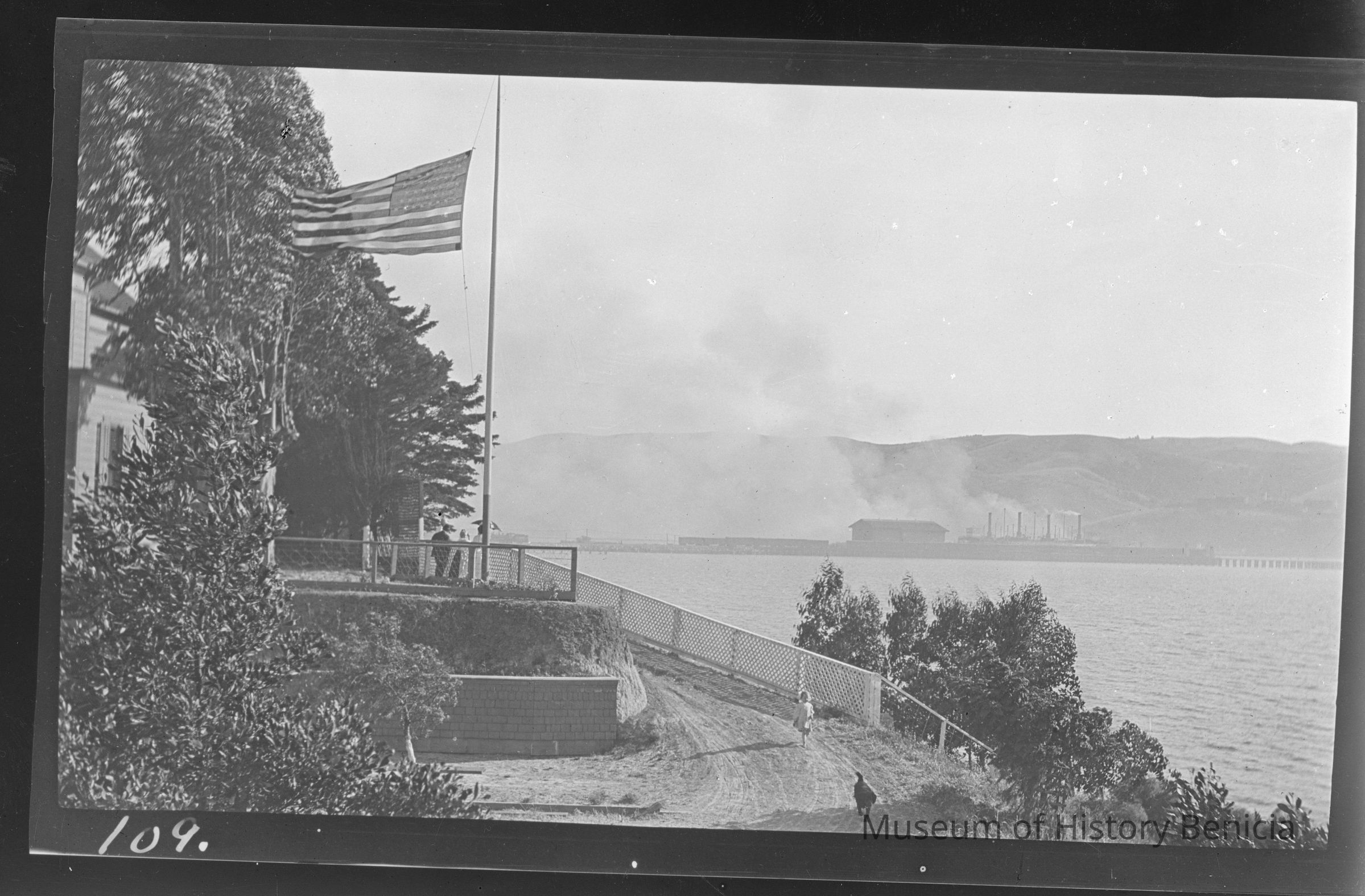The image is of a house and point of land overlooking the Carquinez Straits. There is a plant with steam boats pulled into their docks across the water. Not sure where this was taken. The note on the envelope says this is a copy of Petersen's. This is probably Otto C Petersen (1882 - 1950) who was an armature photographer in Benicia. He worked as a clerical at the Arsenal for a while around 1910.Photograph Details