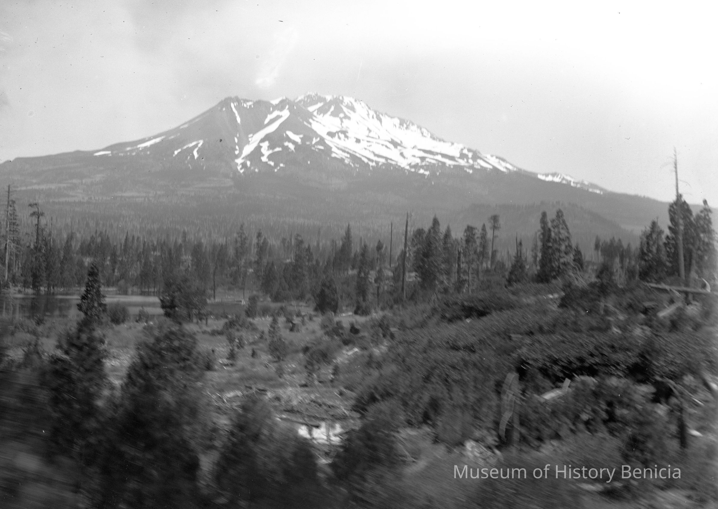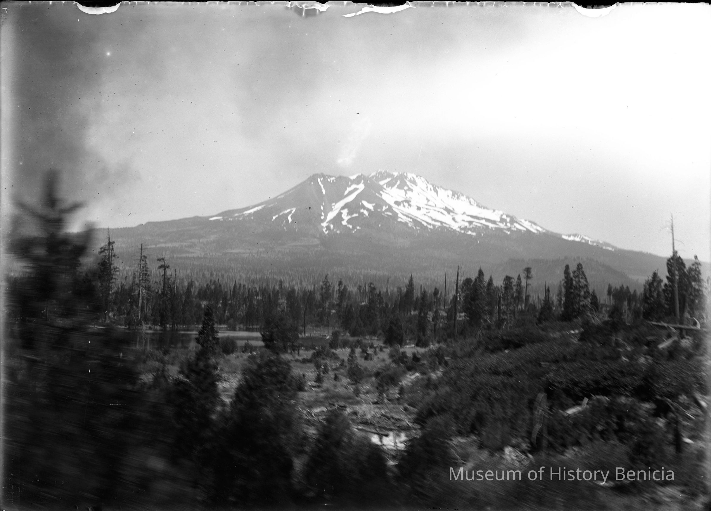 This is a glass plate negative, 5x7". It was used by Frank J. Stumm in his postcard business. This image was probably taken by Mr. Stumm circa 1908 - 1912. The image is of Mt. Shasta.