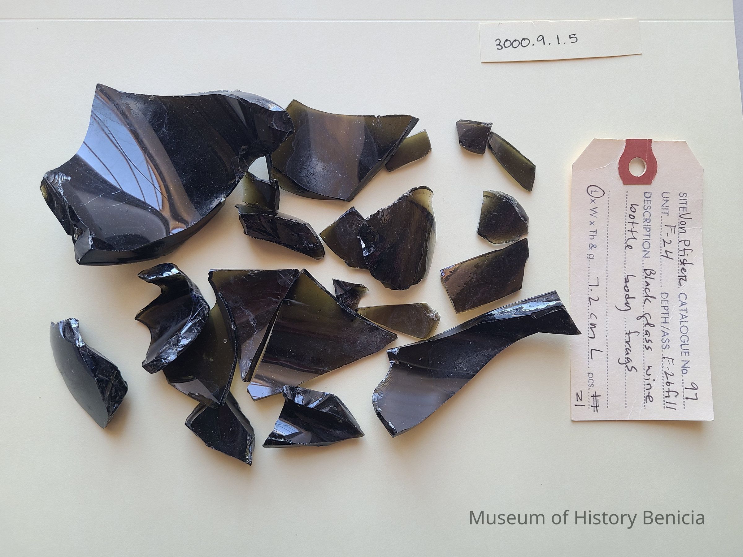 Twenty one dark olive glass shards