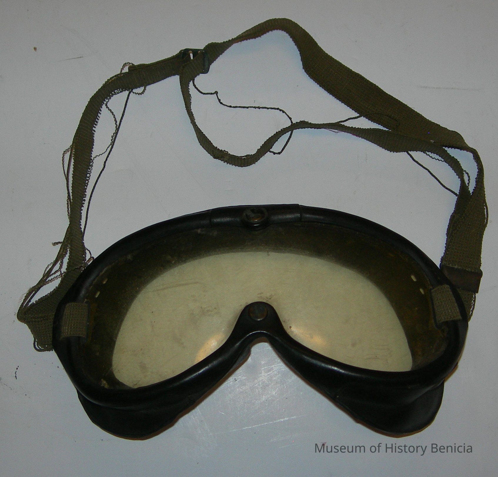 Goggles, Polaroid; black rubber; "goggle-1944" TM Reg. U.S. Pat Off. green woven strap; 8" x 3-1/4"