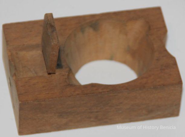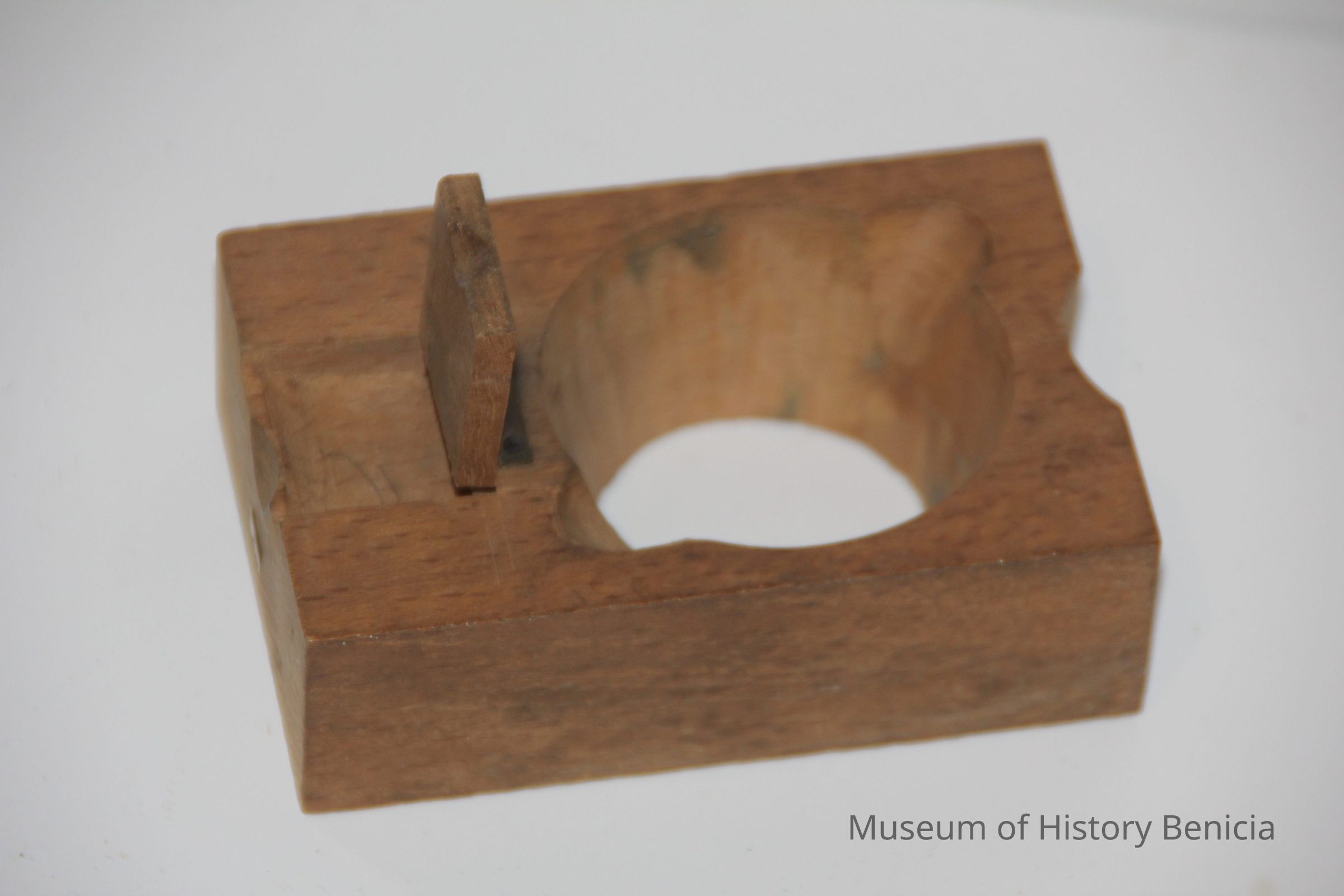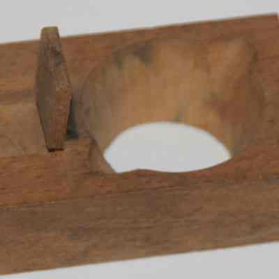 round wooden block with a hinged lift up piece and hole opening with two indentations.