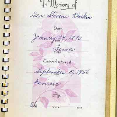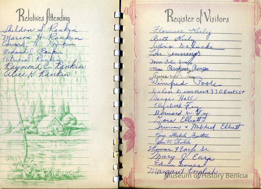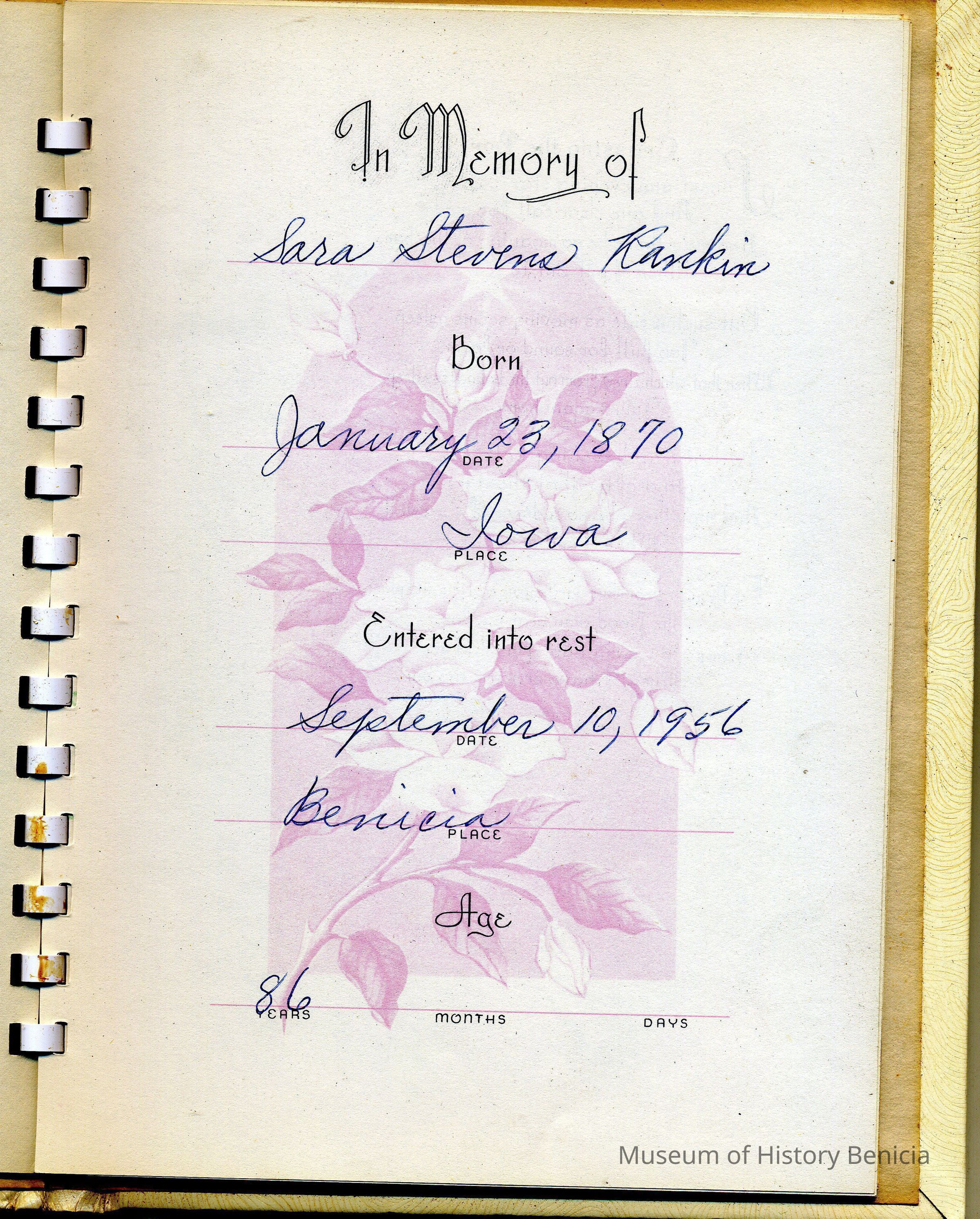 This is the memoriam book from the funeral of Sara Stevens Rankin (2nd wife of Walter Z. Rankin). She was born 01/23/1870 in Iowa and died 09/10/1956 in Benicia. The funeral was through the Passalacqua Funeral Home. Many of her relatives signed the book including: