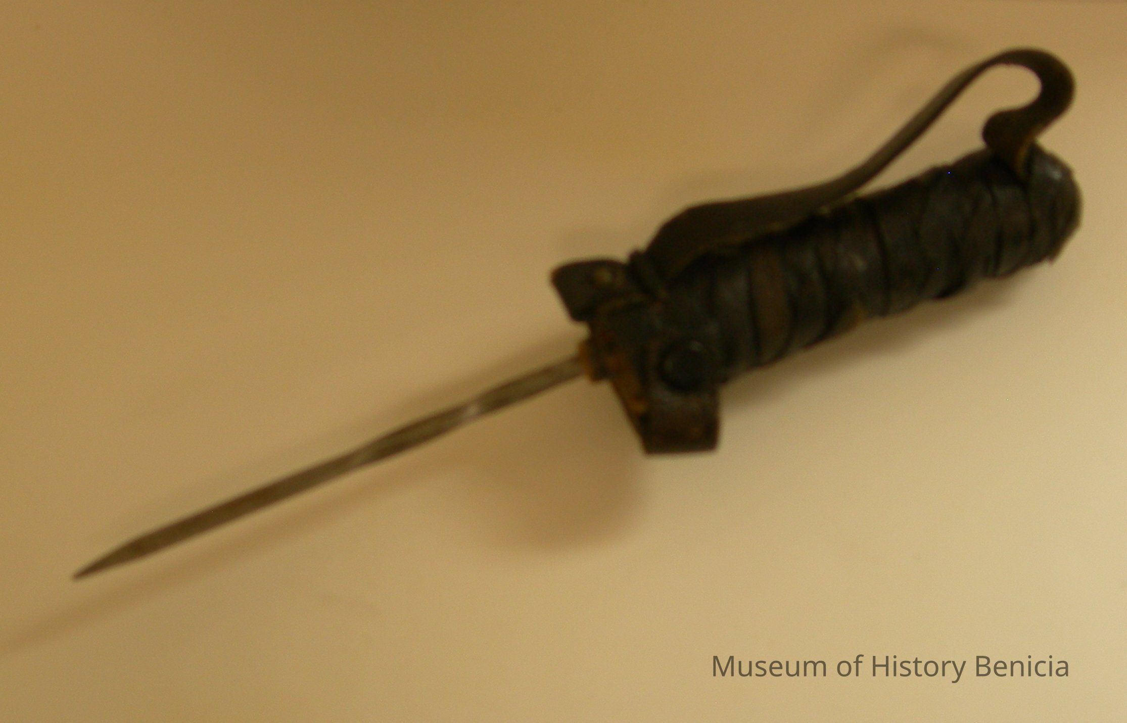 Gouge, black leather on handle with loop, silver metal, twisted, four-sided, pointed spike; 10 inches long