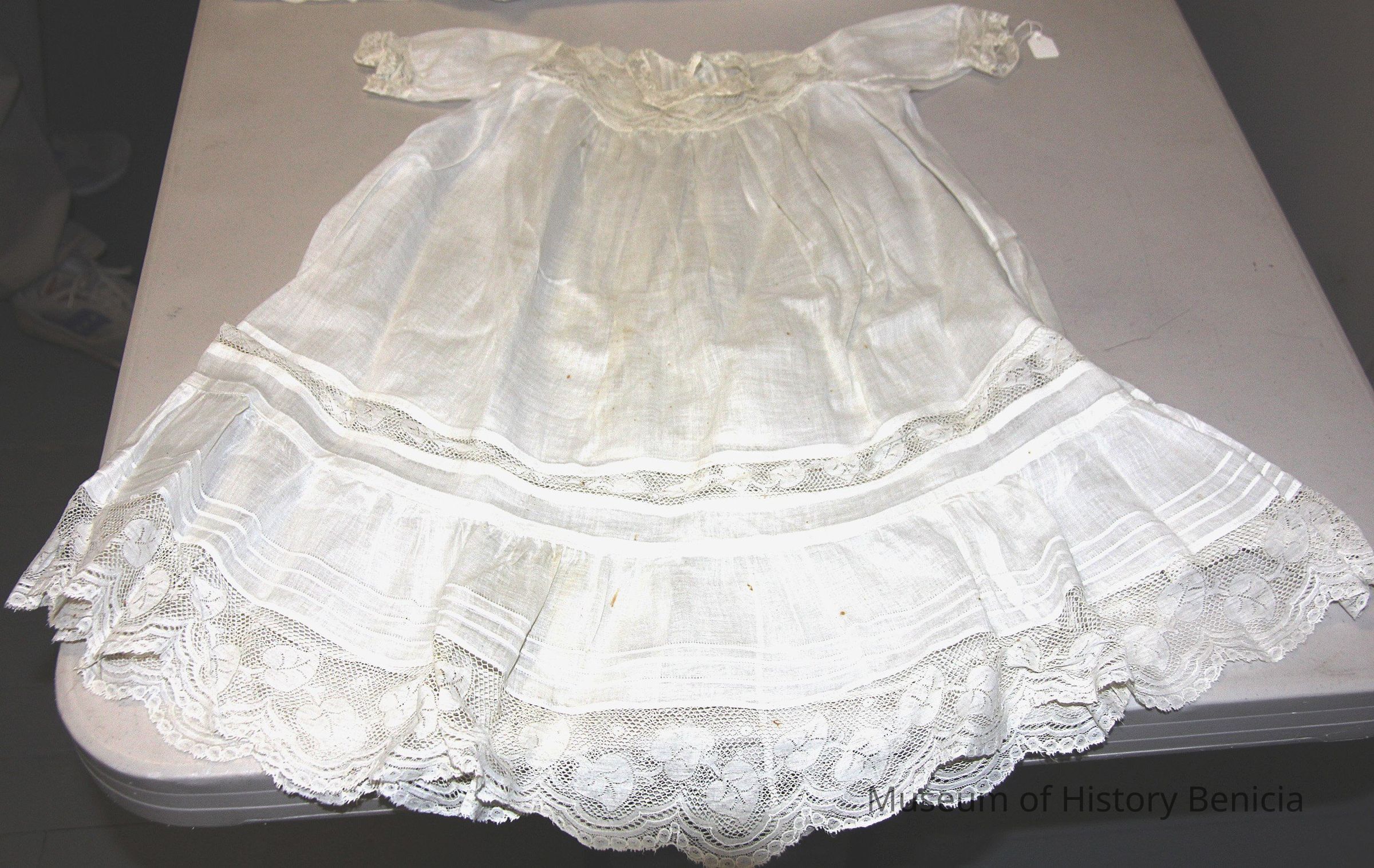 Child's white lace dress/slip. . Christening gown (white). 2 snaps in back, lace collar, yoke, cuffs and hem.