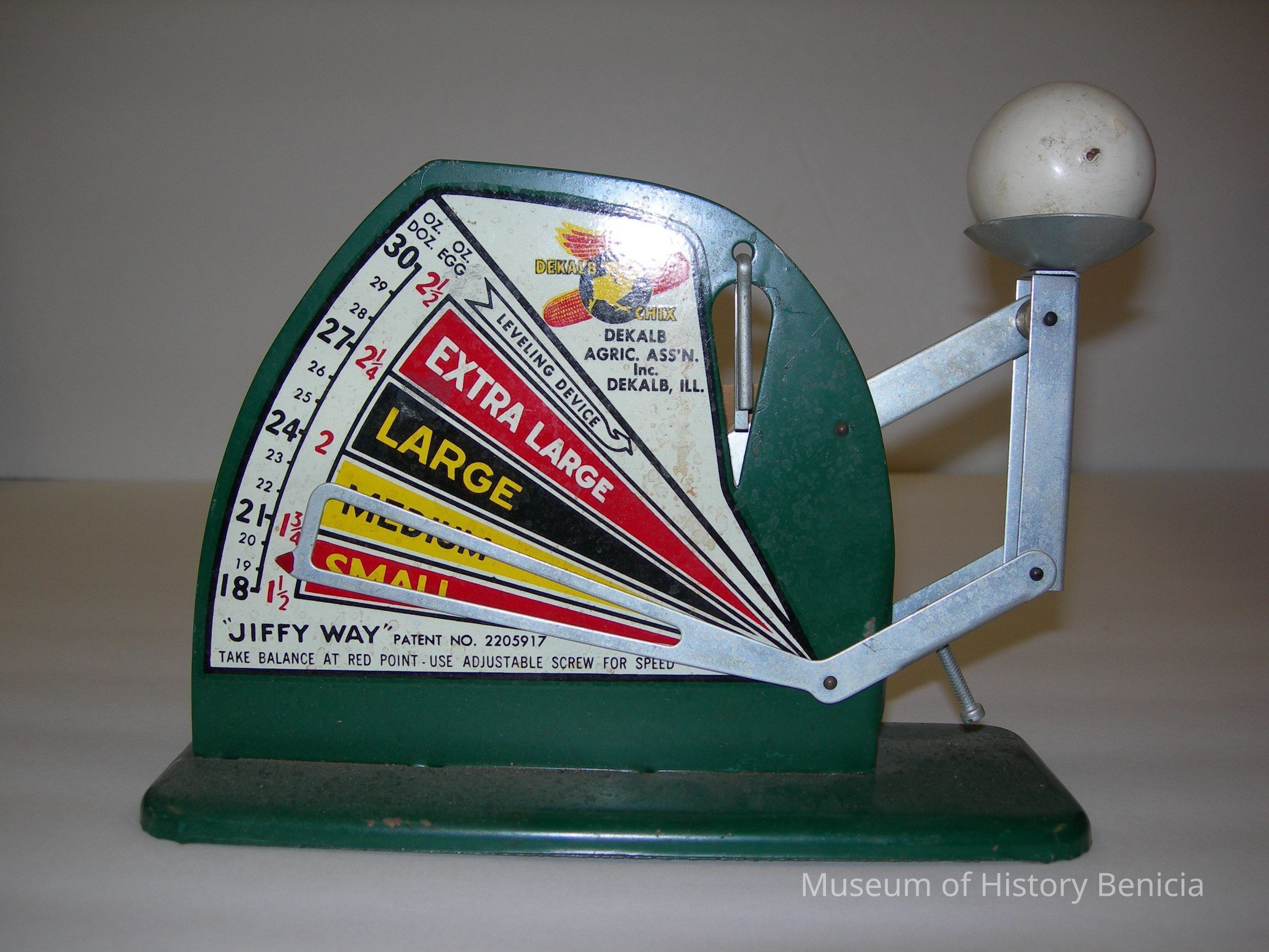 scale used for grading eggs; made by Dekalb Agricultural Association Inc. Dekalb, Ill. called "Dekalb Chix" "Jiffy Way" patent no 2205917