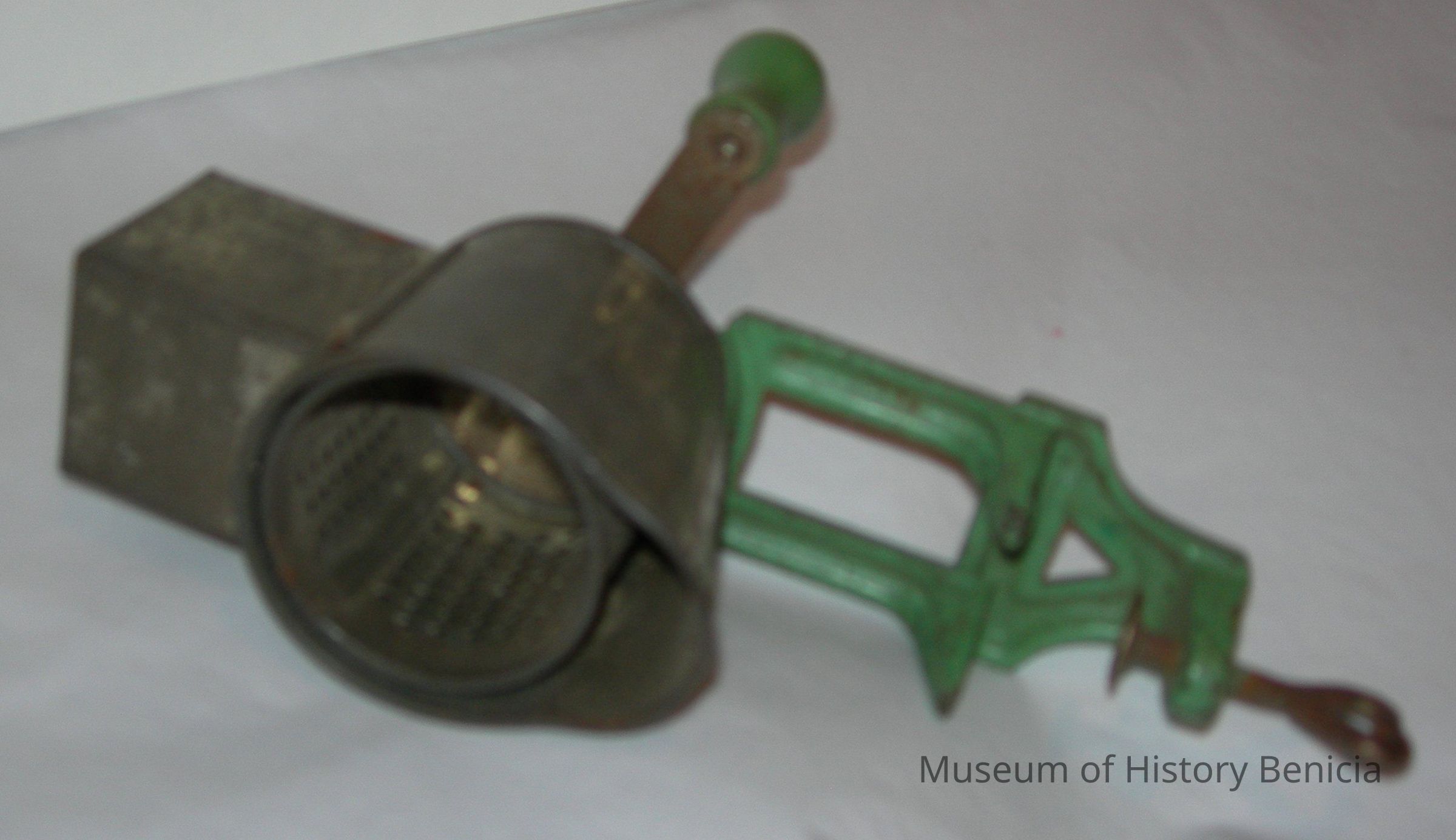 food gratermetal, food feeds in at top, turning handle sends food into cylinder with small holes and ground food comes out the side; there is a screw down at the bottom so the grater can be attached to a counter top or bread board; it is painted and unpainted metalCollection