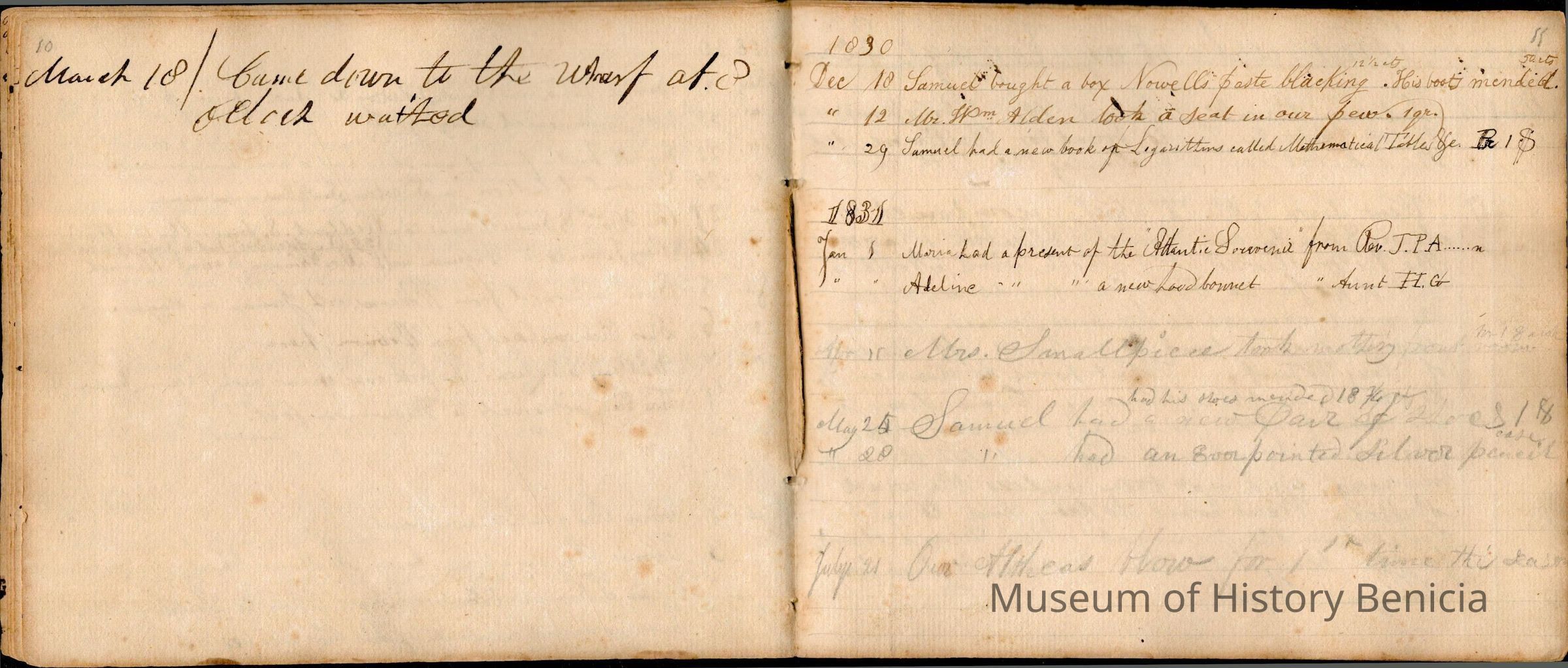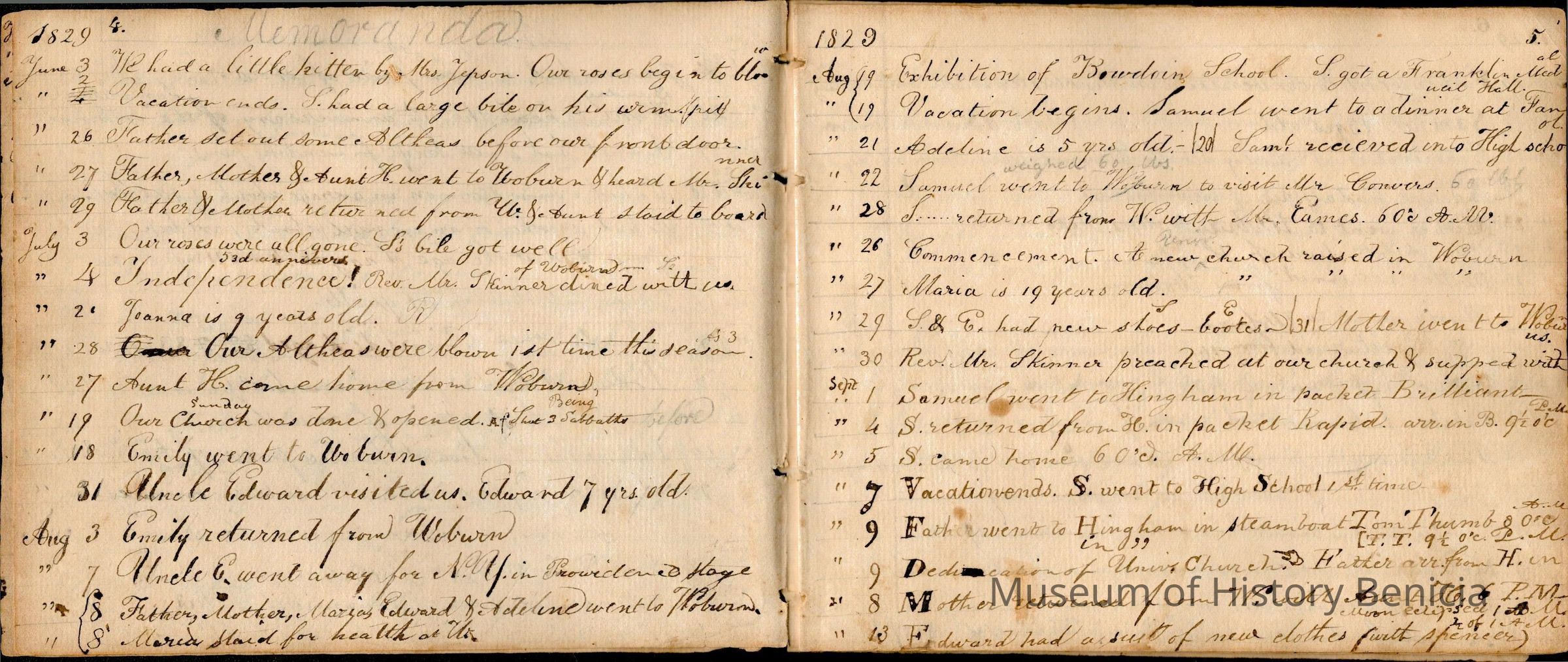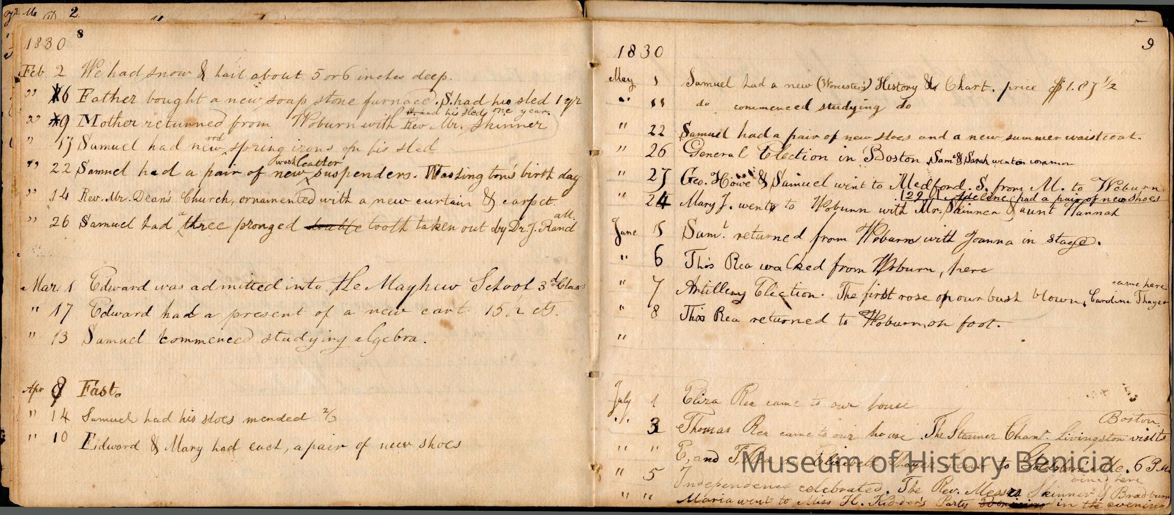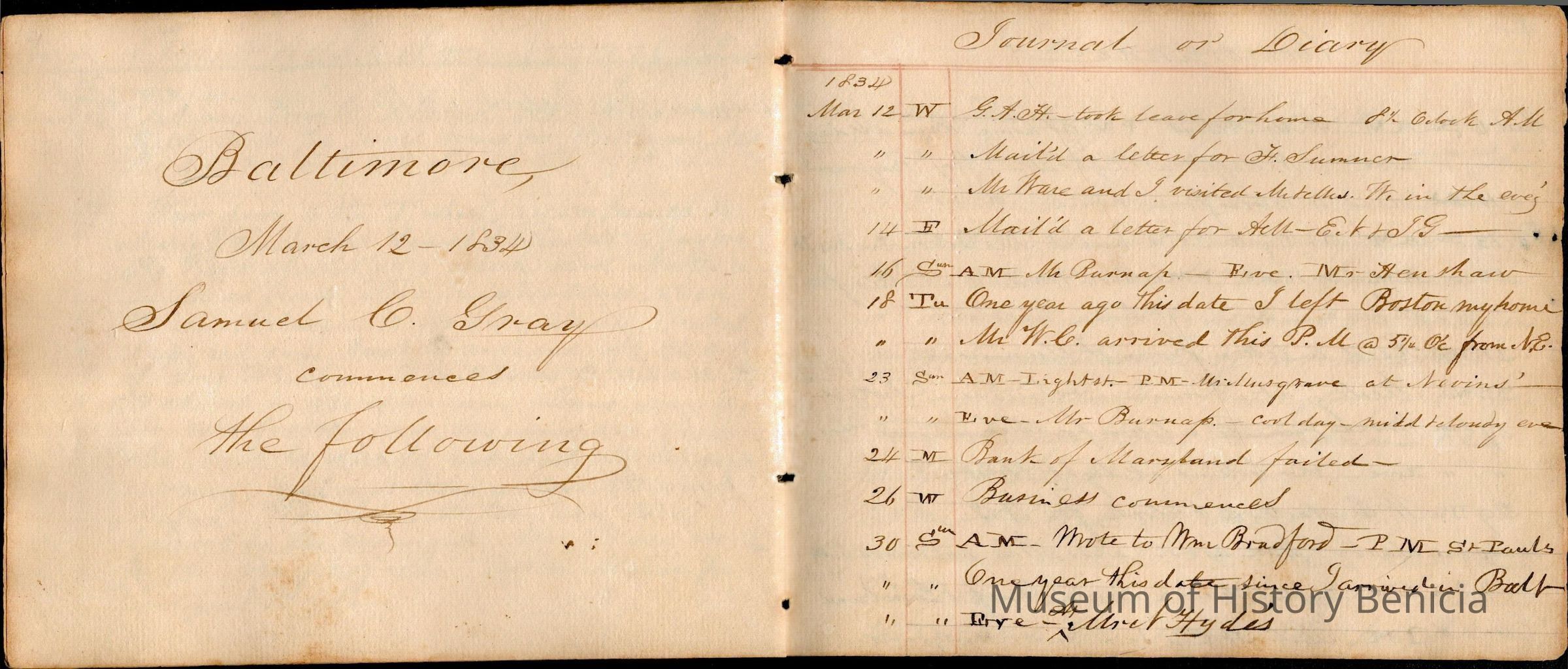 This is an early diary kept by Samuel Gray starting in 1828. The book was kept by Samuel thru 1837 with some entries by his mother Joanna Gray.