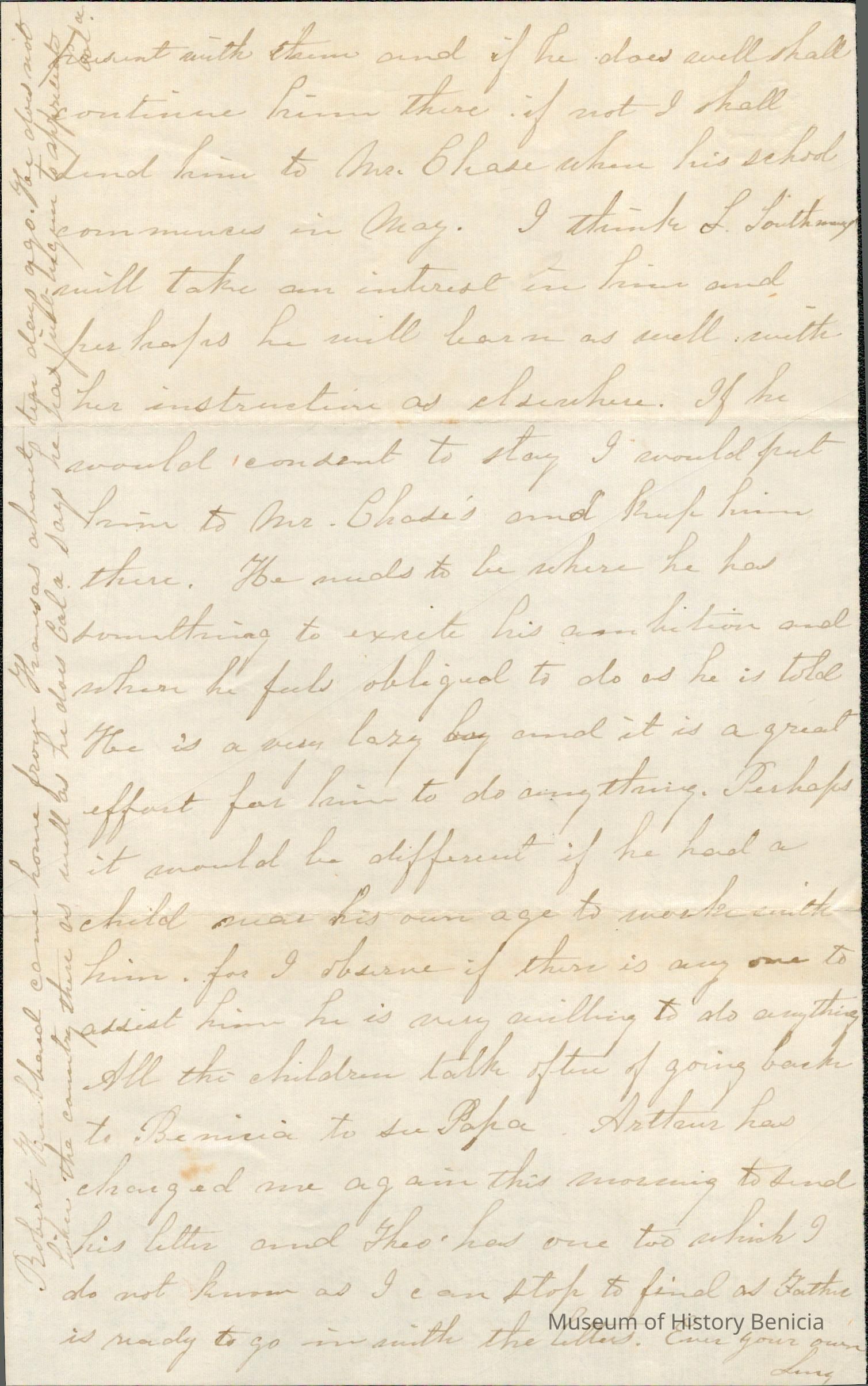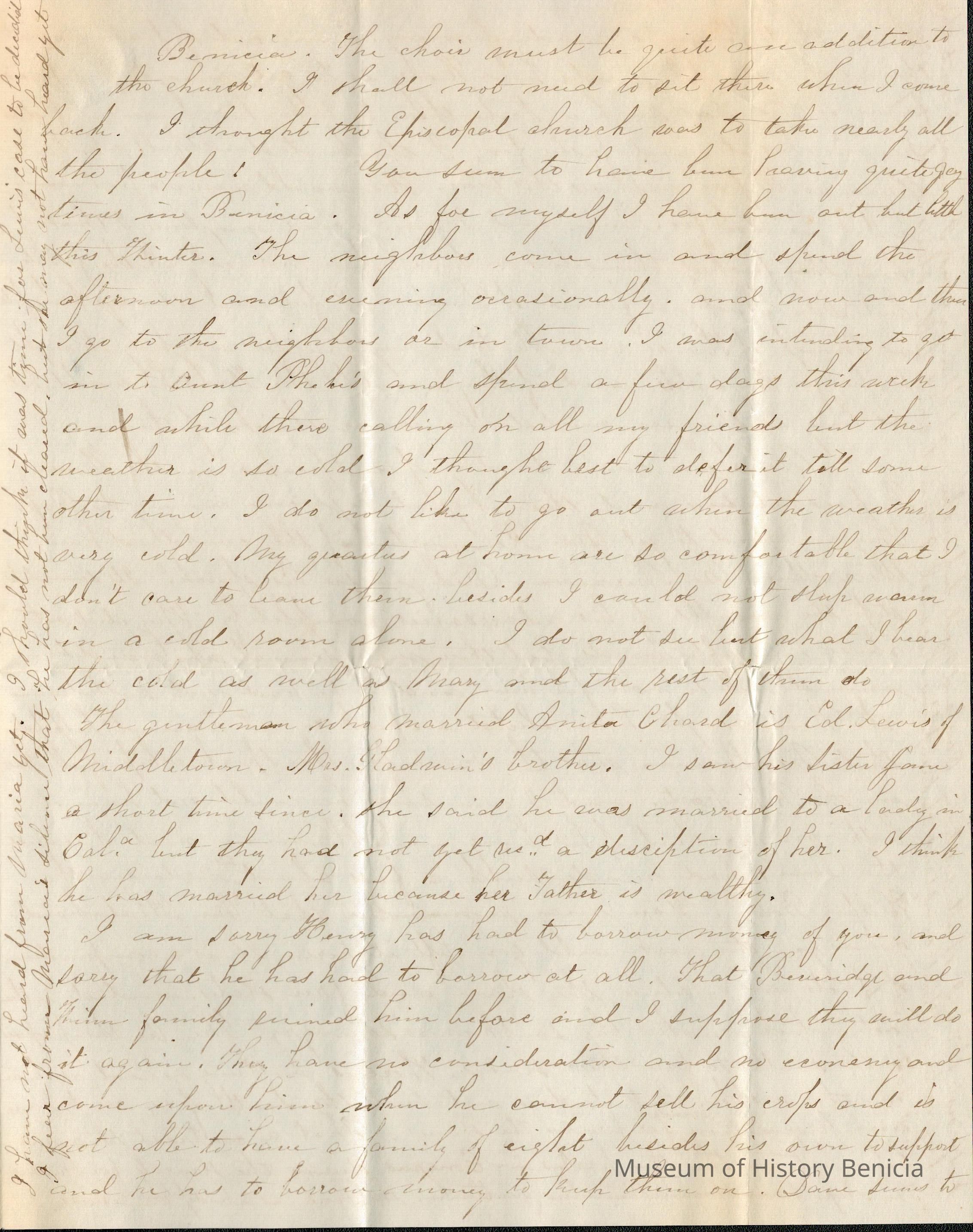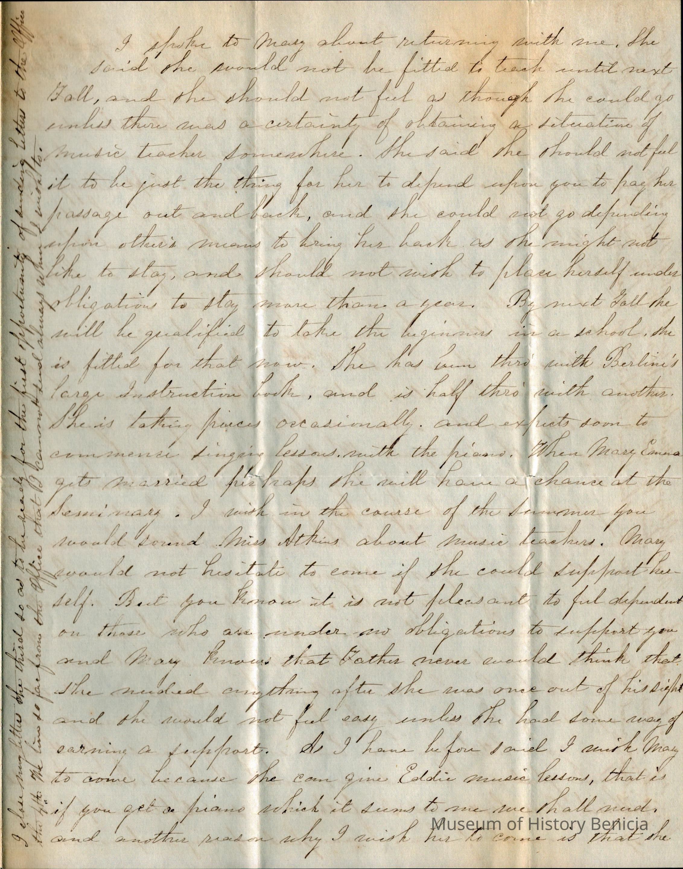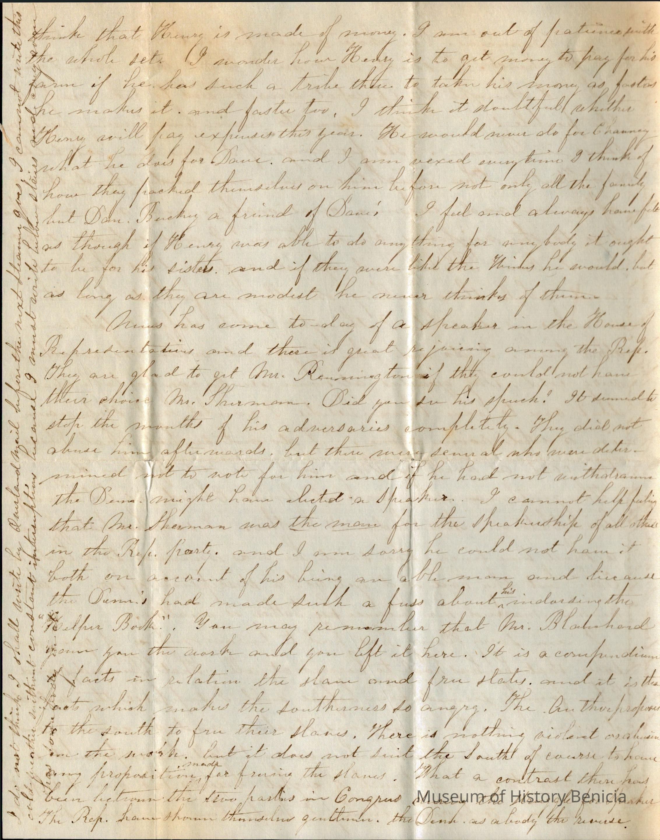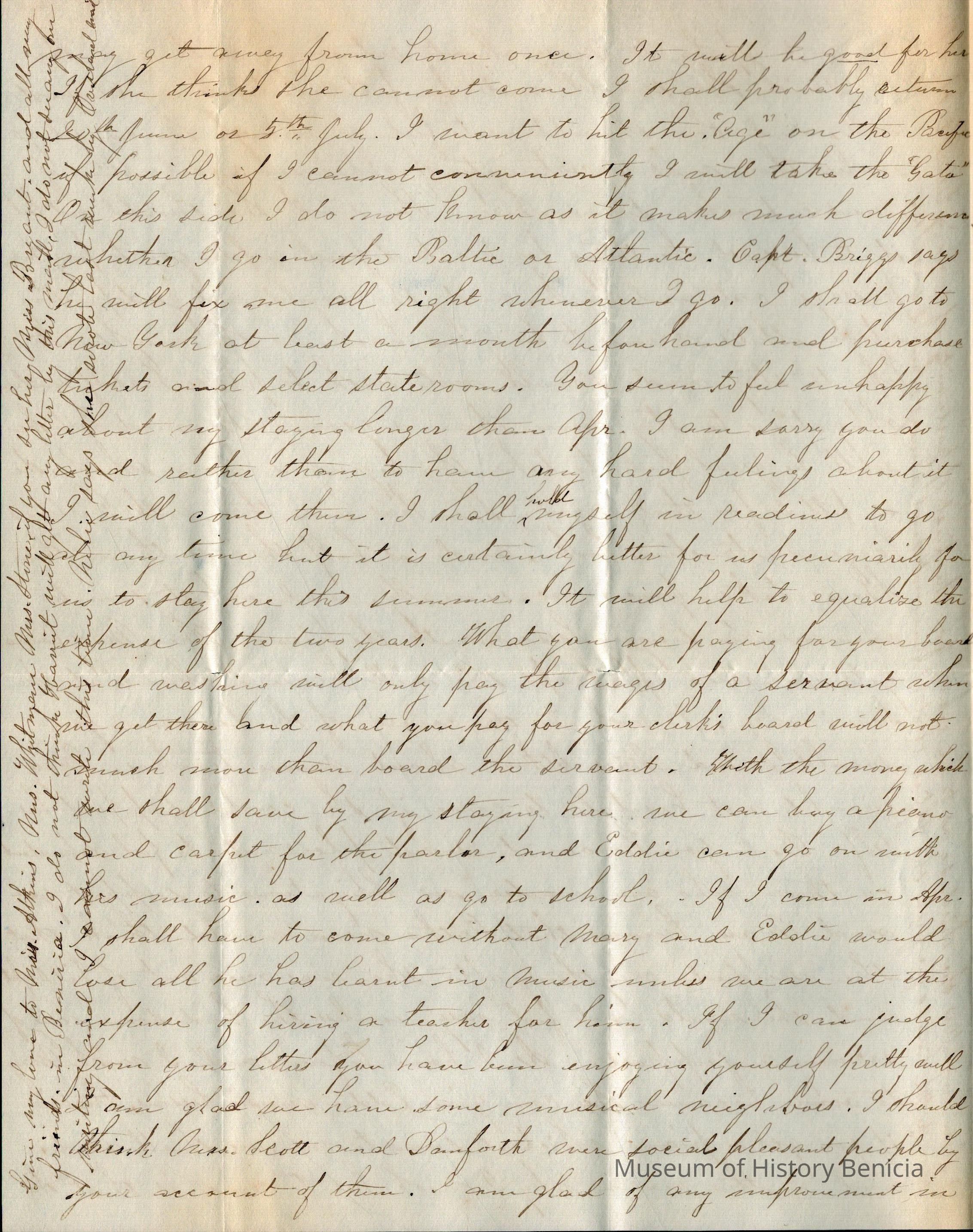 This is a partial letter from Lucy Gray on the East Coast to Samuel Gray in Benicia.
