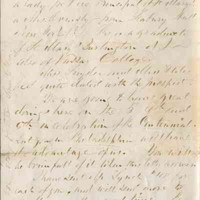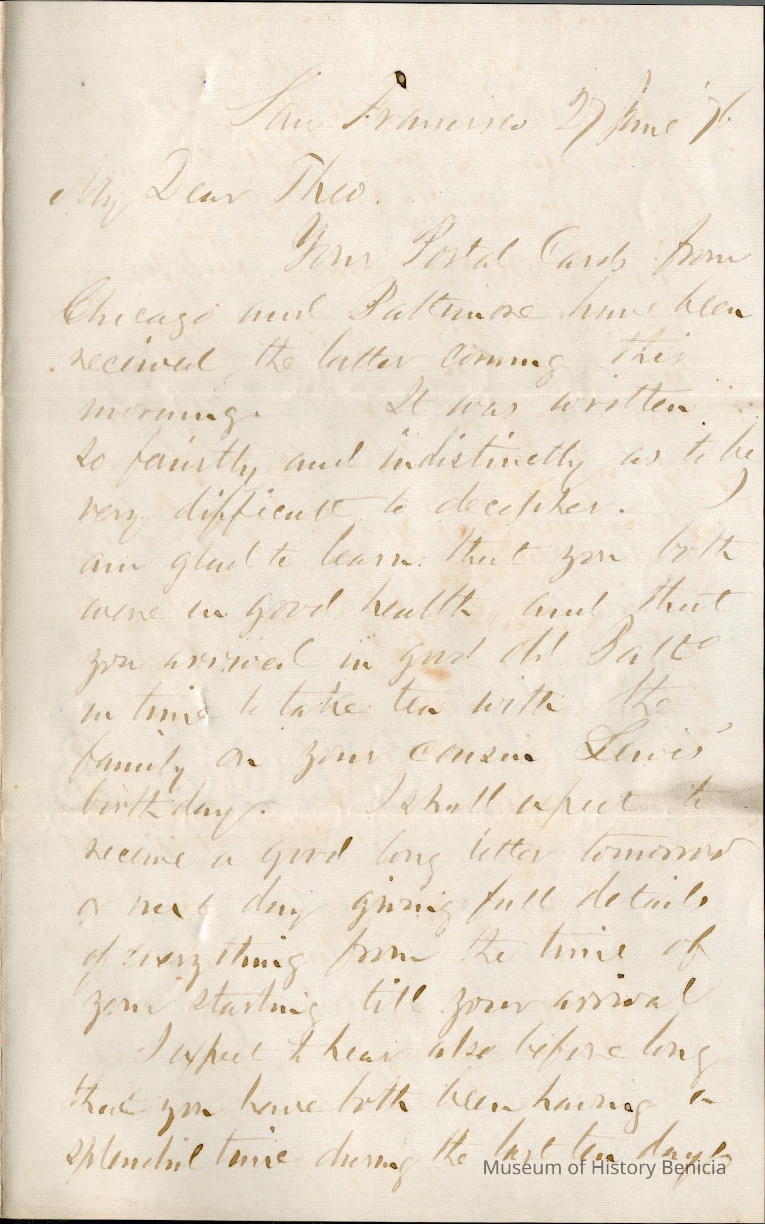 This is a letter from Samuel Gray to his son Theo who is traveling on the East Coast. The letter is dated 06/27/1876. This lines up with cousin, Lewis whose birthday is mentioned, born on 06/17/1841. The June. The "Exhibition" in Philadelphia mentioned is probably the Philadelphia Centennial Exhibition that started 05/16/1876 and ran to November of 1876. The marriage of George Alfred Hastings to Miss (Mary Ann) Wallace is recorded as 06/20/1876. (This doesn't match the Friday, 06/23rd date given by Samuel but is very close and does support the year as 1876.)