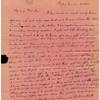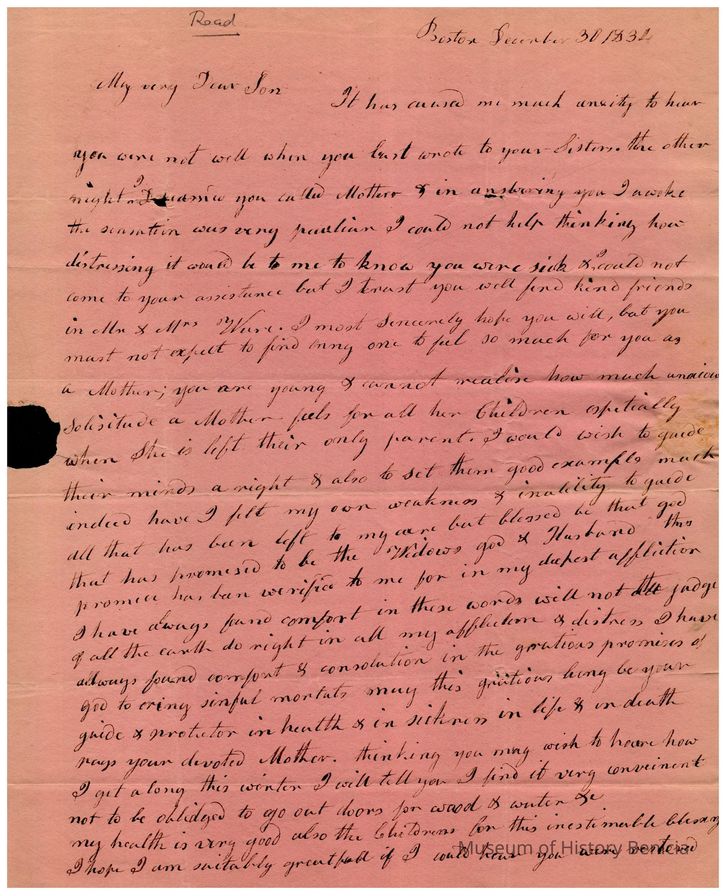 The image displays a handwritten letter dated December 30, 1832, addressed to Samuel C Gray, her son, from his mother, Joanna Powers Gray, expressing concern about his health after receiving news that he was unwell; she emphasizes her inability to be physically present to assist, offers emotional support, assures him of the kindness of others who might help, reflects on her own limitations, and highlights a spiritual reliance for strength and guidance, expressing hope for his recovery and good health while updating him on her own health and circulating thoughts of gratitude. At this time Samuel C Gray is in Baltimore, MD and his mother is in Boston, MA.Collection