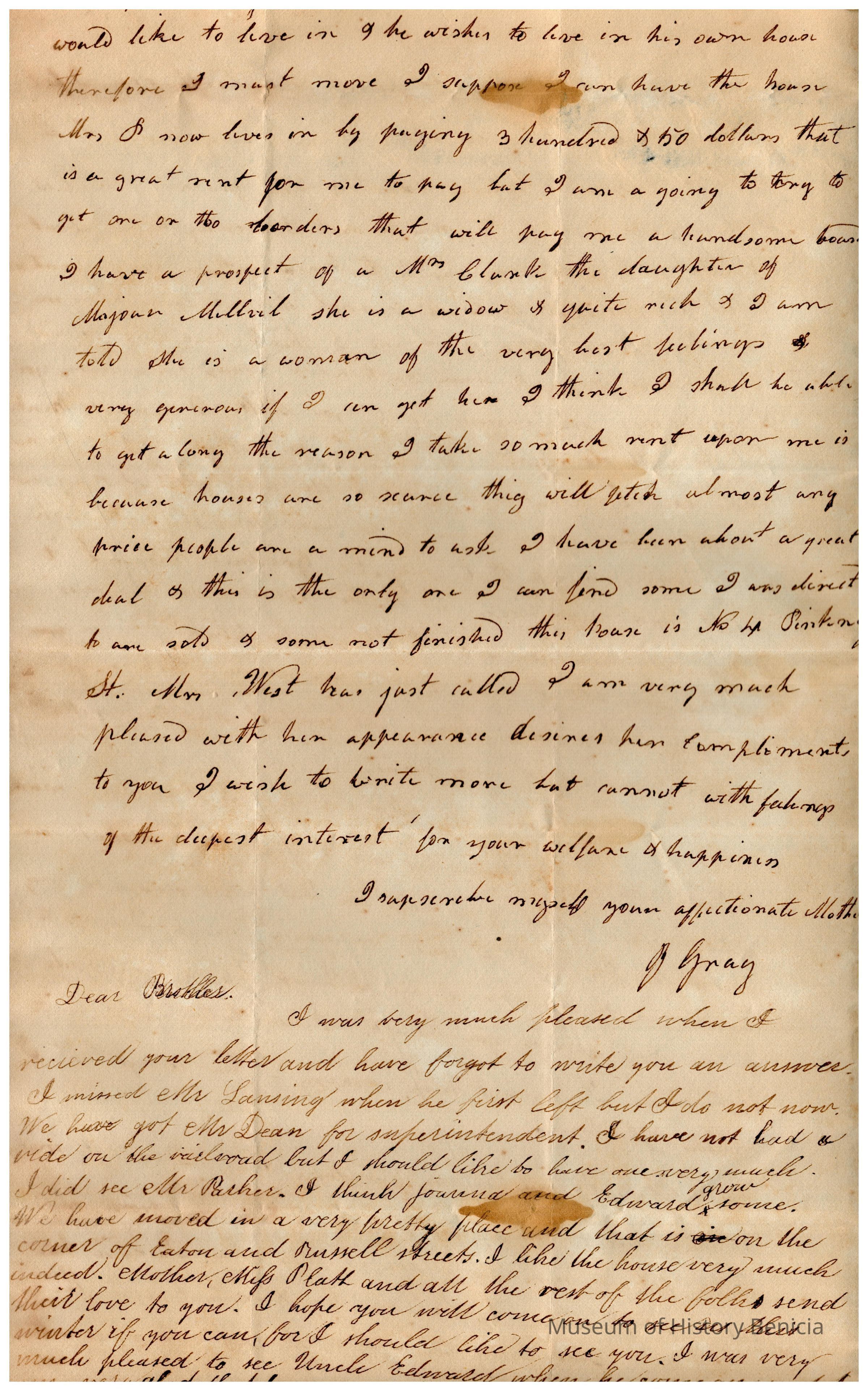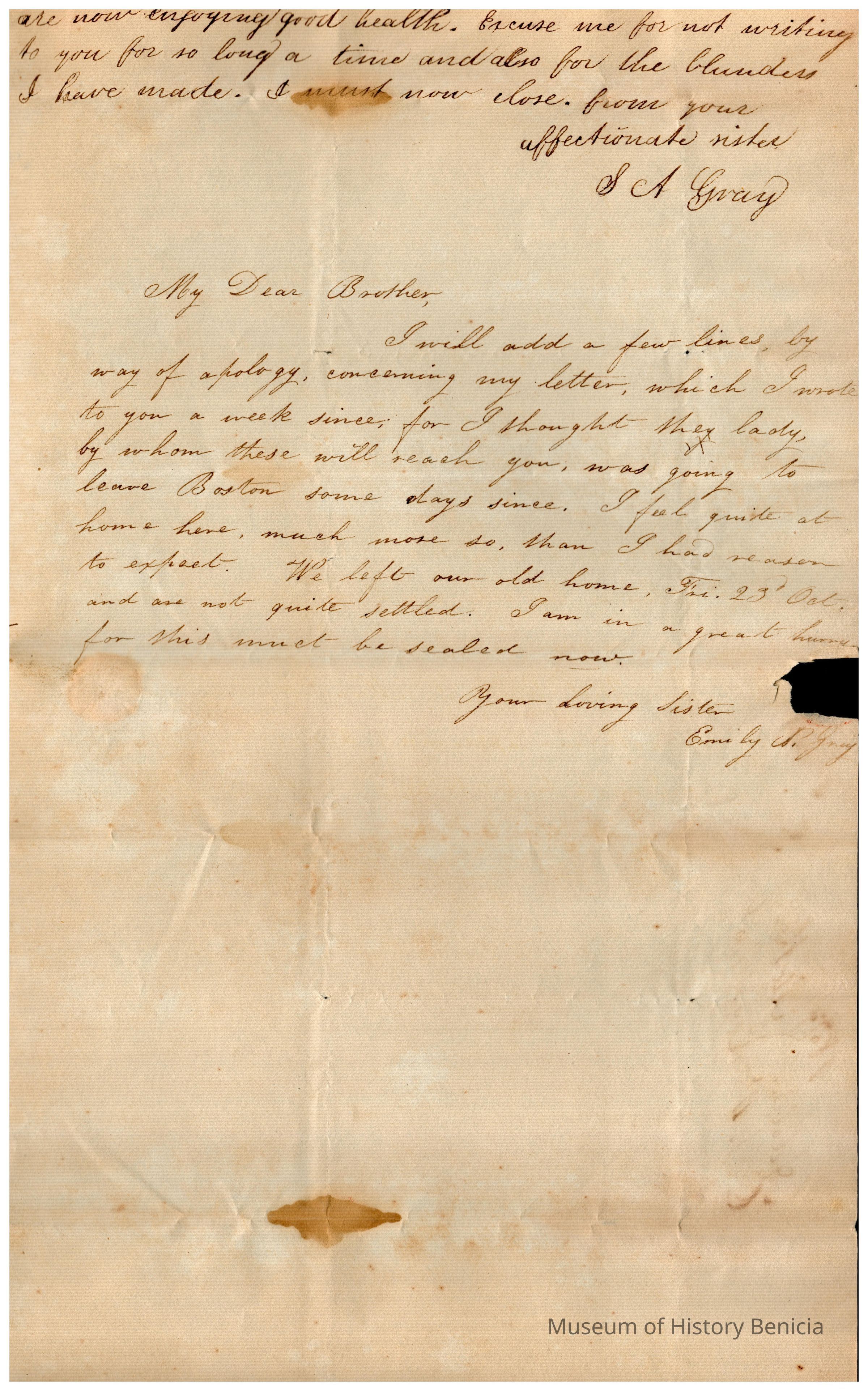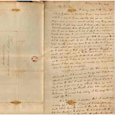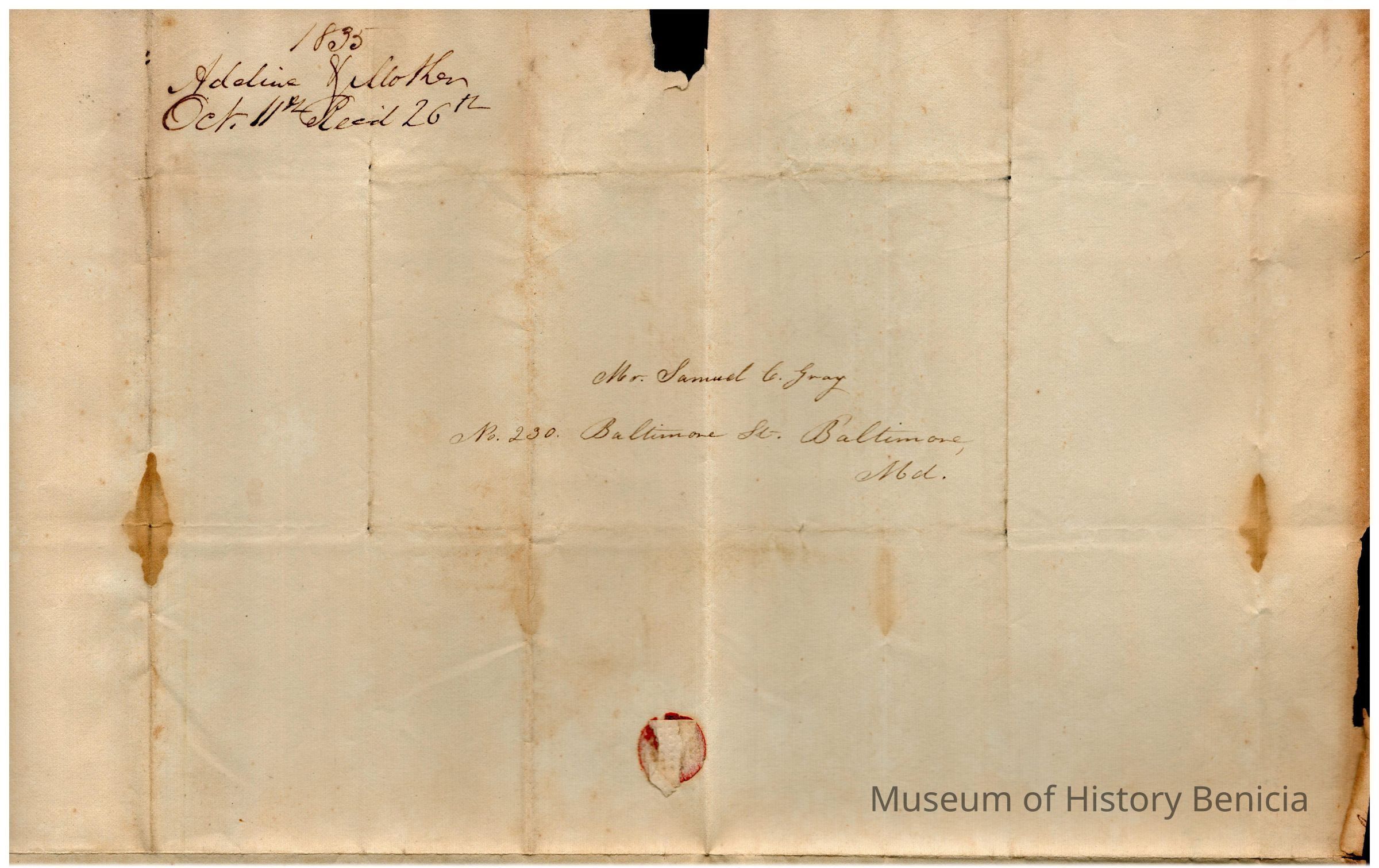 The image shows an old handwritten letter dated October 11, 1835, beginning with "My Dear Son" in cursive. The letter expresses sentiments about Samuel C Gray's birthday which is that day, a desire to know the son's current situation, and mentions Mr. Carrol, about how he pays Samuel for his work. The writer expresses hope for a visit, talks about Maria's visit, and discusses plans to make significant changes in their life due to a recent loss. The ink appears faded, and there is some discoloration.