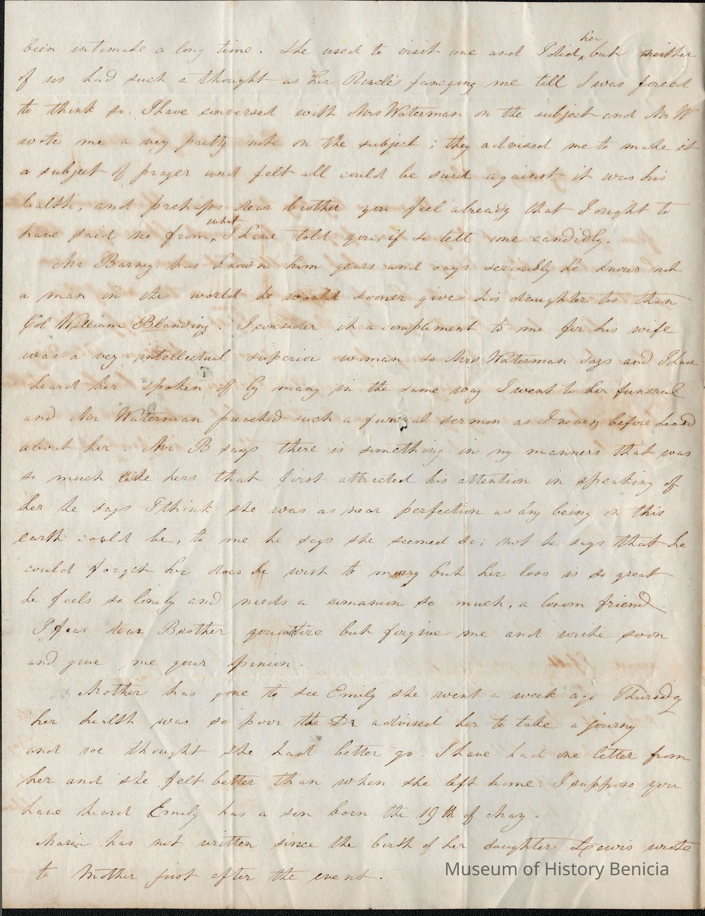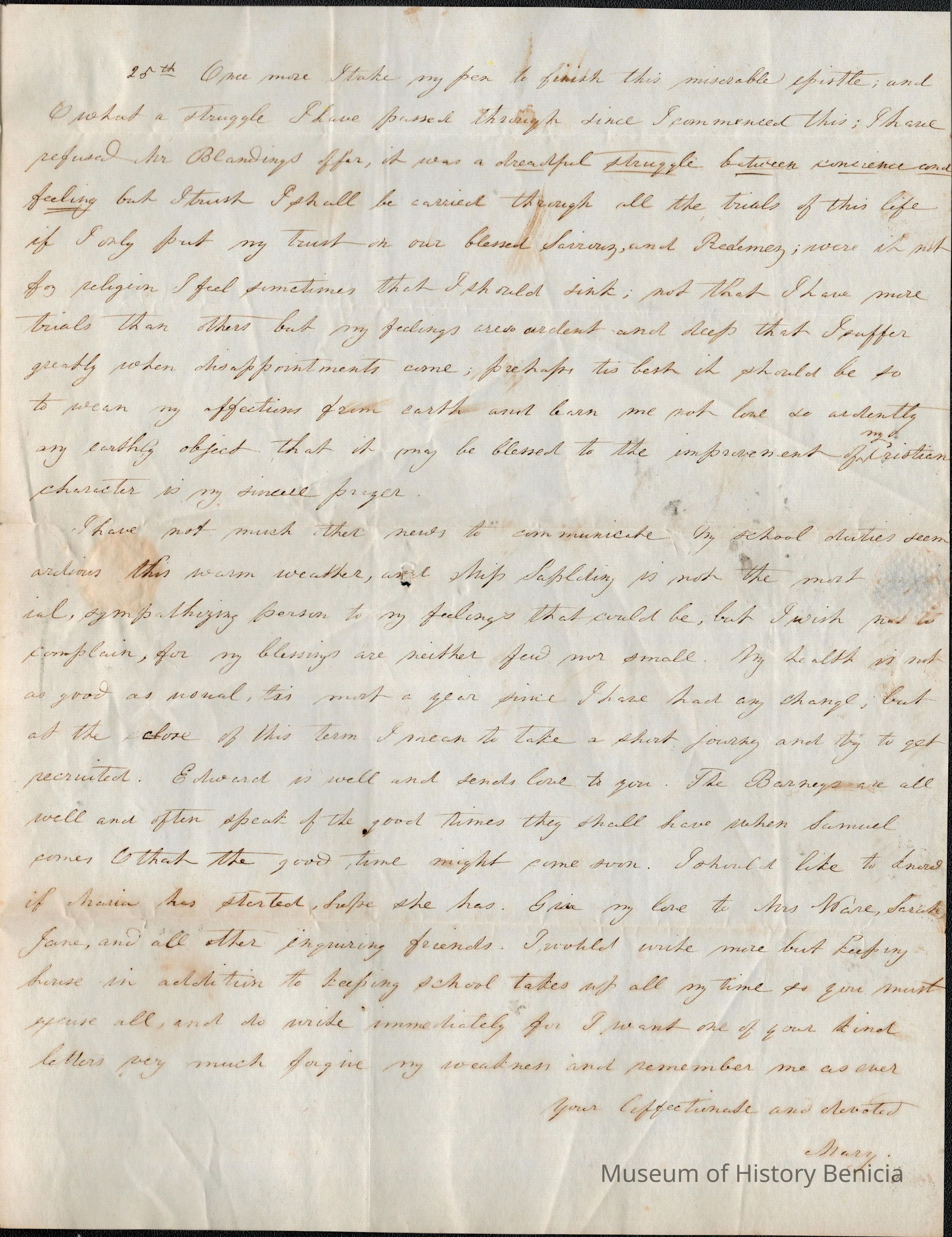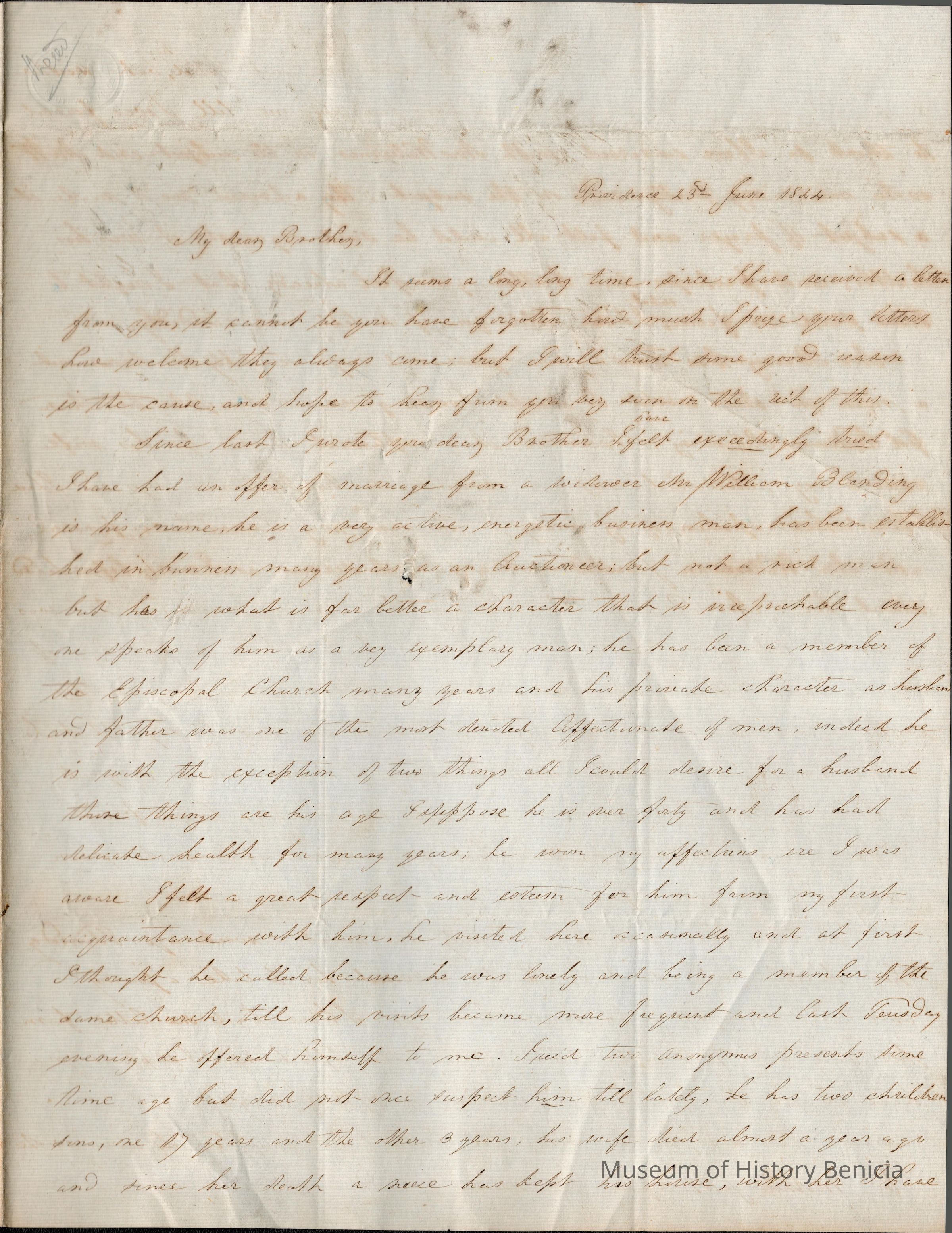 This is a letter dated 06/23/1844 from Samuel Gray's sister Mary Joanna regarding family matters. The matter most on her mind is a proposal of marriage from William Blanding. She writes to Samuel for his advice, explains all of the reasons why she likes Mr. Blanding and the reasons why she doesn't want to marry him. She is worried by his age, over 40 and a widower. His wife, Mary Richard Blanding (1797 - 11/09/1843) and he says that Mary reminds him of his wife.