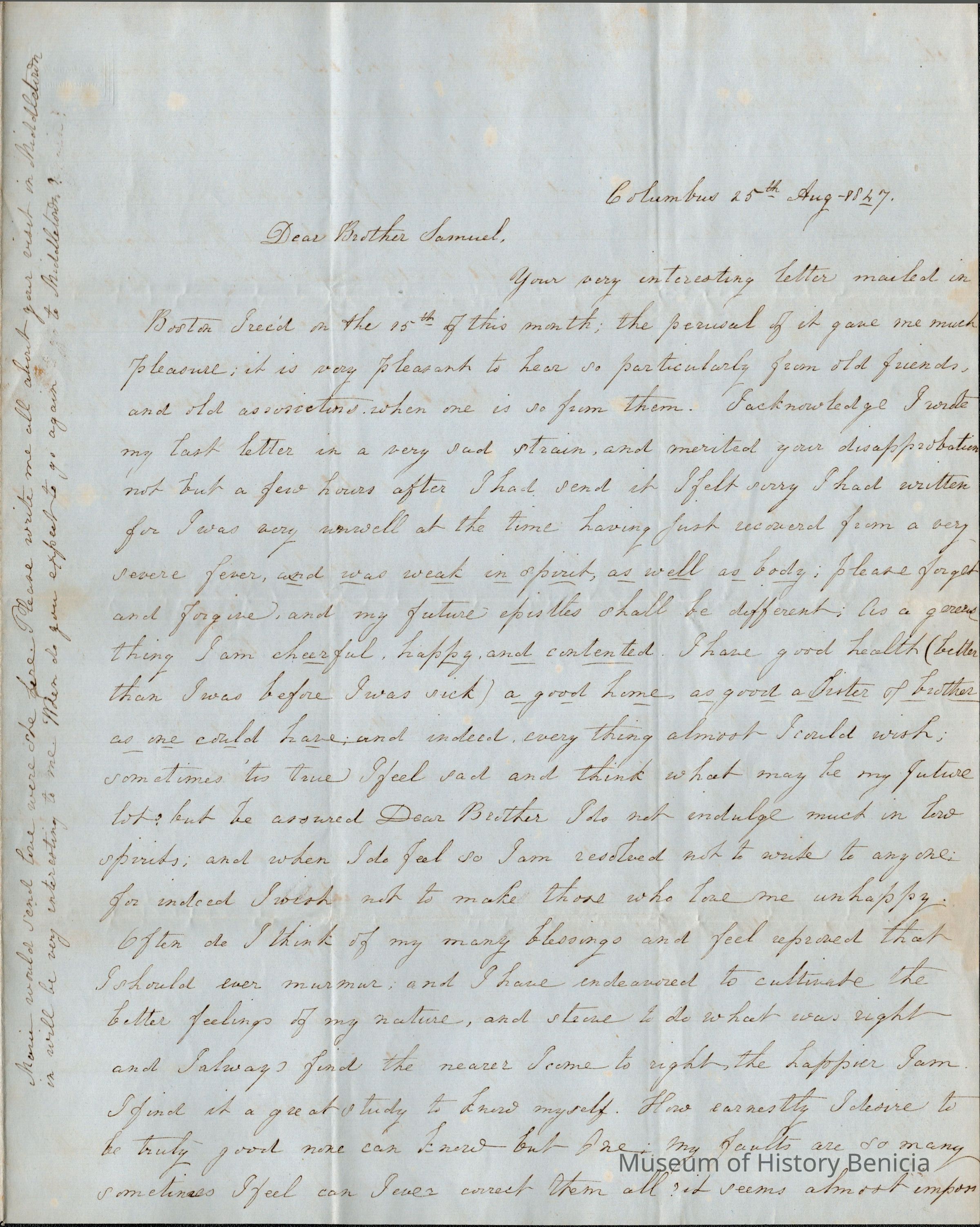 This is a letter dated 08/25/1847 from Samuel Gray's sister Mary Joanna Gray regarding family matters. She corrects what her brother-in-law Lewis said about her being engaged. She is emphatic that she has not accepted the professions of love from Mr Tichnor. She says she wants to start teaching school again even though Maria and Lewis would prefer she didn't. She also says she is very content living in Columbus.