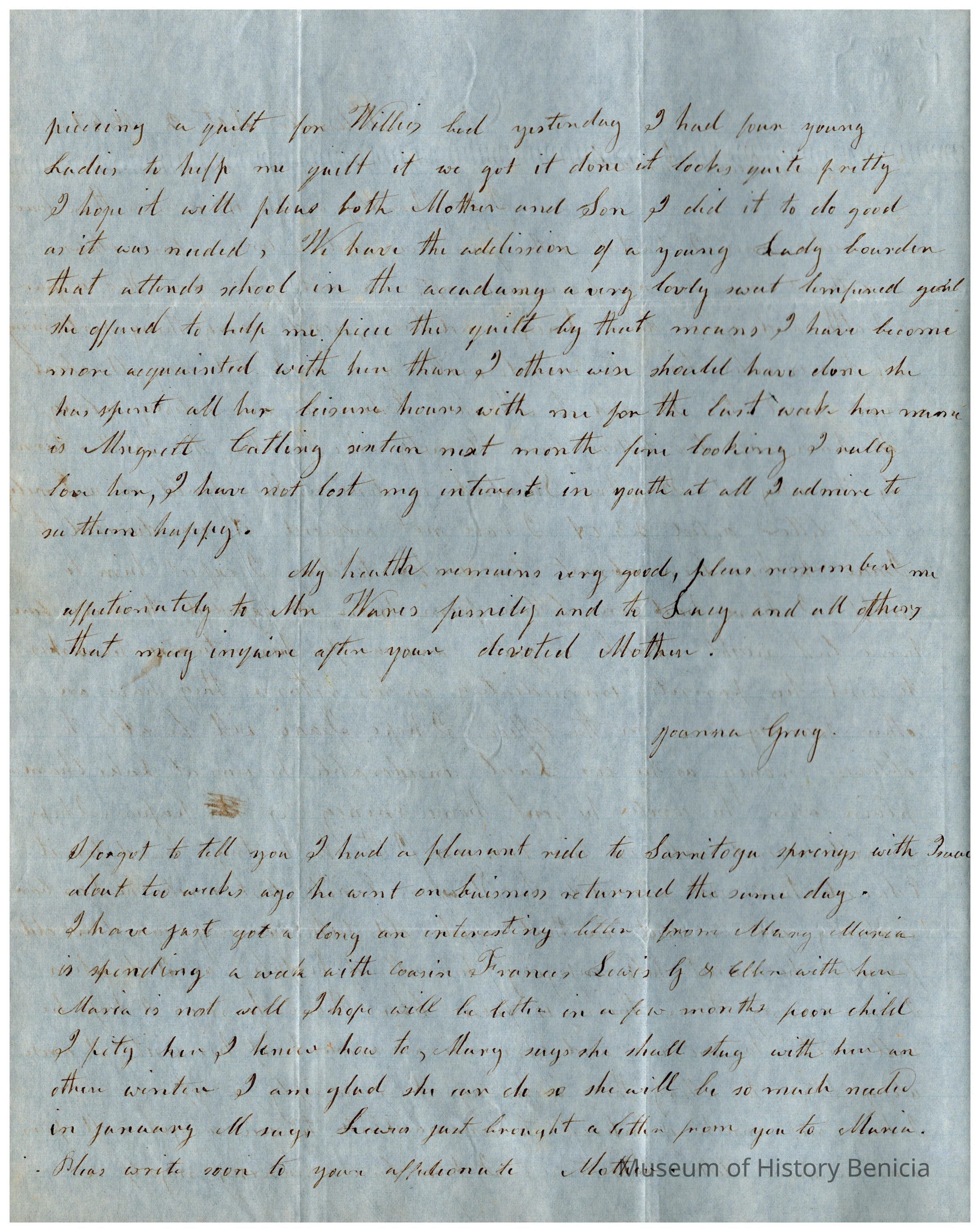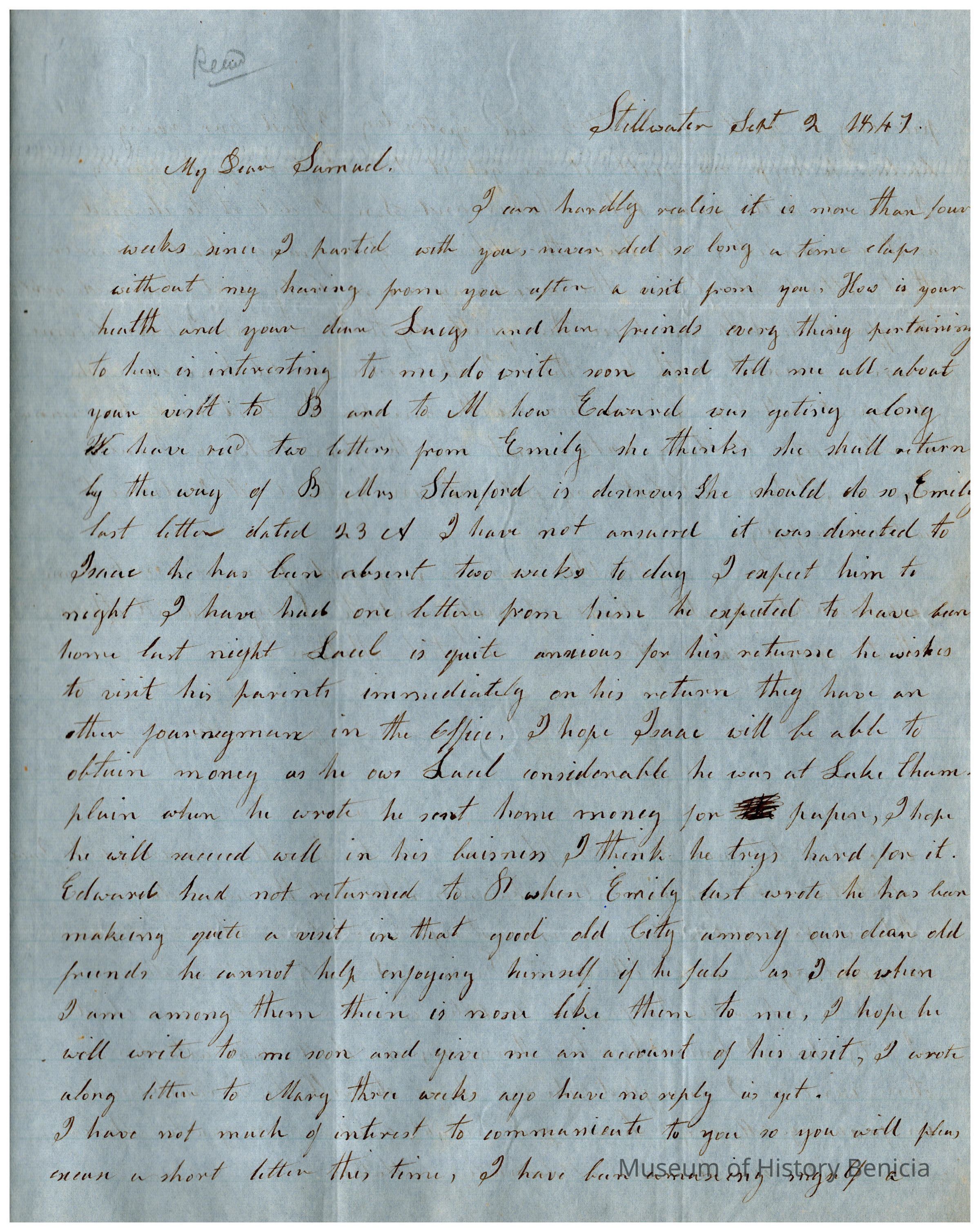 This is a letter to Samuel C Gray in Baltimore from his mother, Joanna Gray, dated 09/02/1847. Joanna is in Stillwater and Samuel is still in Baltimore. Joanna tells samuel of the latedt family news and her own finances and activities.Collection