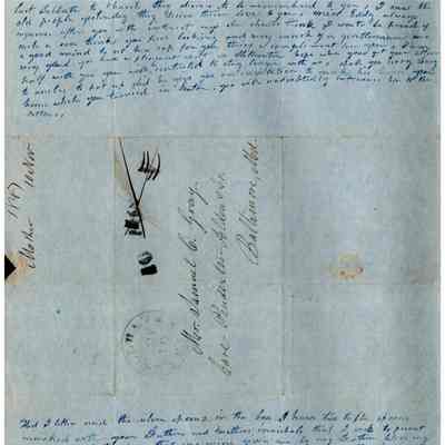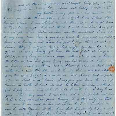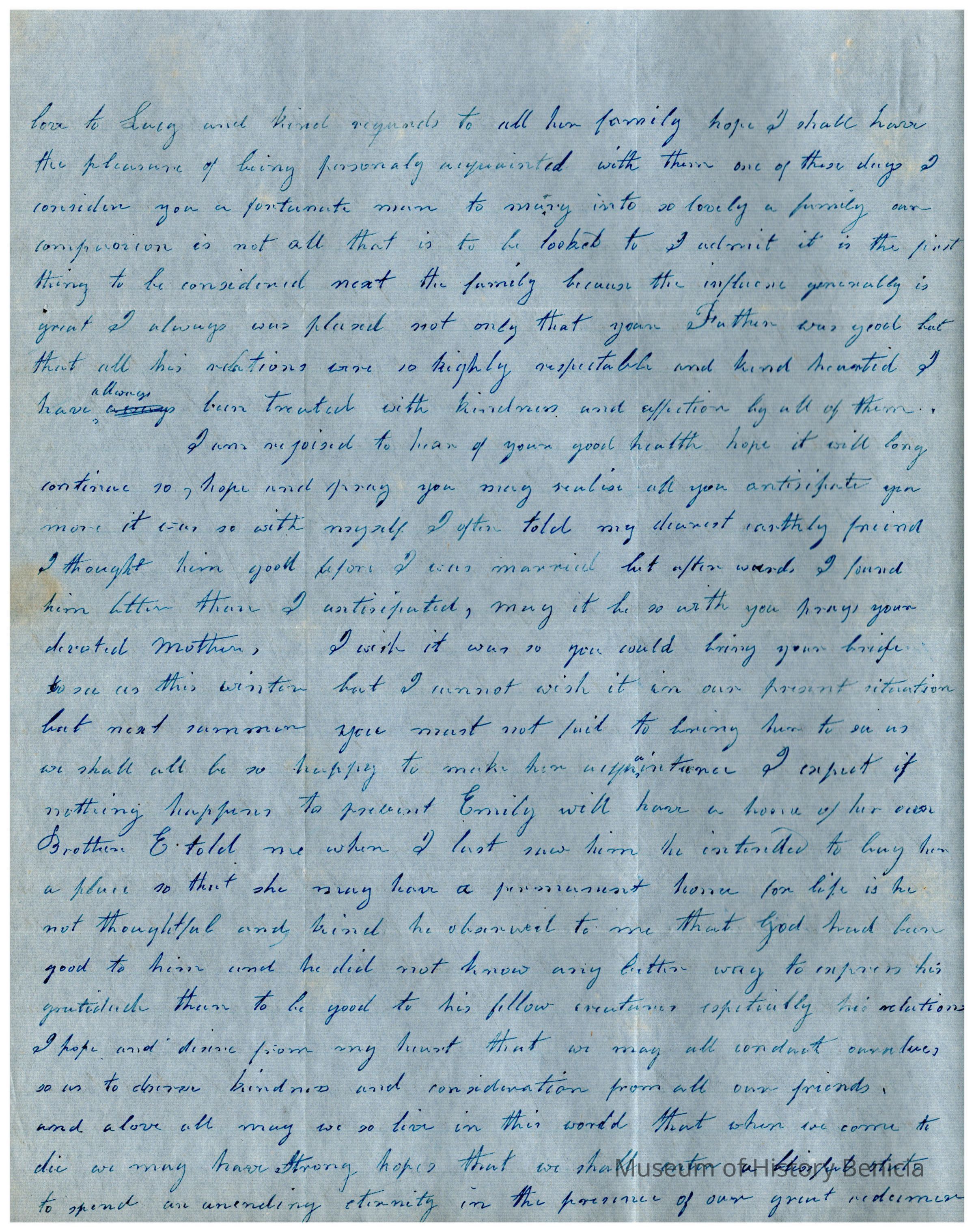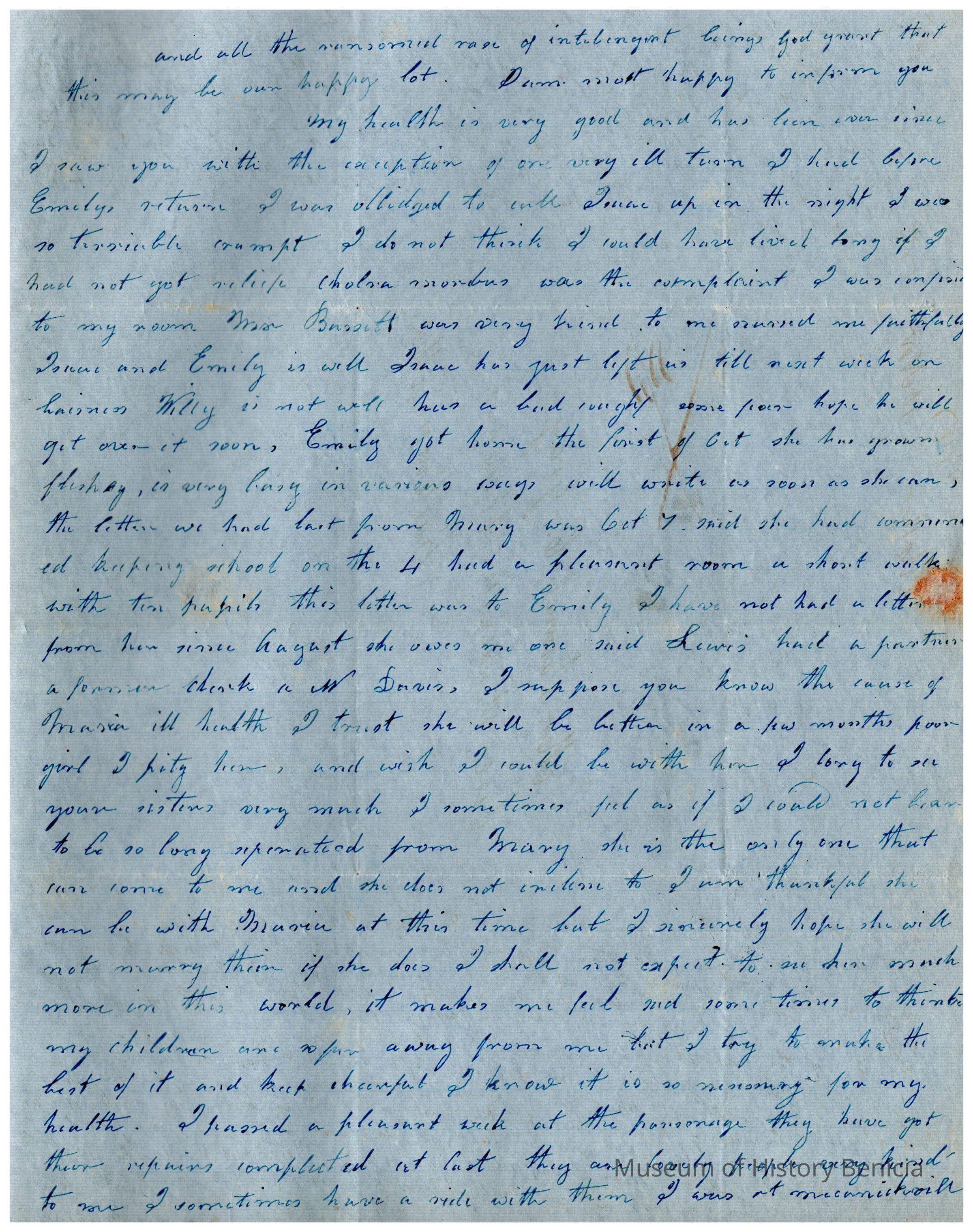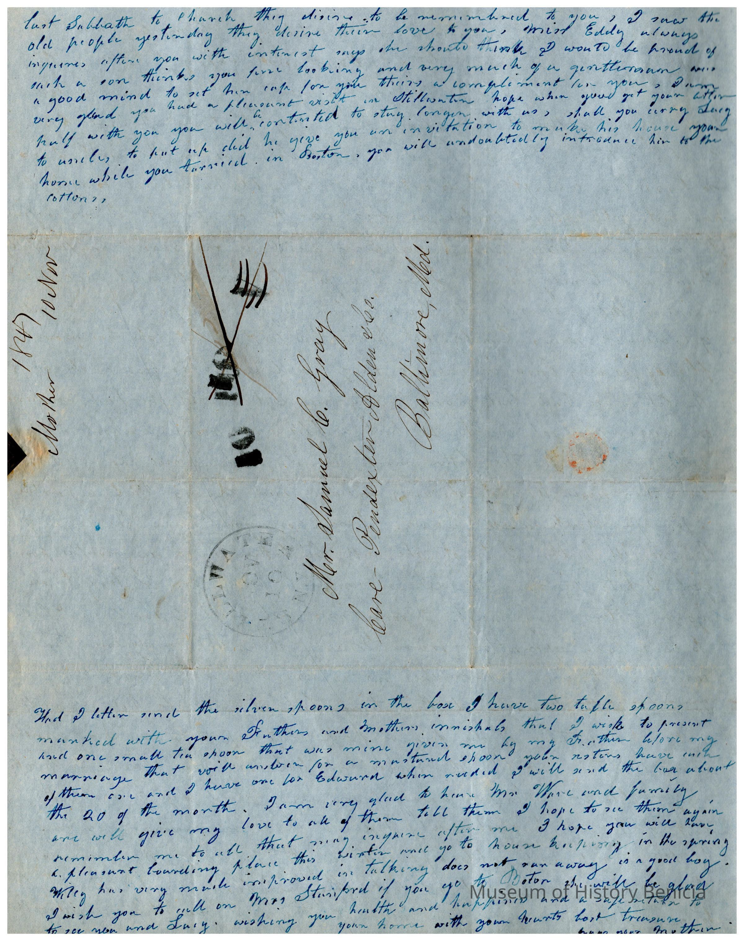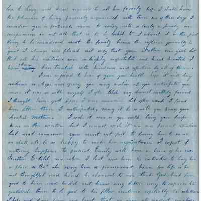 The image shows an old, handwritten letter on blue paper, dated "Stillwater 11 November 1849," addressed to "My Dear Son." The letter is written in neat cursive and discusses topics like family, friends, financial matters, and correspondence. The writer mentions neglect in replying promptly and expresses happiness over the recipient's improvement and interaction with friends. They discuss financial concerns, mentioning a sum of one hundred dollars that Joanna had given to Edward's wife which she now wishes he should give to Samuel.