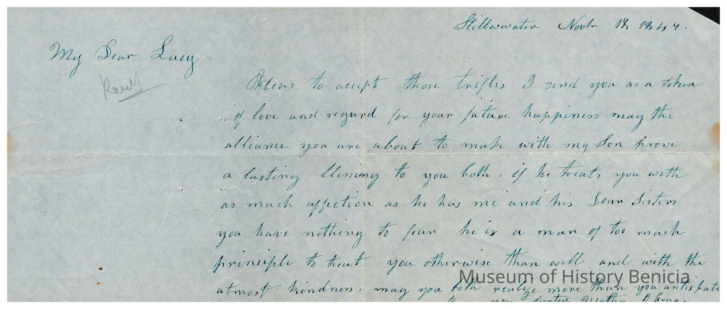 The image features a handwritten letter dated November 18, 1847, from Joanna Gray to Lucy Wetmore on the eve of Lucy’s marriage to Joanna’s son, Samuel C. Gray. The letter is penned on light blue paper and begins with "My Dear Lucy," conveying warmth and affection. Joanna expresses her hopes for Lucy's happiness and the strength of her future alliance with her son. She assures Lucy of Samuel's love and trustworthiness, stating that if he treats her with the same affection as he does his family, she will be truly cherished. Joanna emphasizes her belief in her son's principles and expresses her wishes for Lucy's future happiness in their marriage.