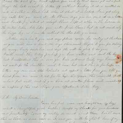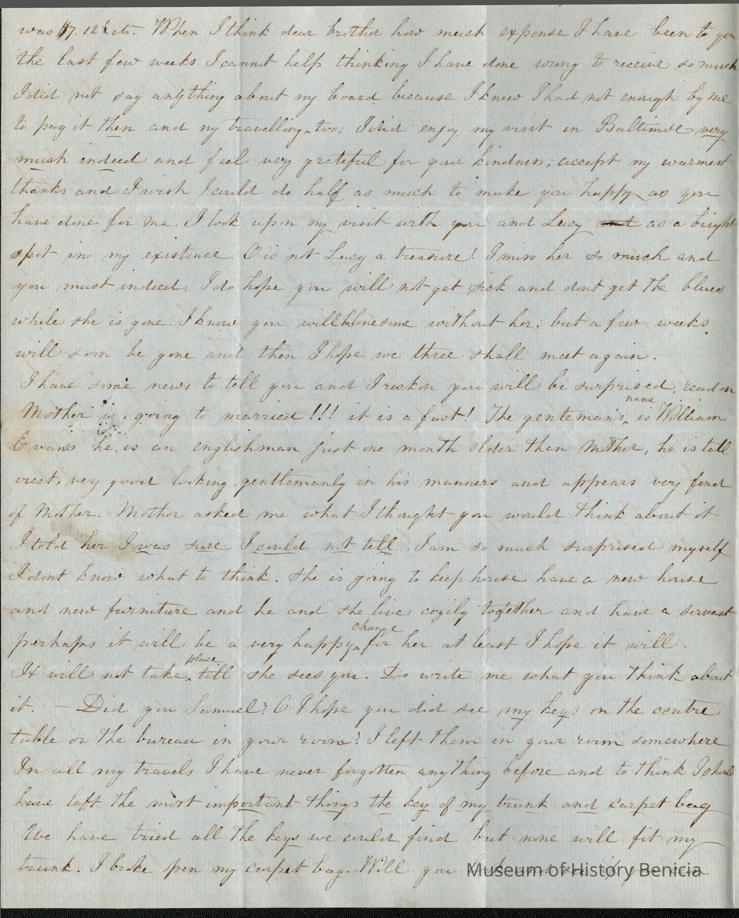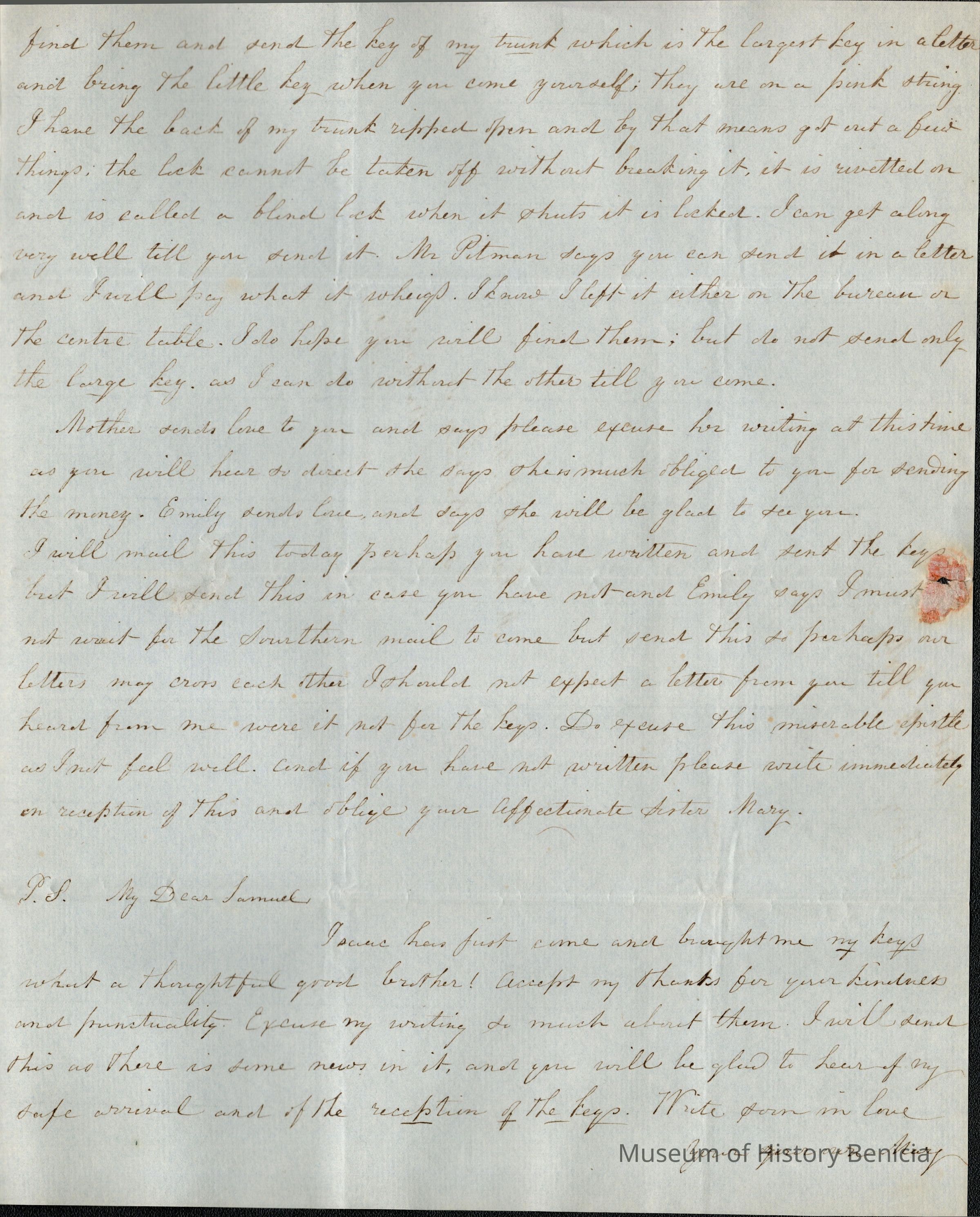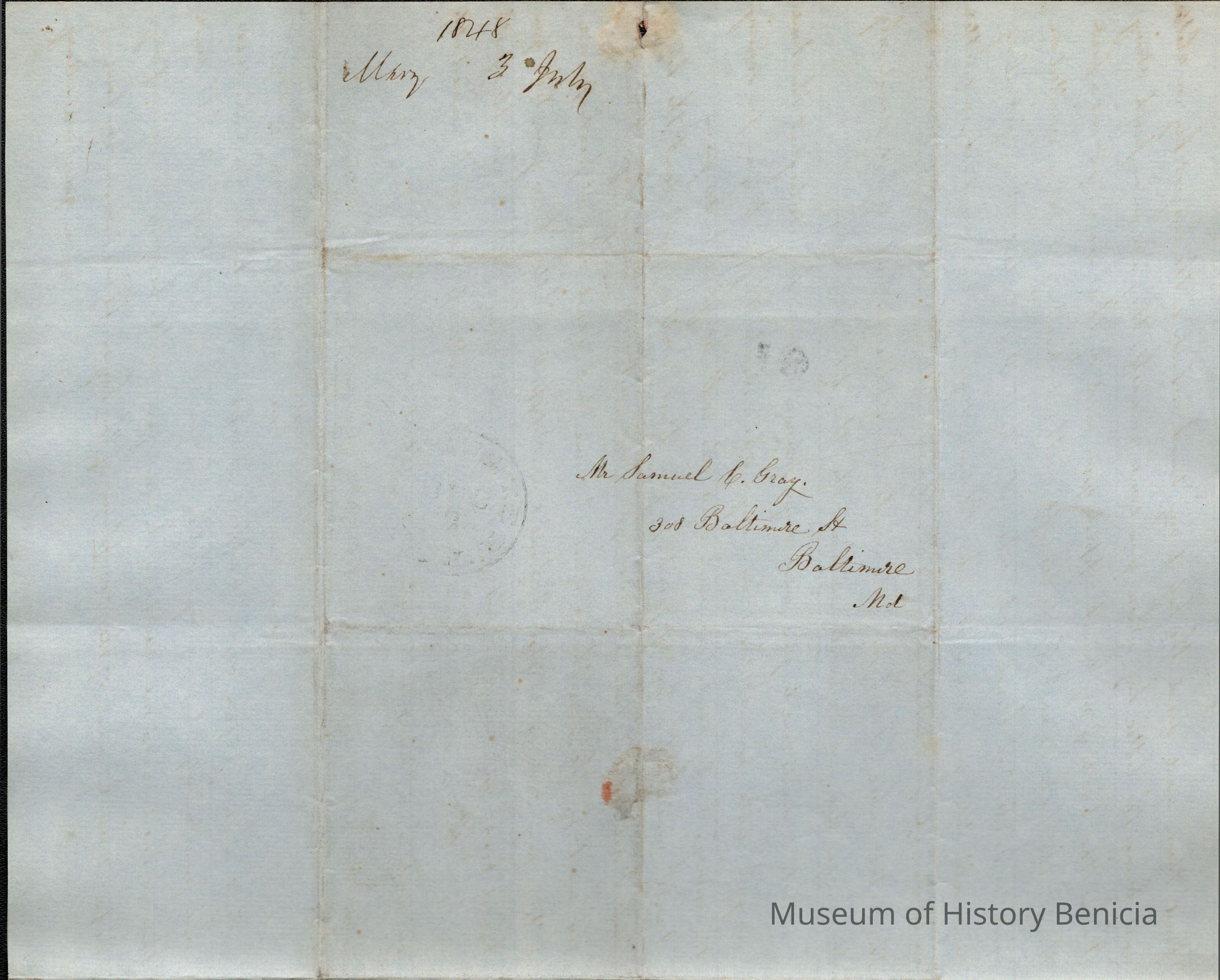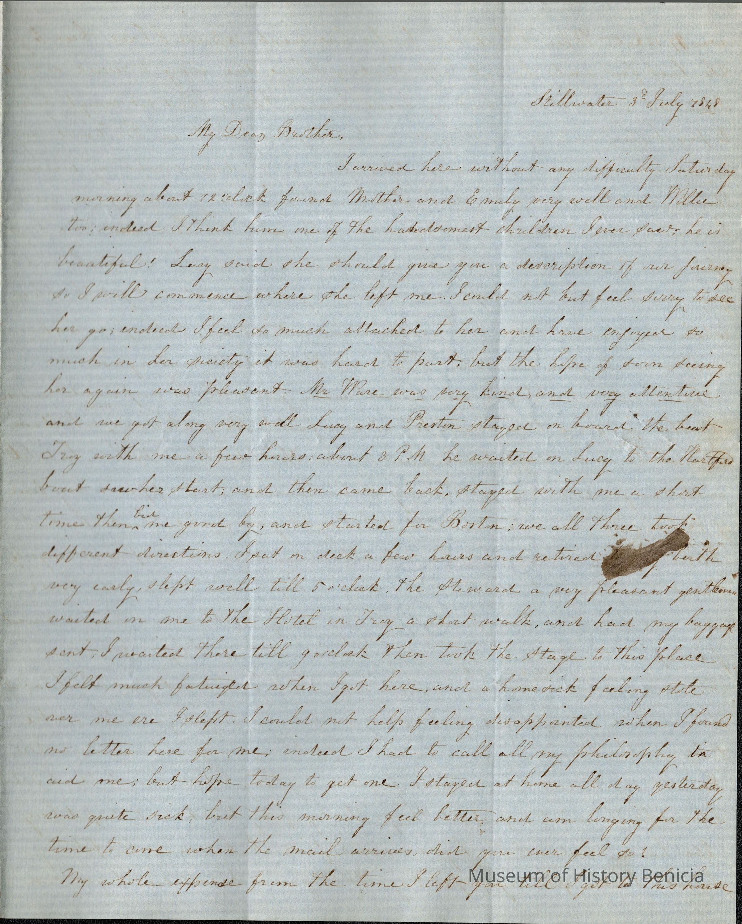 This is a letter dated 07/03/18487 from Samuel Gray's sister Mary Joanna Gray regarding family matters. She talks of her trip to see Samuel and Lucy in Baltimore, her arrival in Stillwater andf of their Mother's plans to marry William Evans. Much of the rest of the letter is about the keys to her trunk that she left in Baltimore and getting them to her.