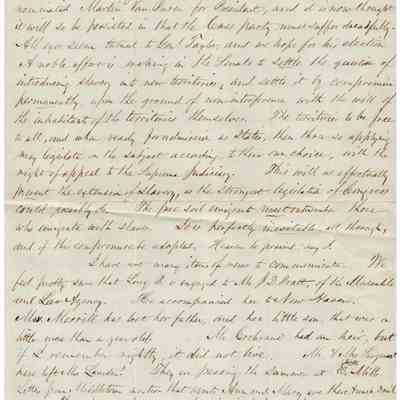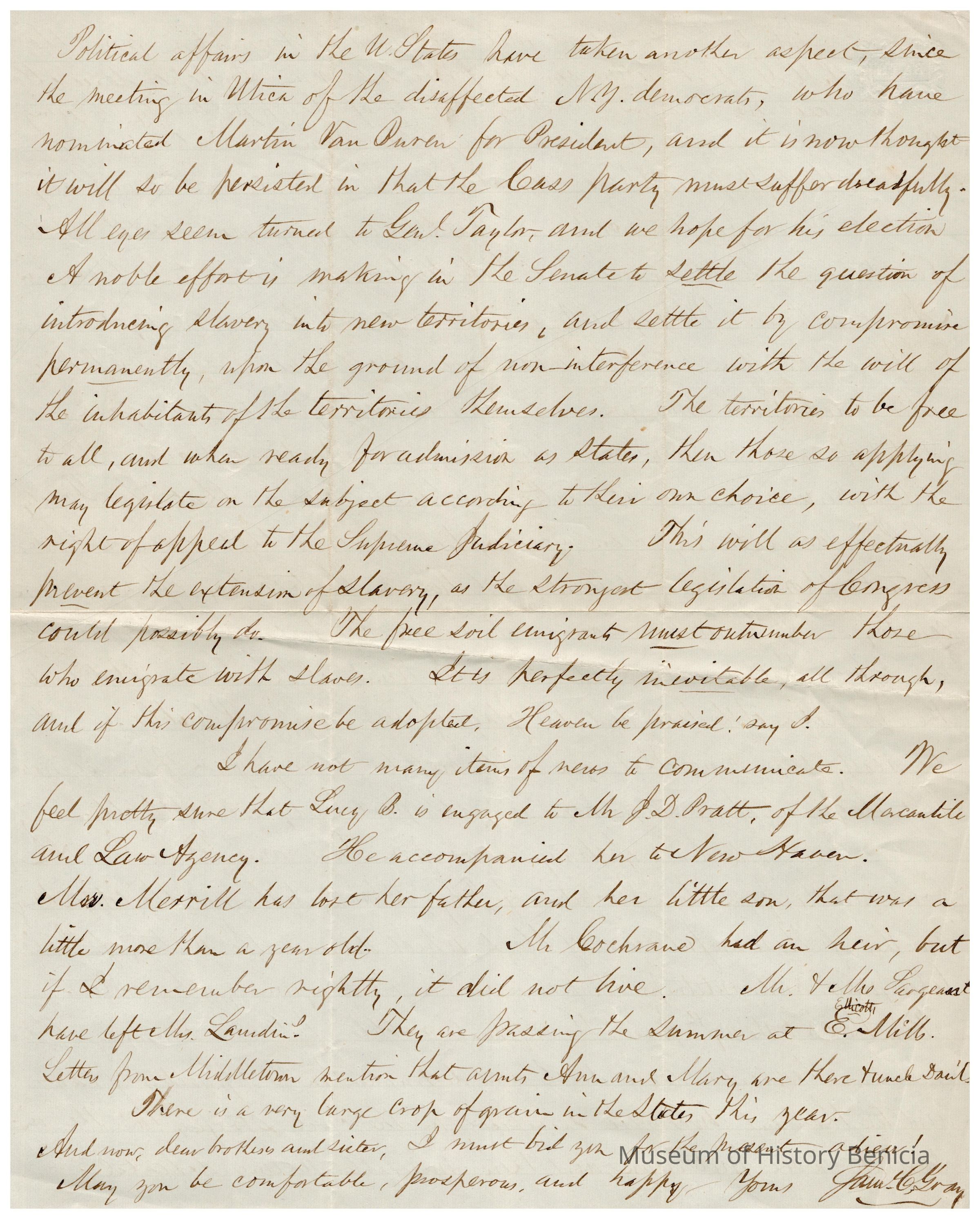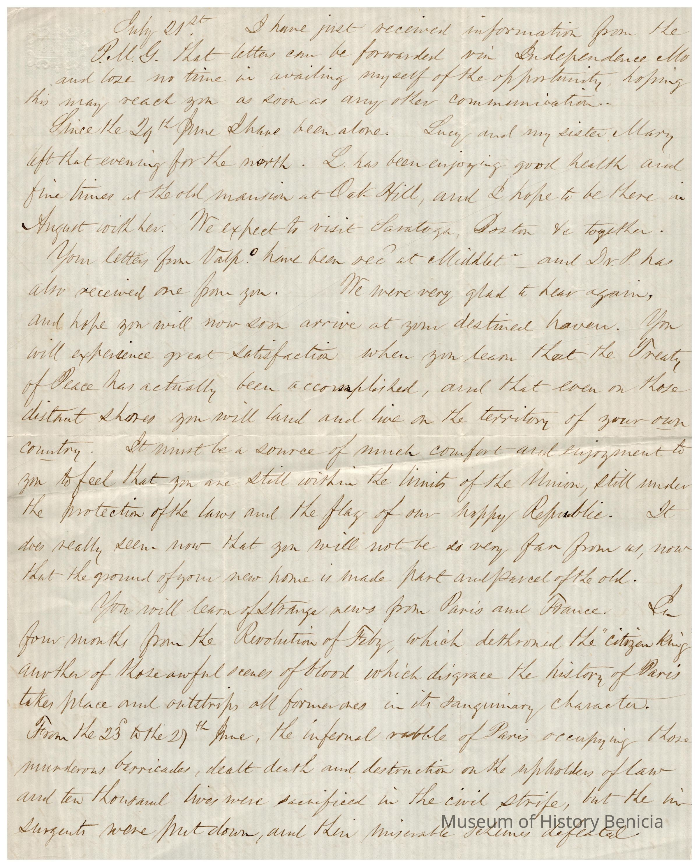 The letter talks of recent political events such as the June Days Uprising (06/22 - 26/1848), the Revolution of February (02/1848), the Treaty with Mexico and the U.S. (03/10/1848). Samuel mentions his wife Lucy who he married 12/19/1847 and the fact that the person receiving the letter will soon be in his "destined haven". All of this points to the letter being from July of 1848 and being written to Samuel's brother-in-law Chauncey Wetmore.