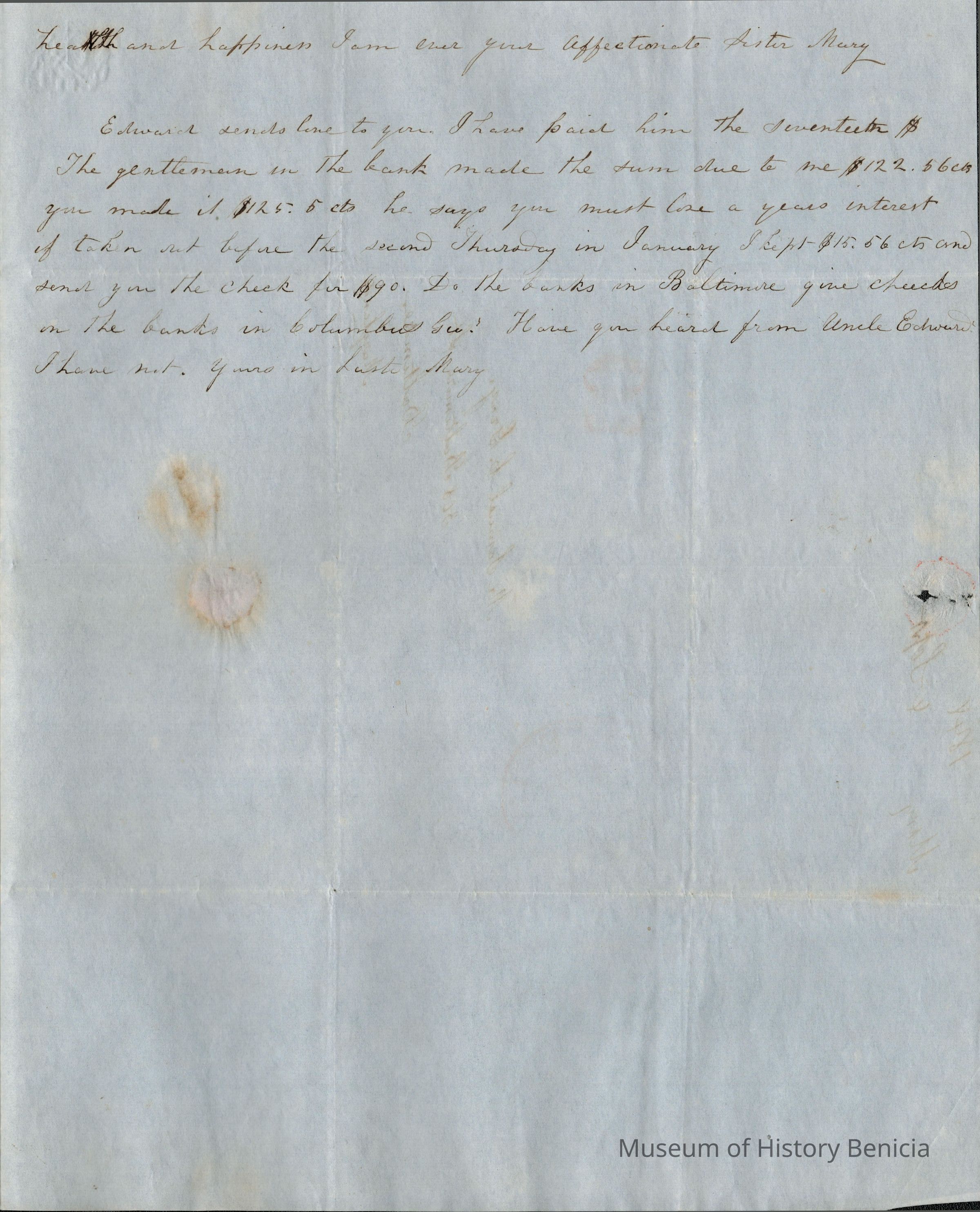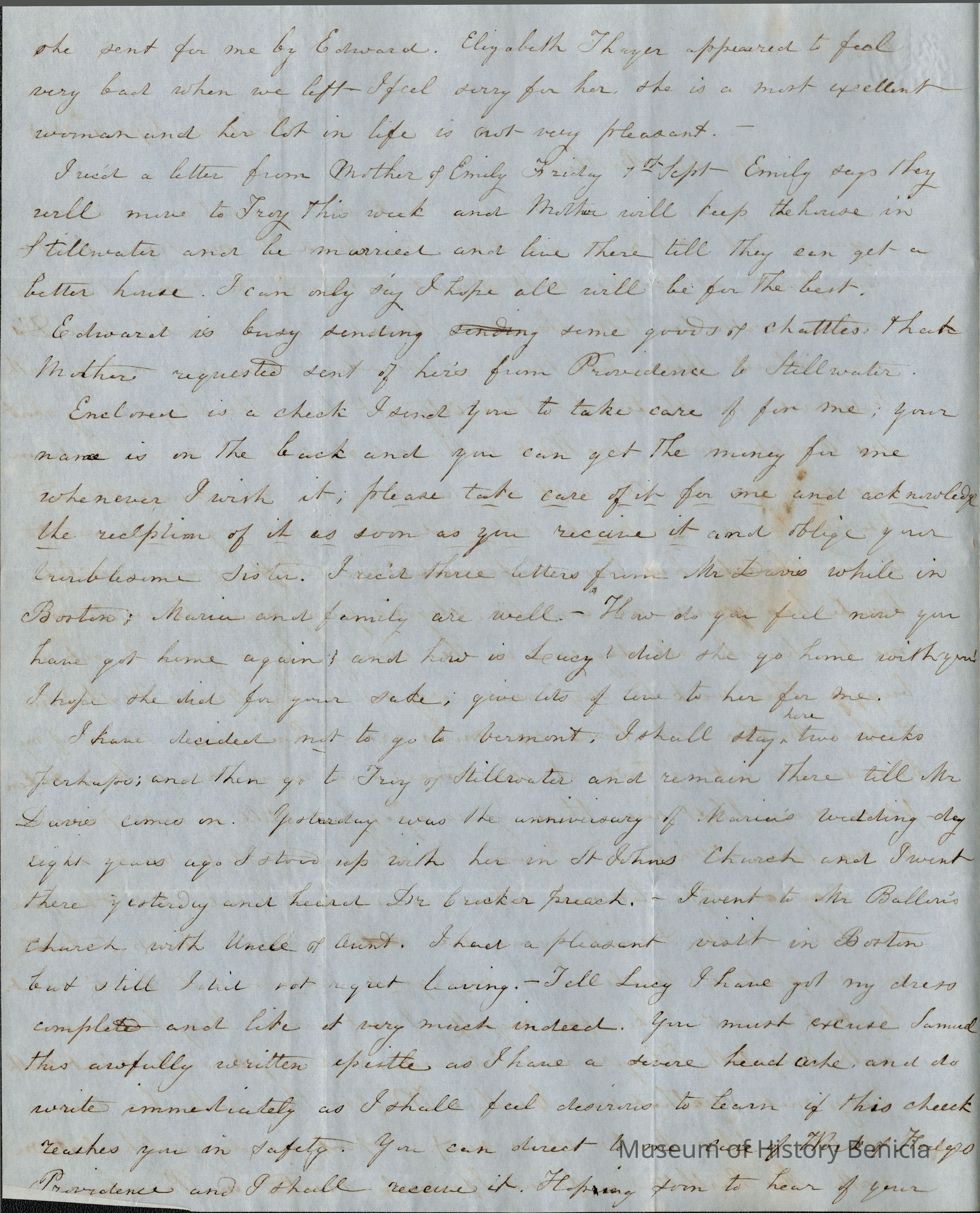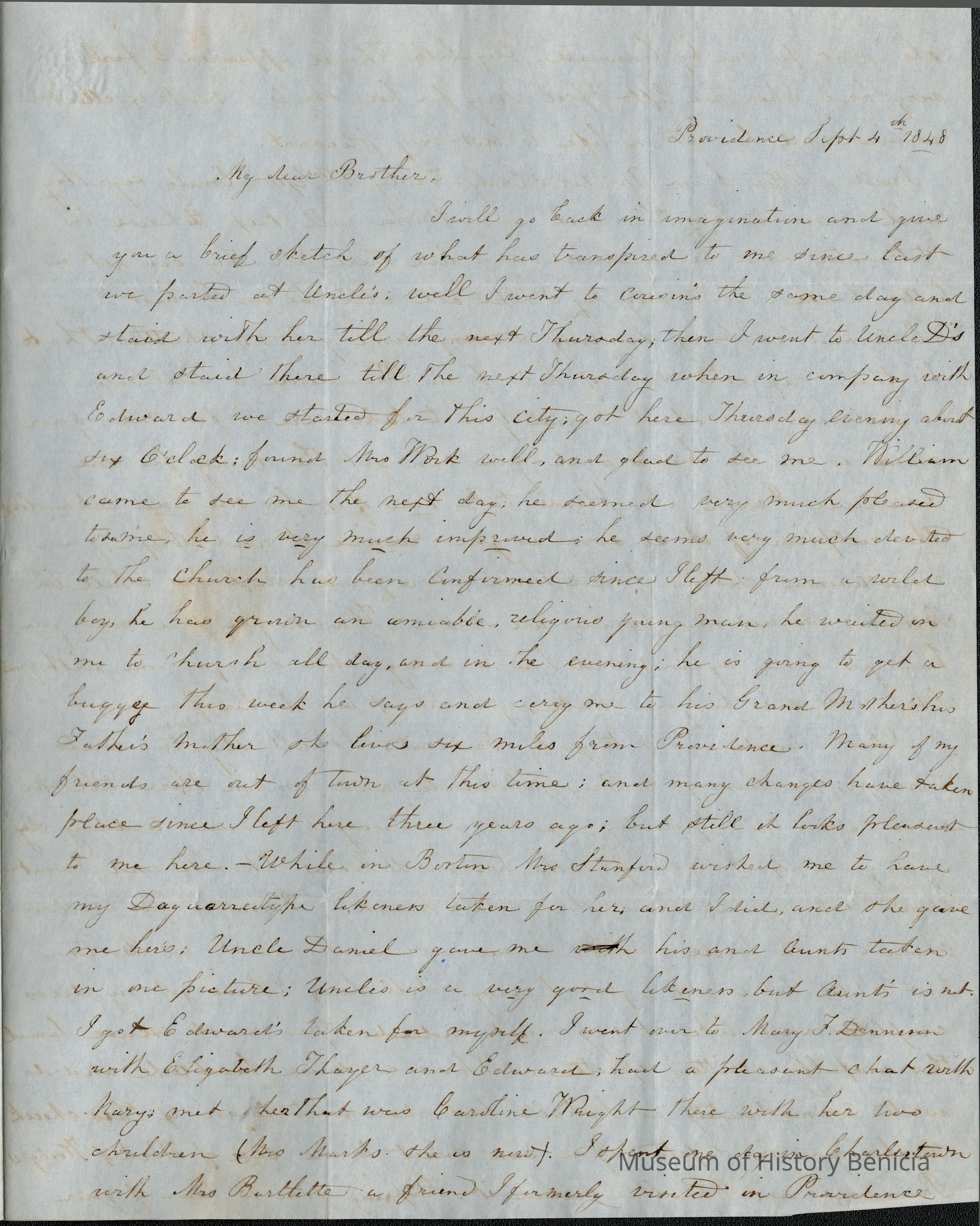 This is a letter dated 09/04/1848 from Samuel Gray's sister Mary Joanna regarding family matters. She recounts how she has been spending her time and the letters she has received. She does mention that she has seen their mother and the plans her mother is making for after her marriage to Mr. Evans.