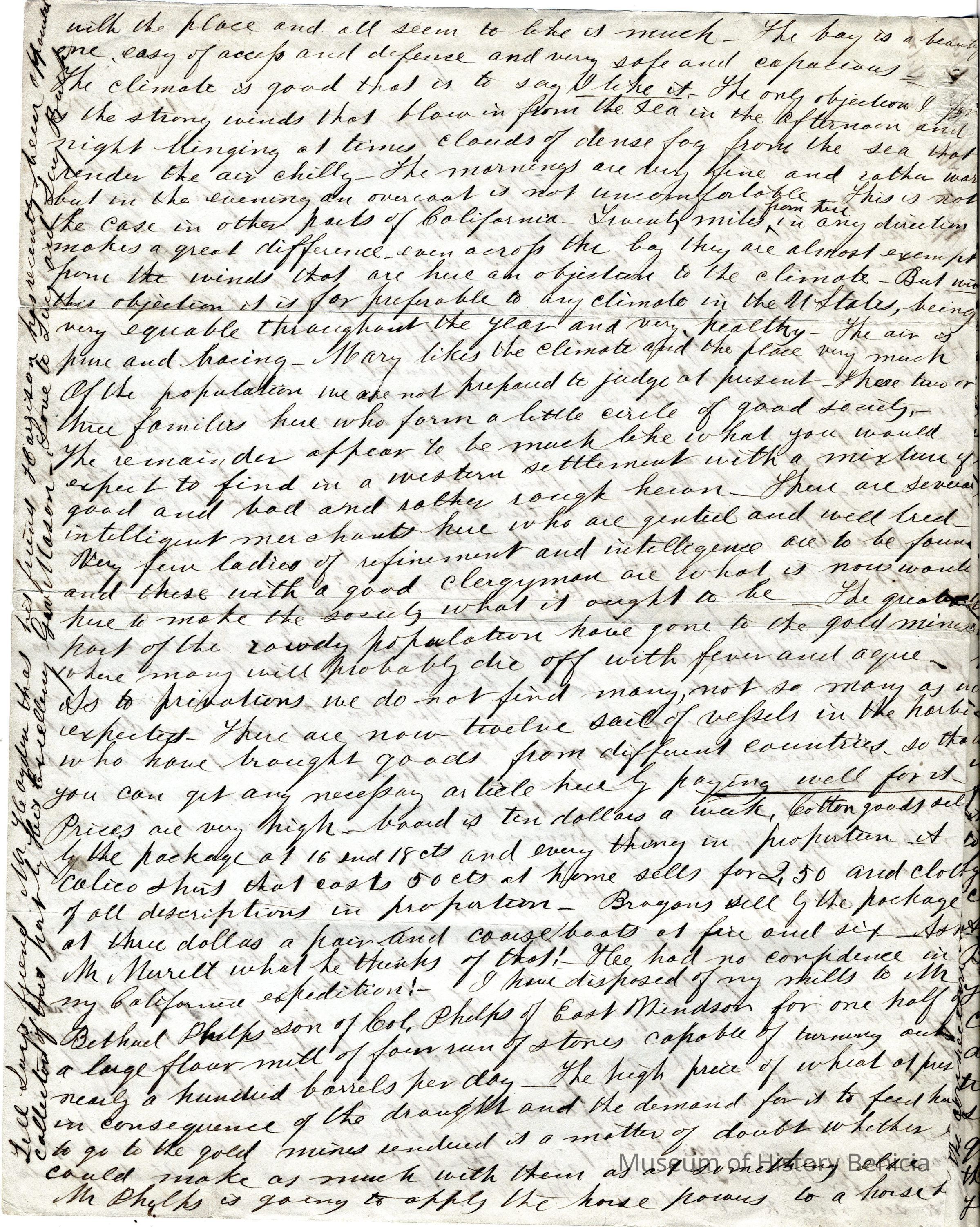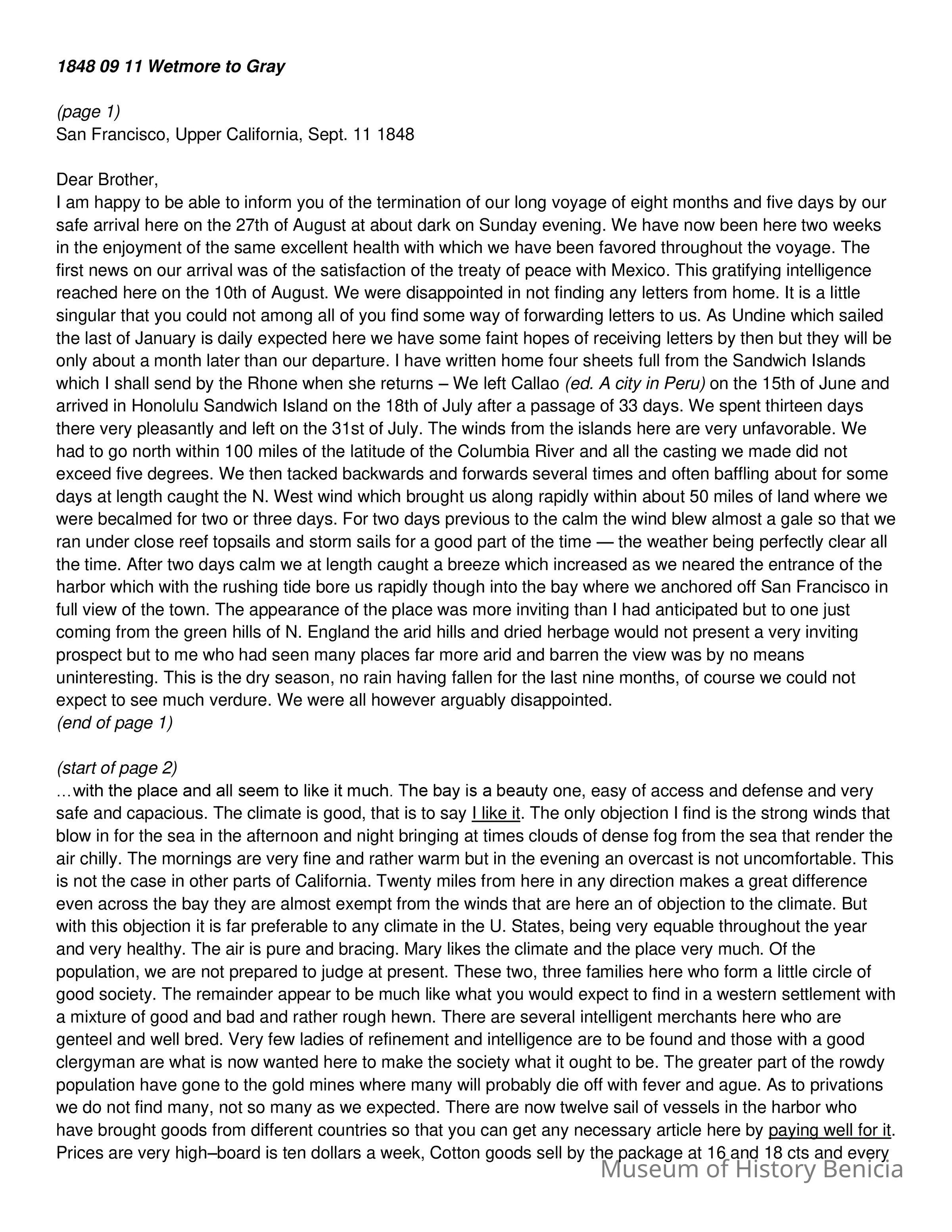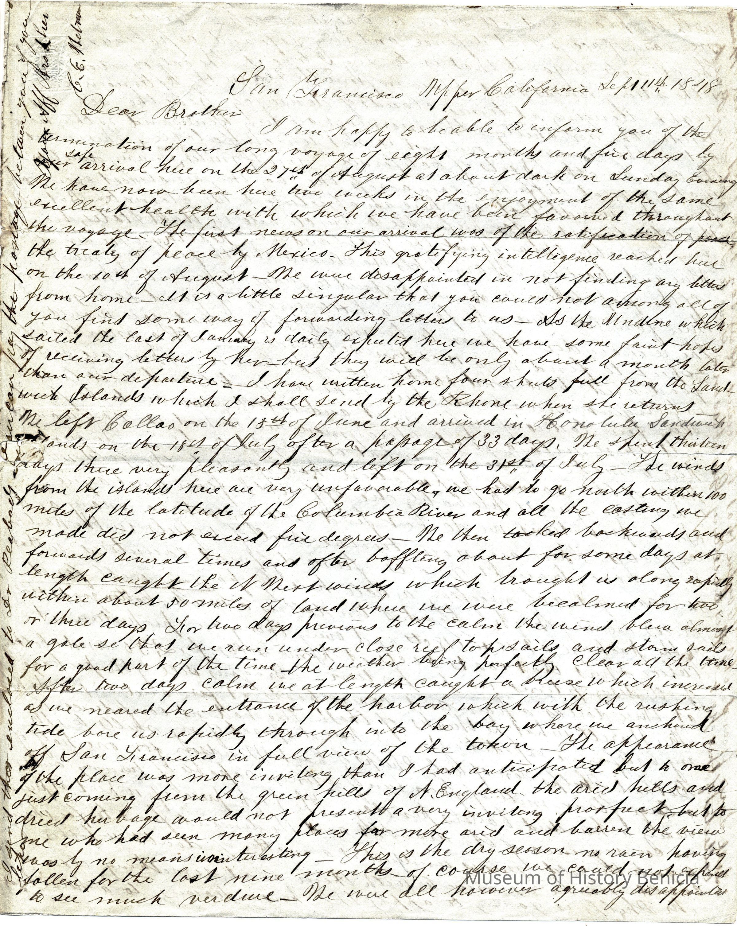The image shows a scanned letter dated September 11, 1848, from San Francisco, describing the end of an eight-month voyage. The writer expresses disappointment at not finding letters from home but mentions favorable weather and a treaty with Mexico. The letter details their journey via Honolulu and sailing past the Columbia River. It describes San Francisco's landscape, climate, and population, noting differences from other parts of California. The bay is praised for its beauty and the thriving community presence, although not many gold seekers