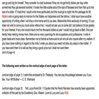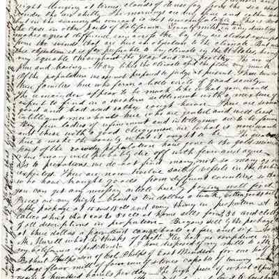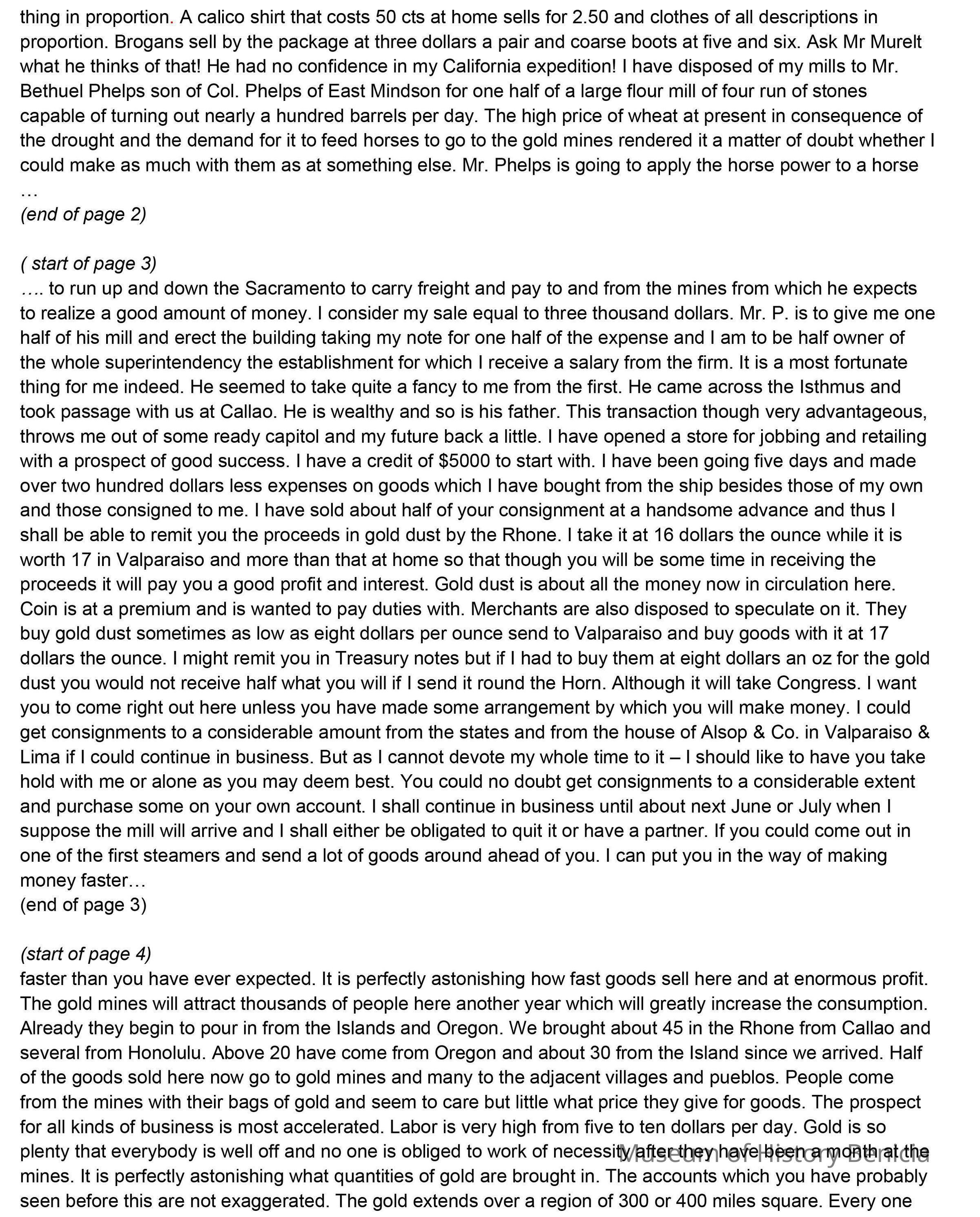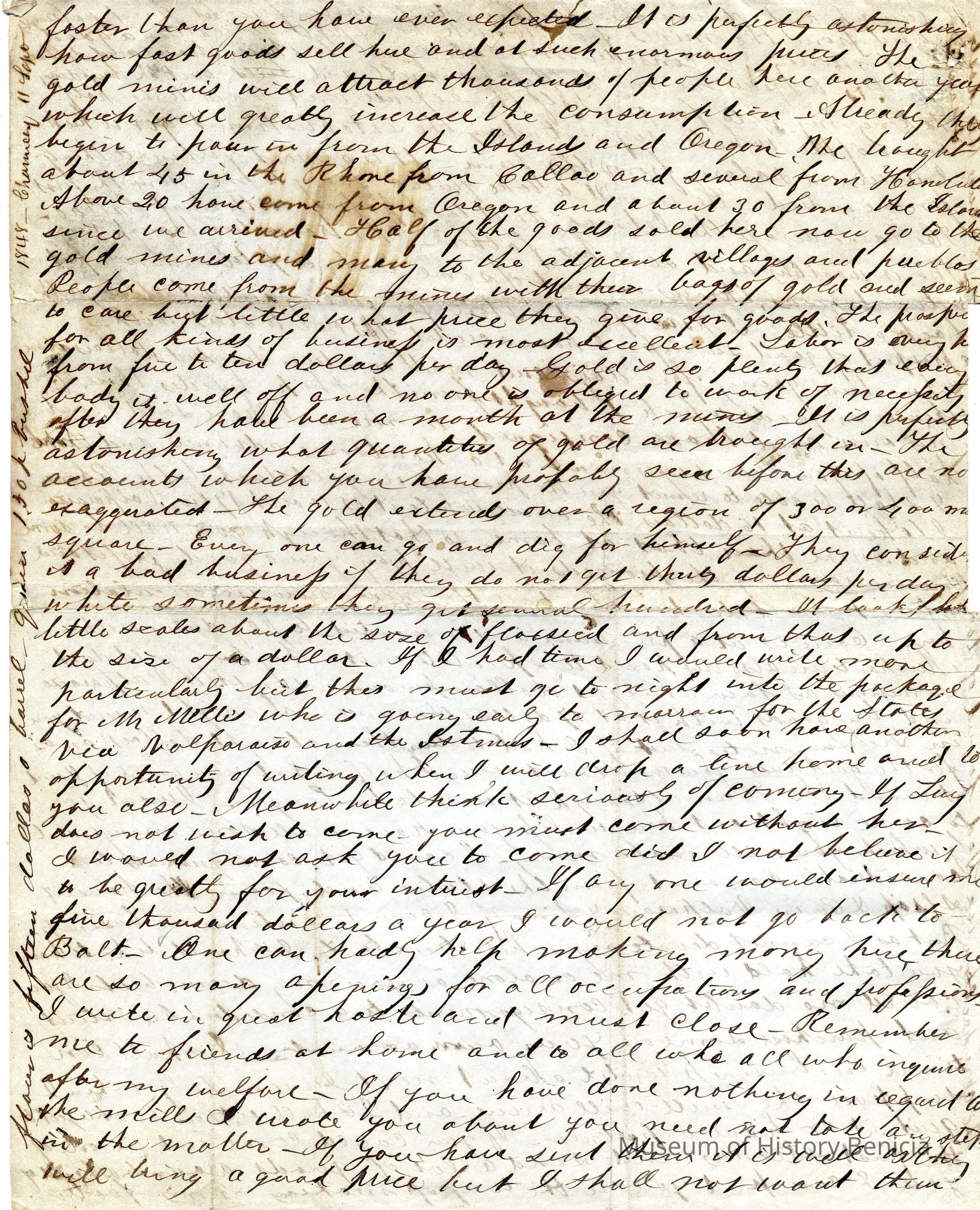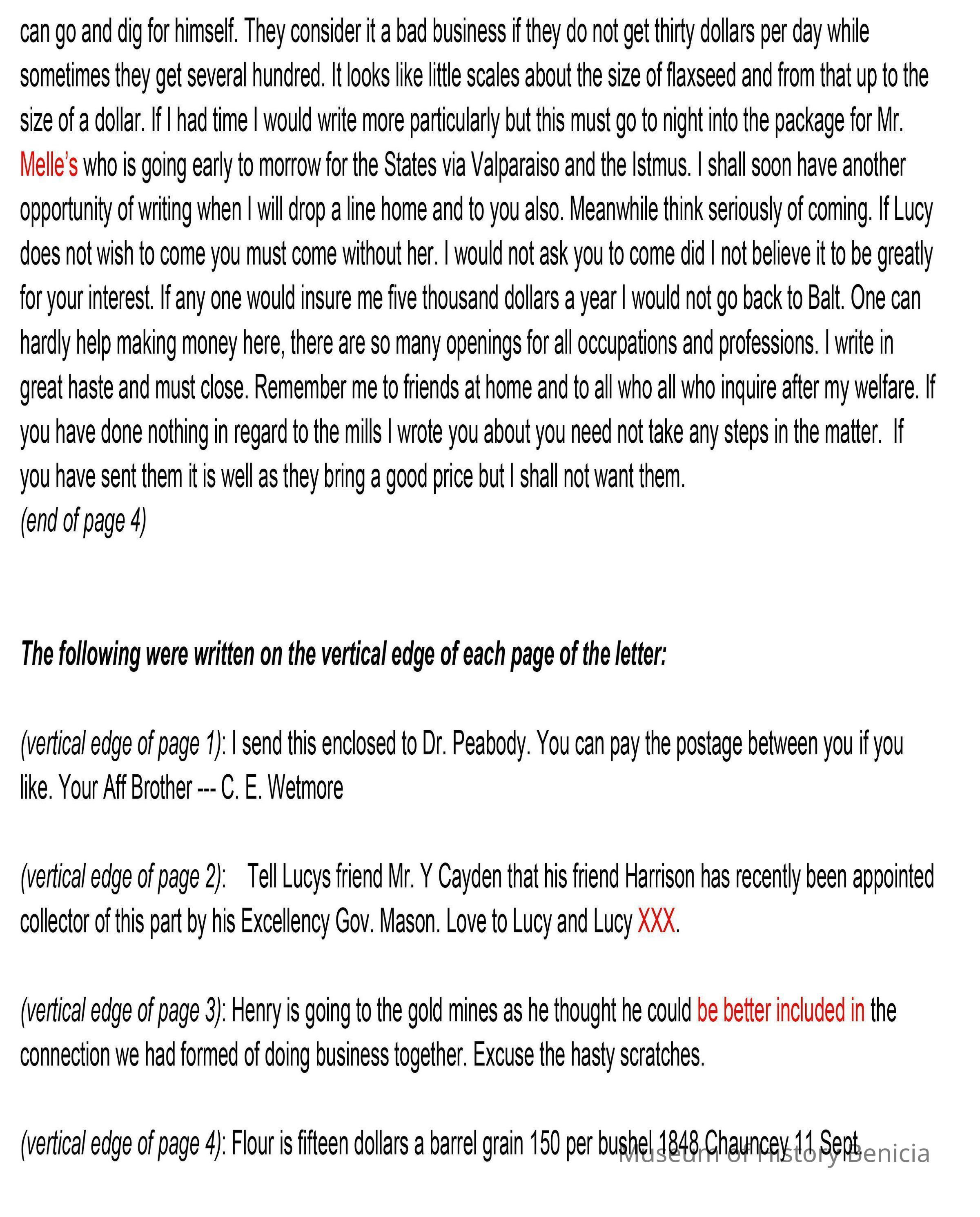 The image shows a scanned letter dated September 11, 1848, from San Francisco, describing the end of an eight-month voyage. The writer expresses disappointment at not finding letters from home but mentions favorable weather and a treaty with Mexico. The letter details their journey via Honolulu and sailing past the Columbia River. It describes San Francisco's landscape, climate, and population, noting differences from other parts of California. The bay is praised for its beauty and the thriving community presence, although not many gold seekers