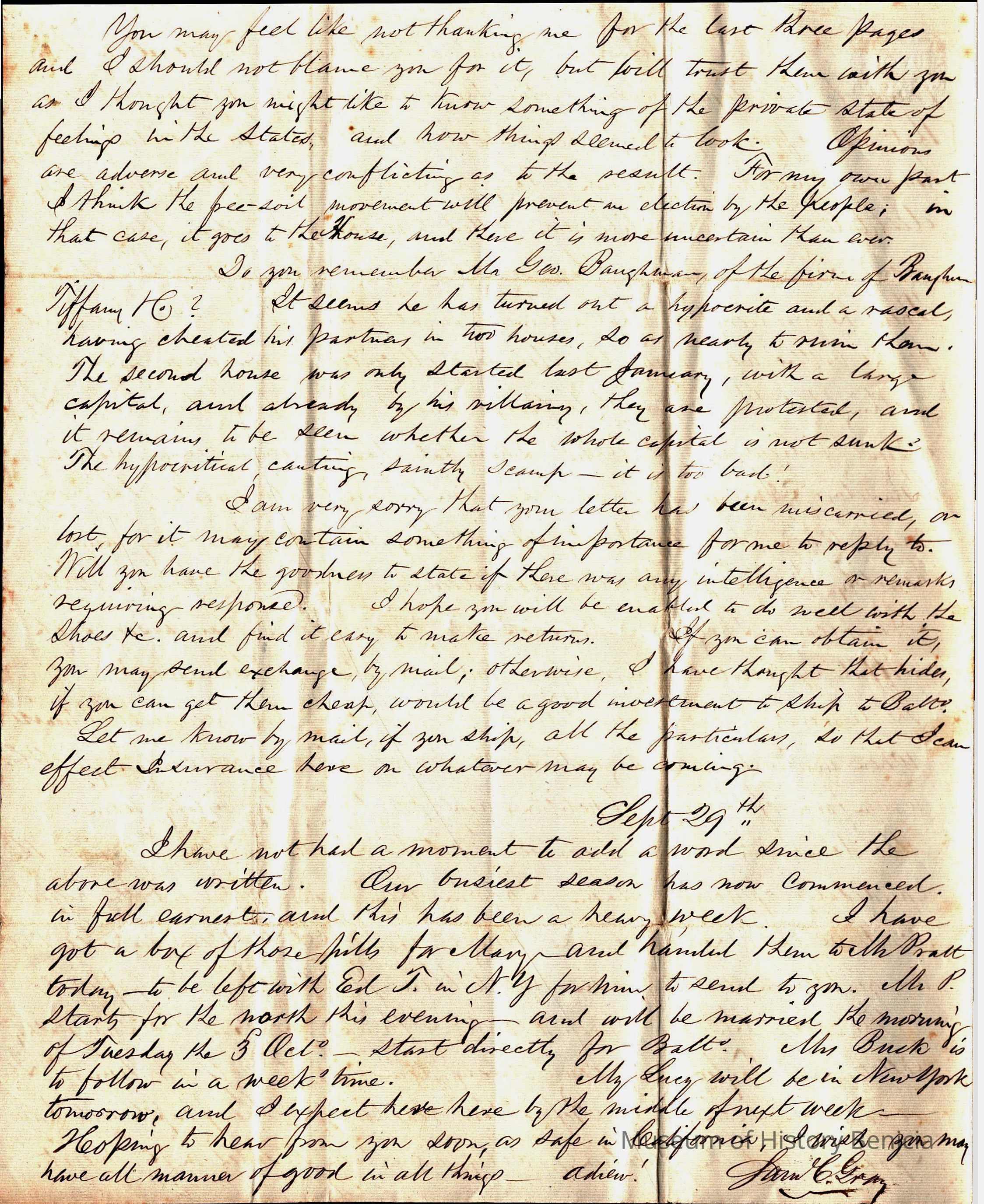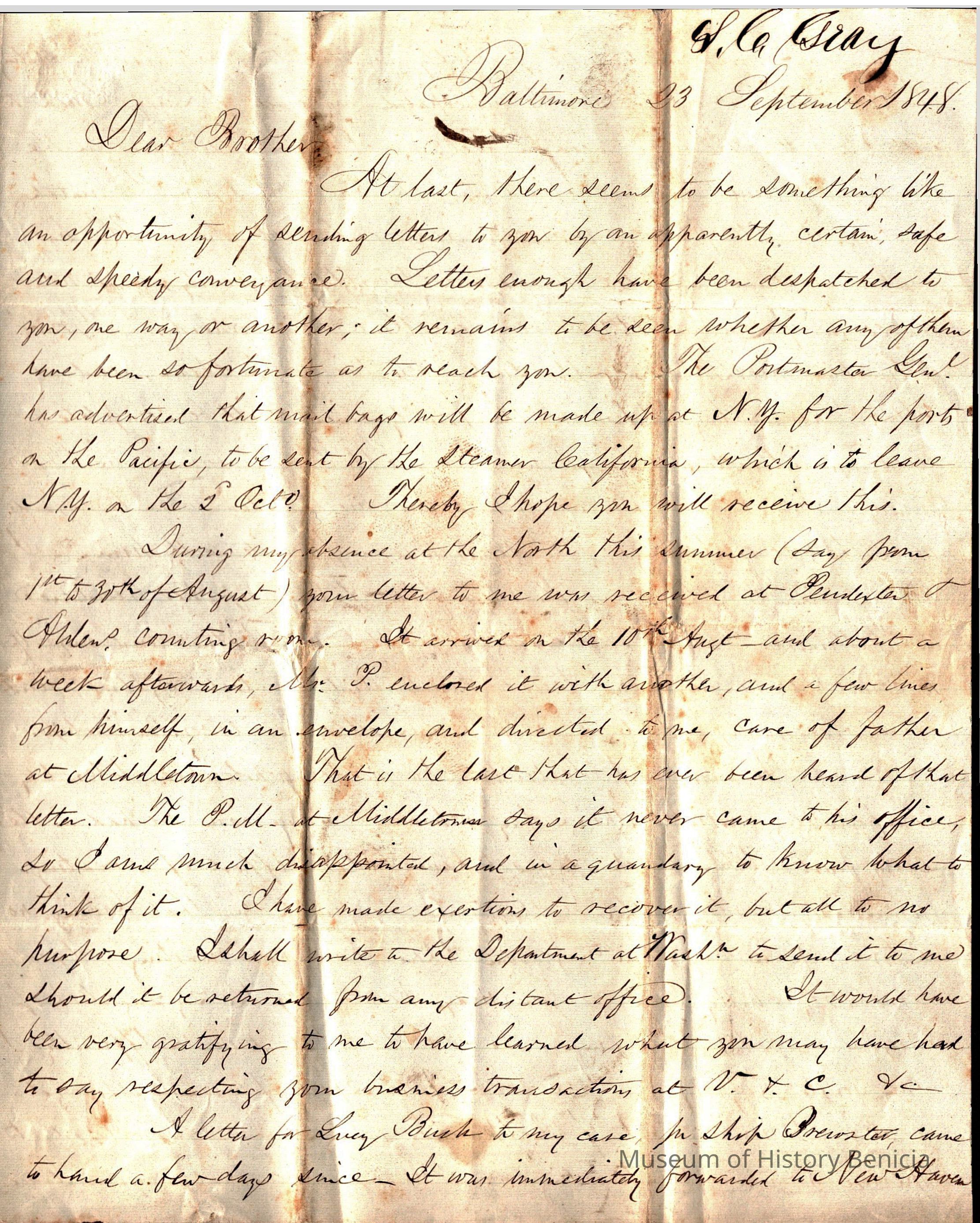 The image shows a handwritten letter from Samuel Gray to his brother, dated September 23, 1848, from Baltimore. The letter expresses relief at finding a safe and reliable opportunity to send correspondence to his brother. Samuel mentions previous unsuccessful attempts at communication and hopes this letter reaches its destination via a steamship. He recounts receiving a delayed letter in August during his time at the North, which arrived over a week late, causing disappointment and concern. Samuel plans to contact the Department for resolution and expresses interest in his brother’s business dealings. The letter is written in elegant cursive on aged paper, with noticeable wear and stains.