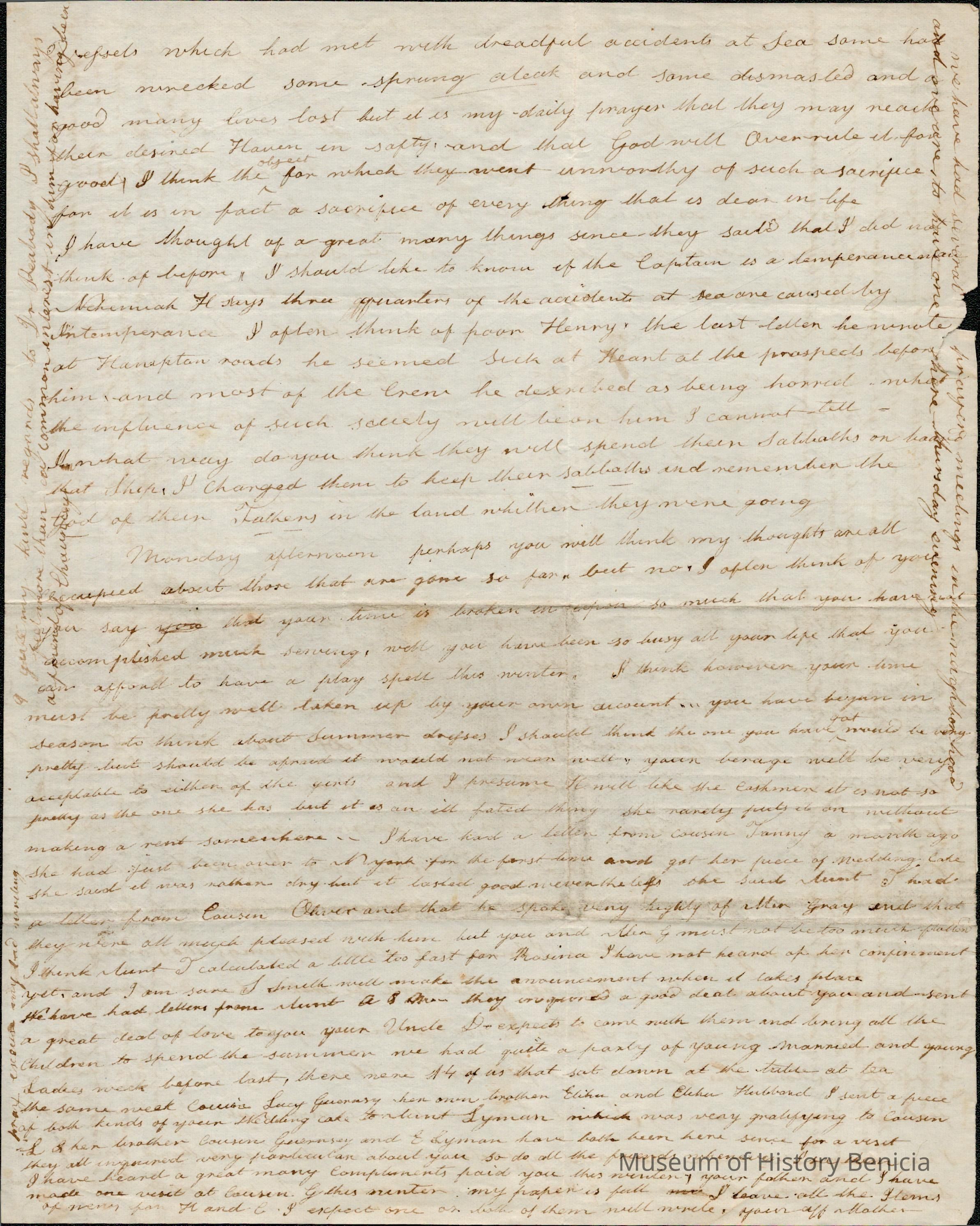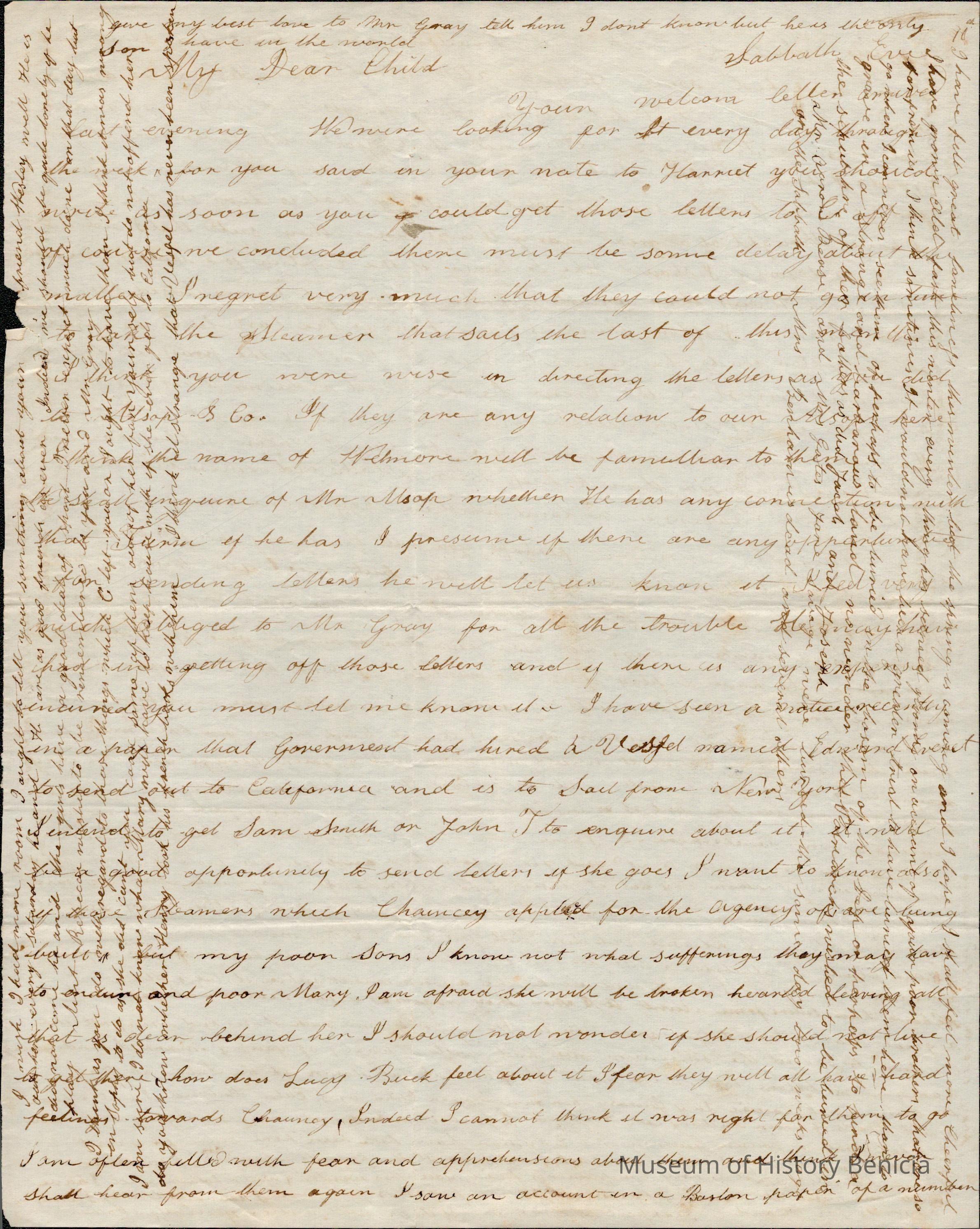 This is a letter undated to Lucy Gray from her mother Rebecca Wetmore regarding family matters. There is no date on the letter but it talks about Chauncy Wetmore and Mary on their way to California so must be 1848.